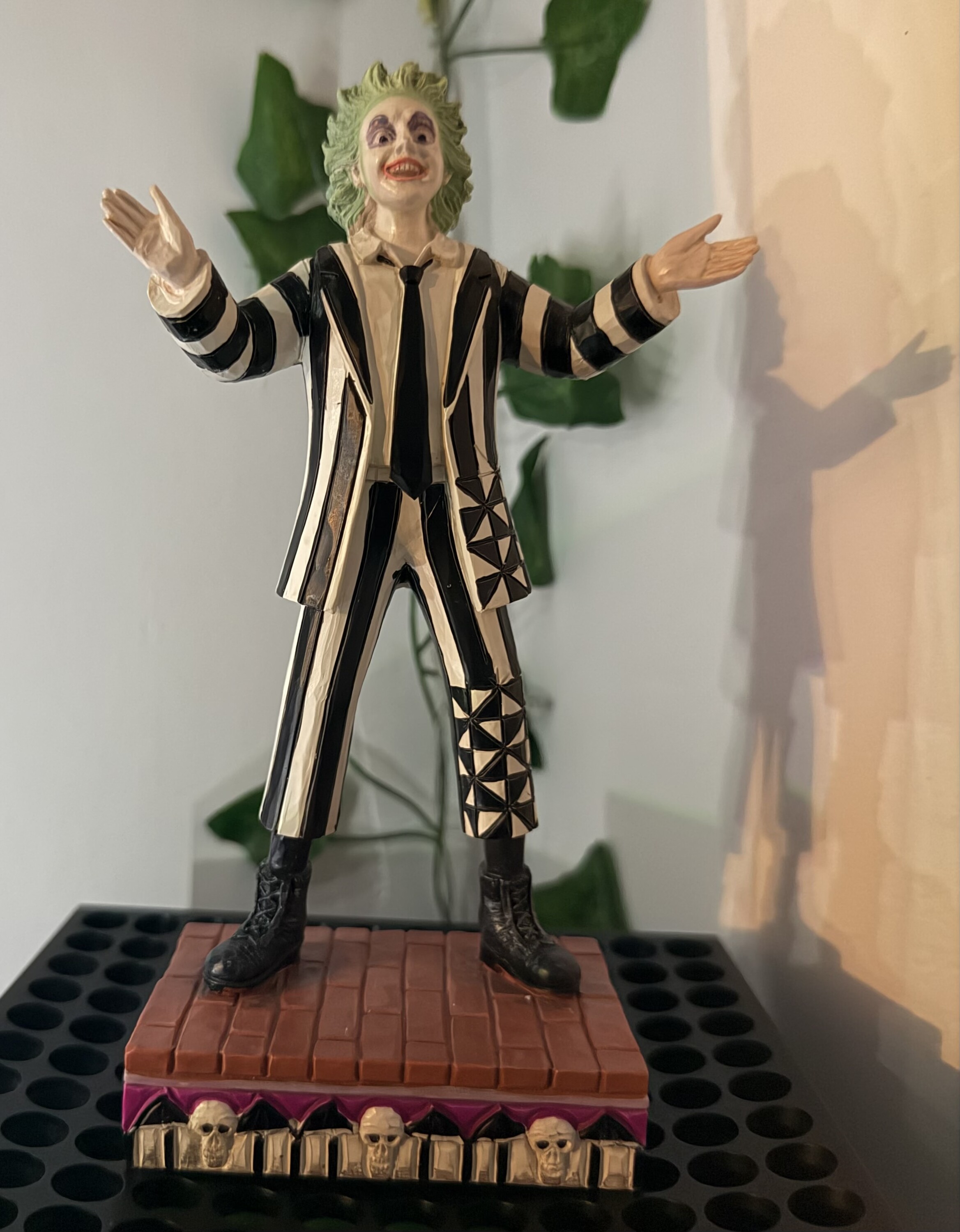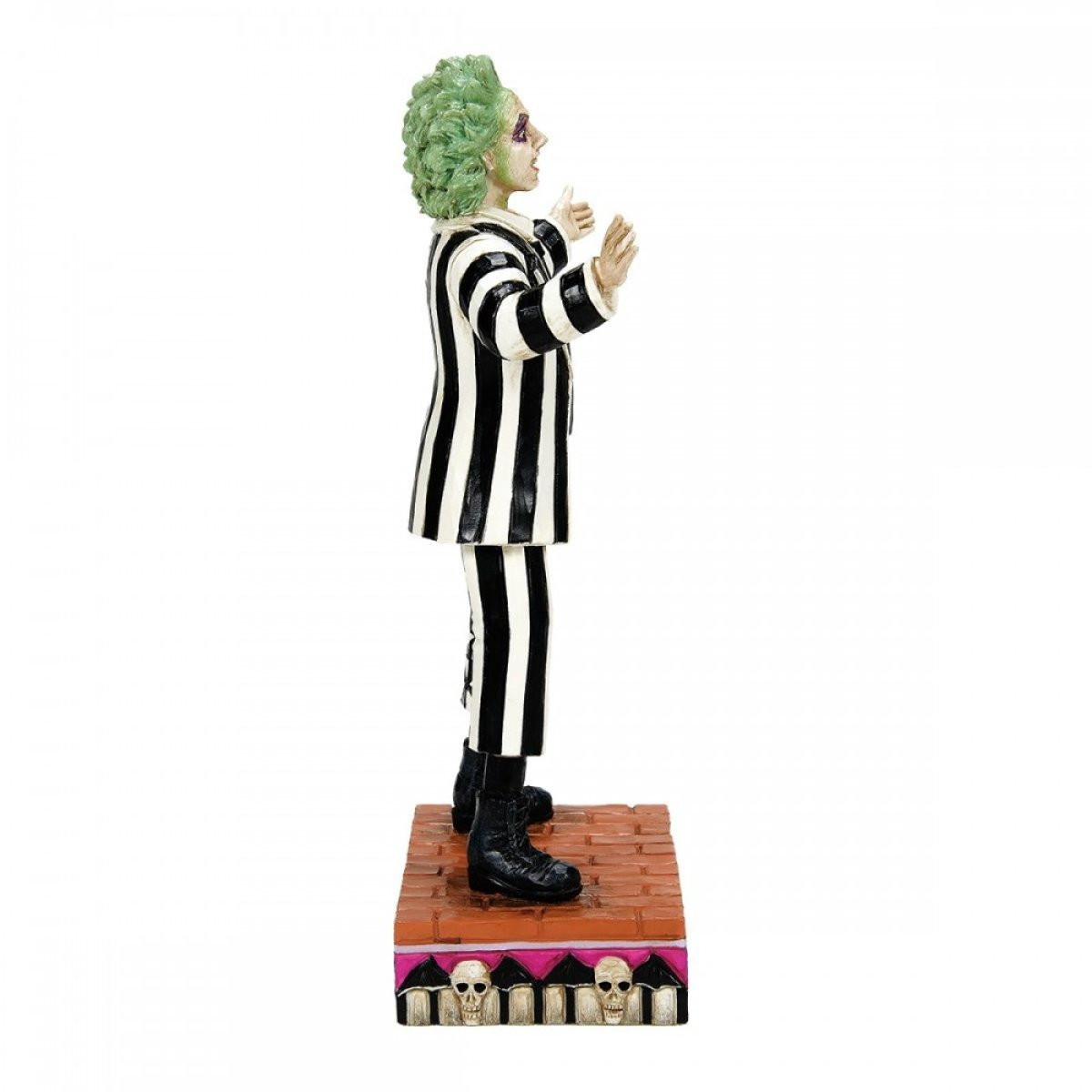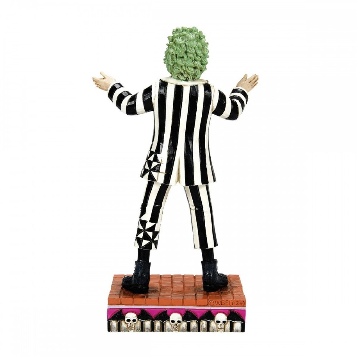 Figurine of the iconic bio-exorcist "Beetlejuice" from Tim Burton's 1988 film, imagined with the creativity of Jim Shore. Made from high-quality cast stone and hand-painted, this figurine depicts the main character in his costume, ready to get to work hunting the living. Designed by award-winning artist and sculptor Jim Shore for the Beetlejuice collection. These figures are not children's toys. Intended for adults only.