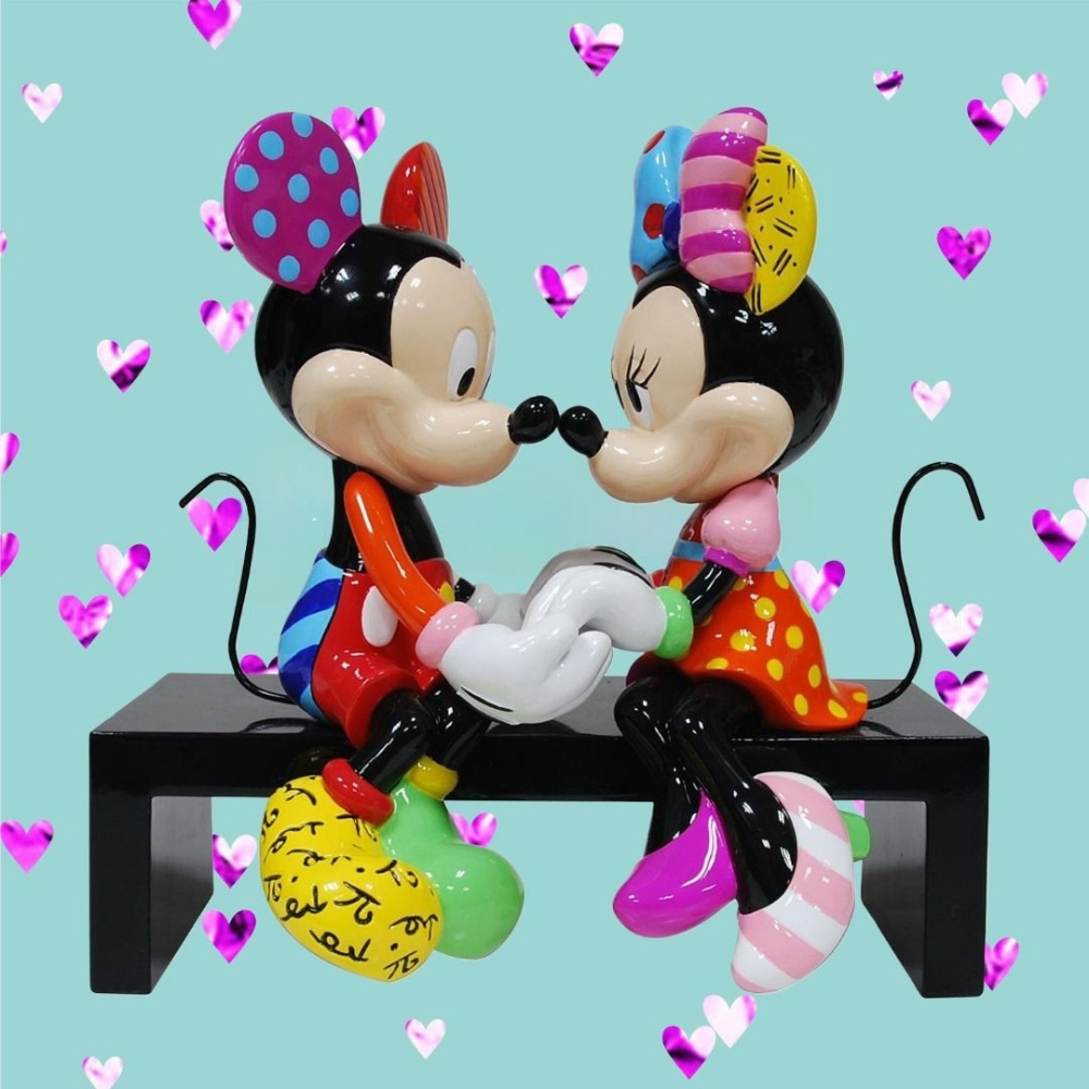 Designed by Pop artist Romero Britto, Mickey & Minnie share a sweet moment holding hands seated on a park bench. This loving tribute to Disney's most beloved couple is vibrantly adorned by Britto's iconic and bold patterns and colors making it a one of a.