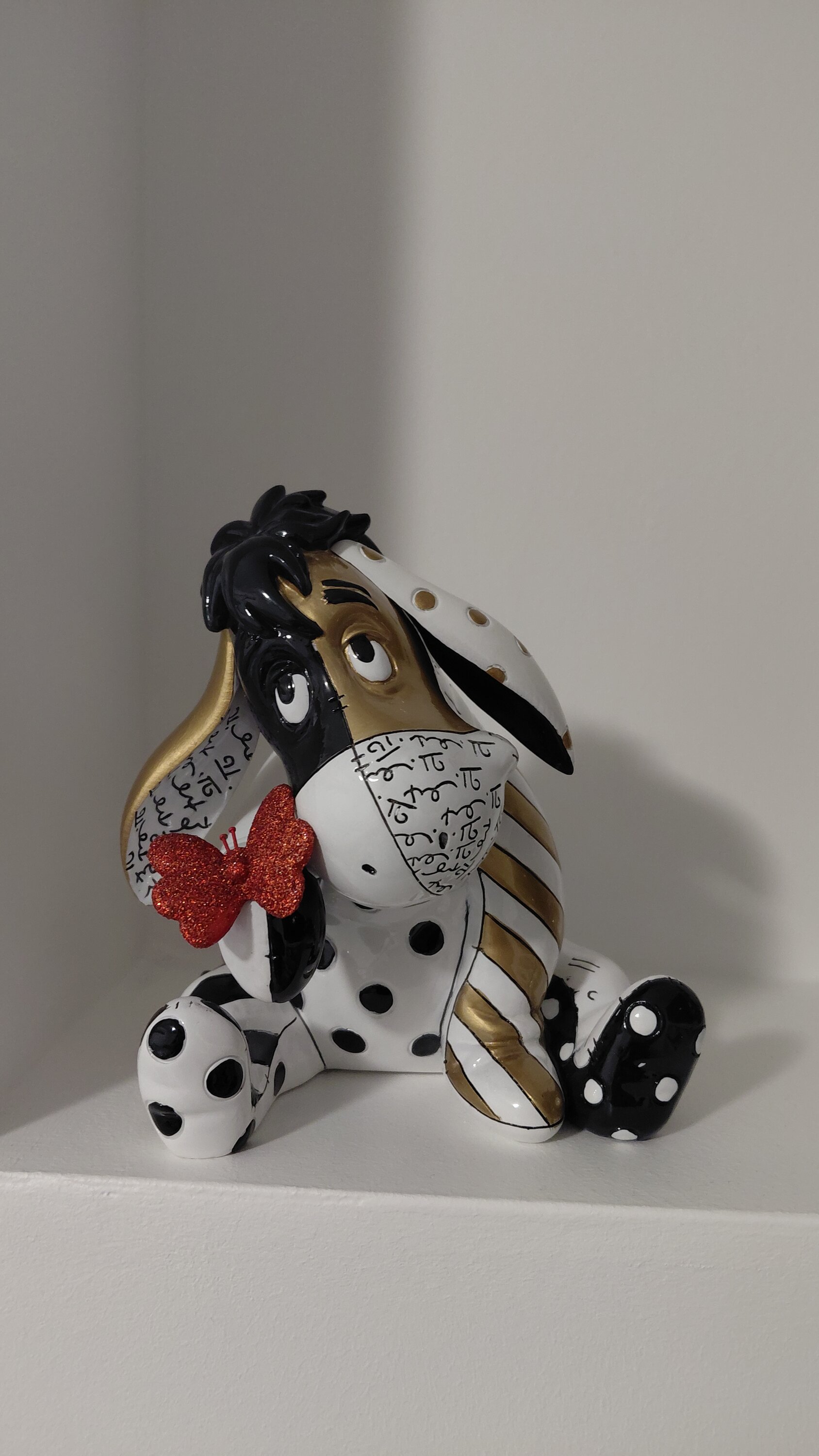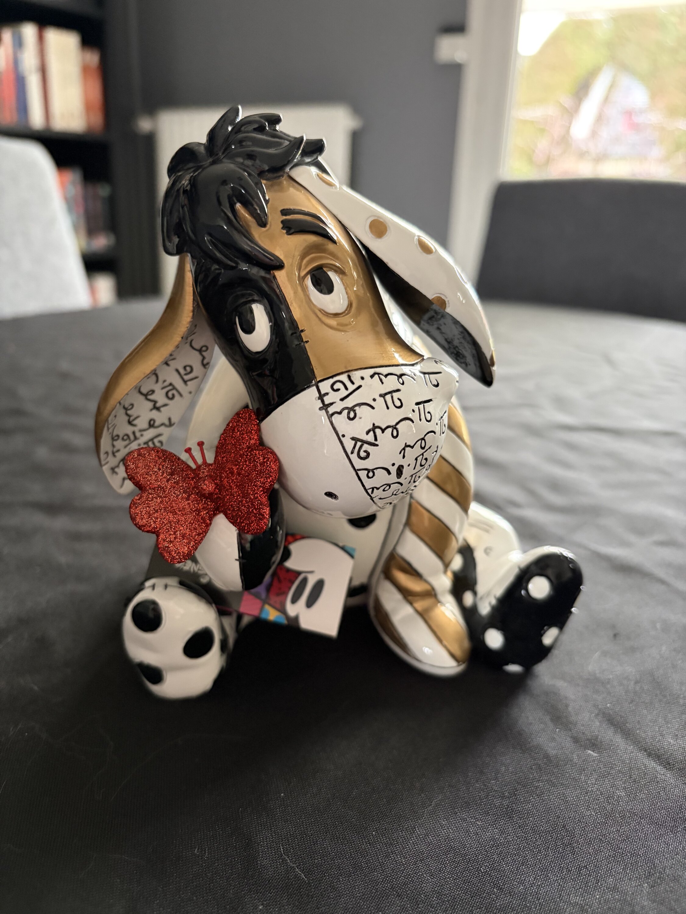 In honor of Winnie the Pooh's 100 year anniversary, Eeyore gets the Midas Touch treatment from pop artist Romero Britto in this new sculpture featuring your favorite donkey in rich gold, bold black, ruby red and glossy white. Limited availability.