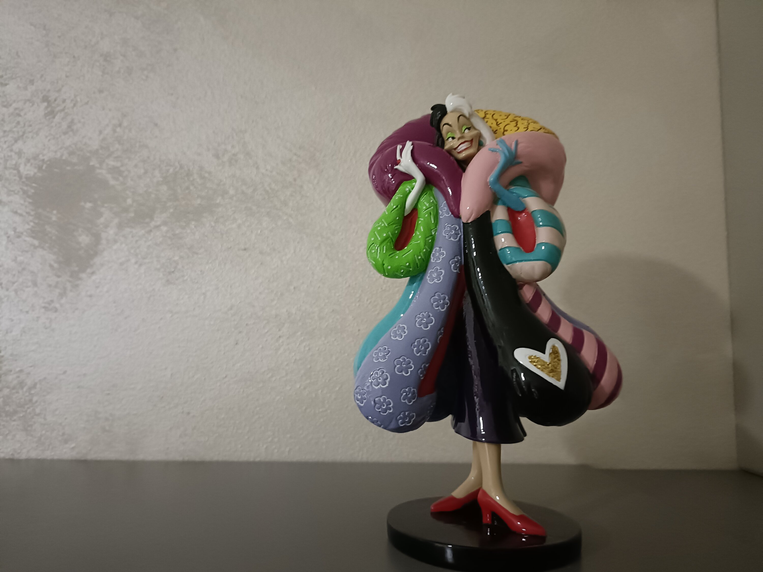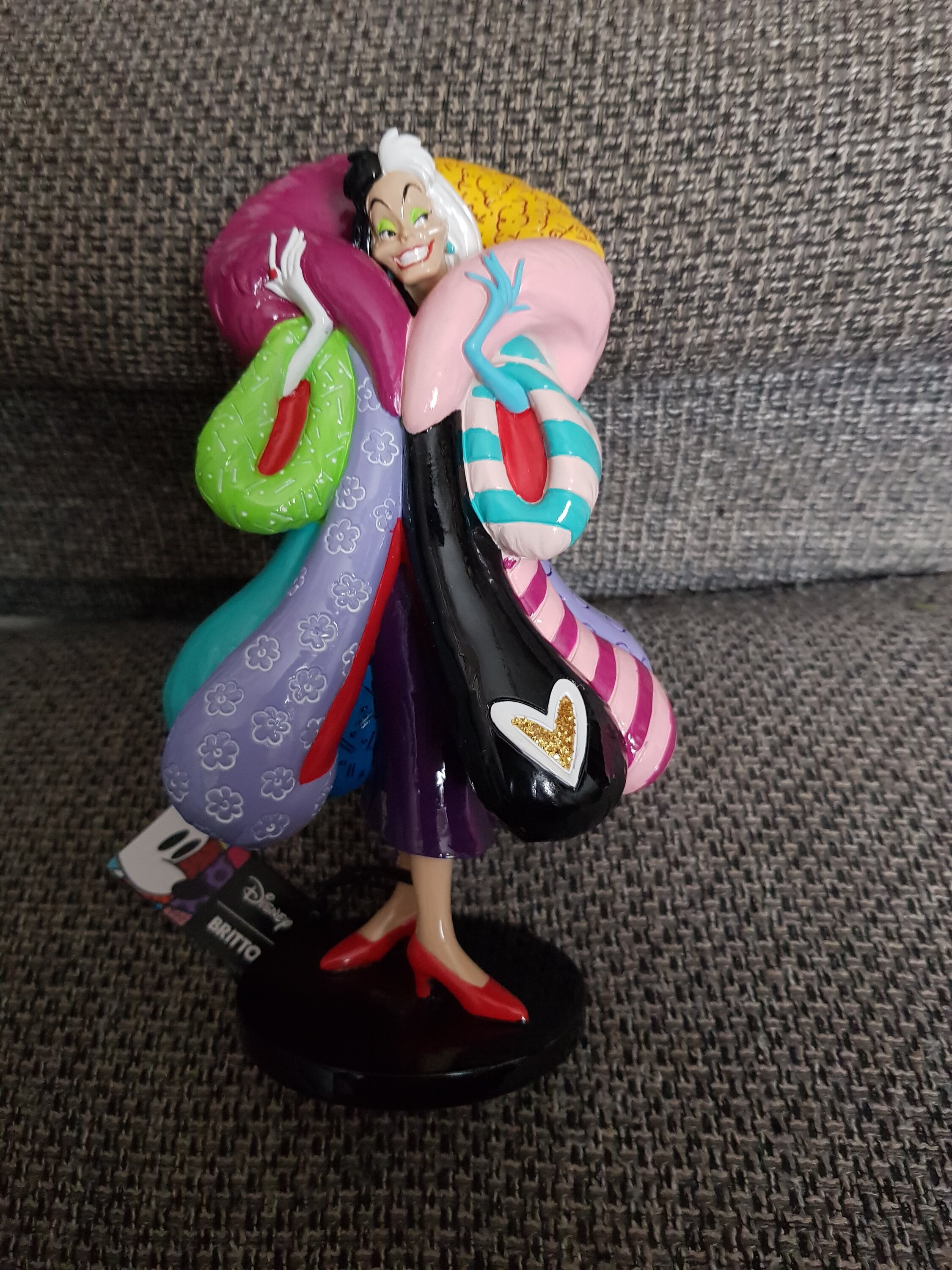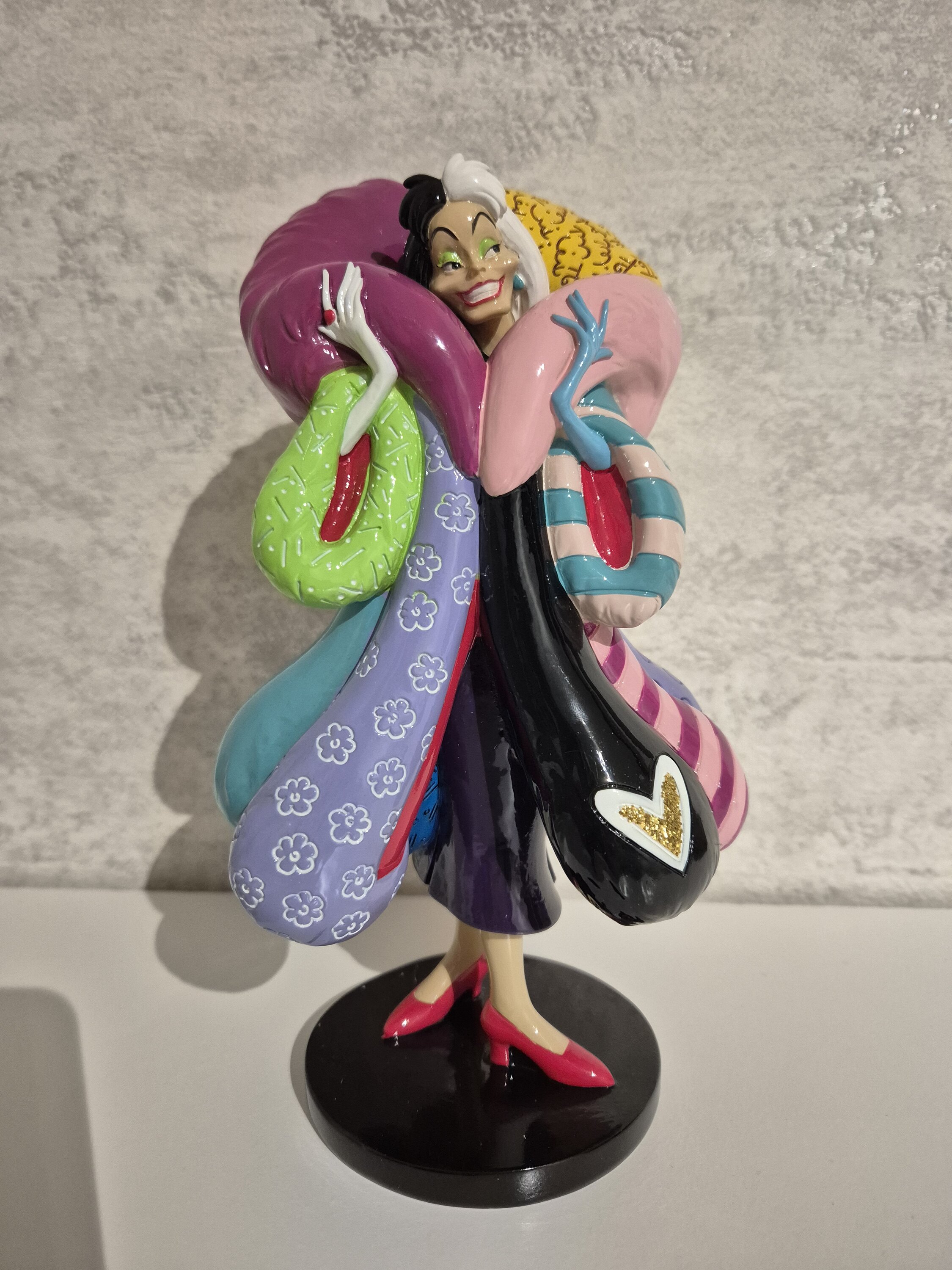 Bold and iconic, Cruella de Vil receives a vibrant pop-art reinterpretation through the unmistakable style of artist Romero Britto. Bursting with bright colors and contrasting graphic patterns, this figurine perfectly captures her extravagant personality and confident attitude. A striking decorative piece that brings a modern artistic twist to a classic Disney villain.