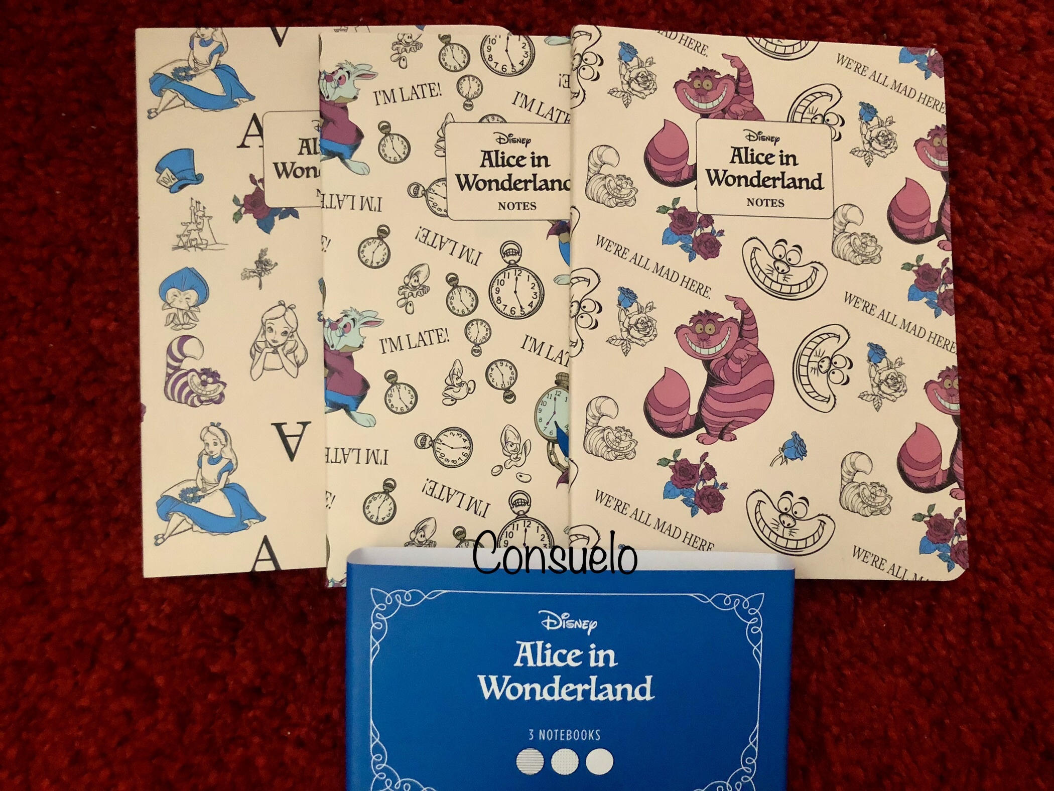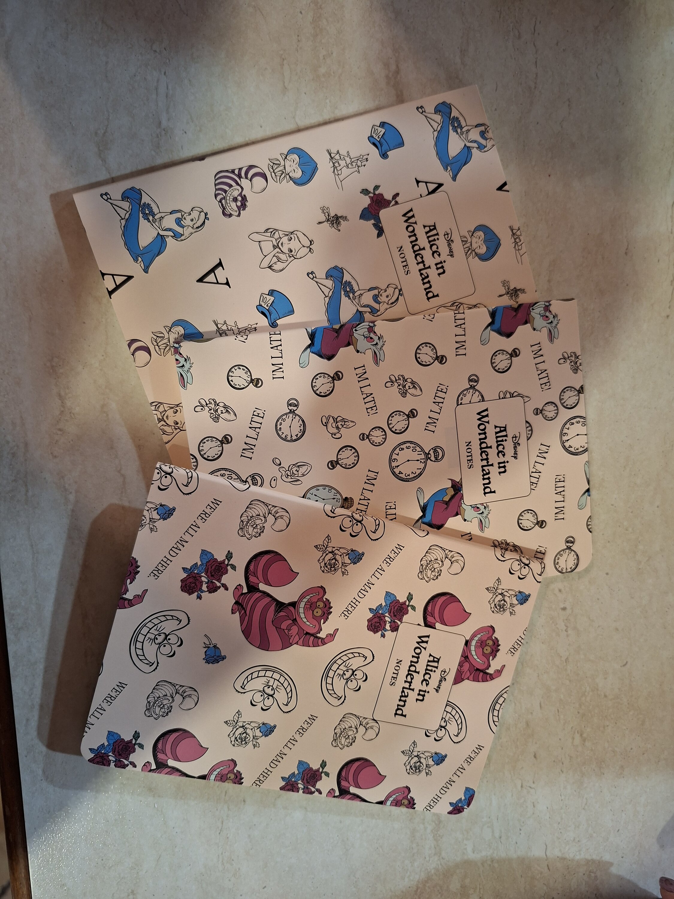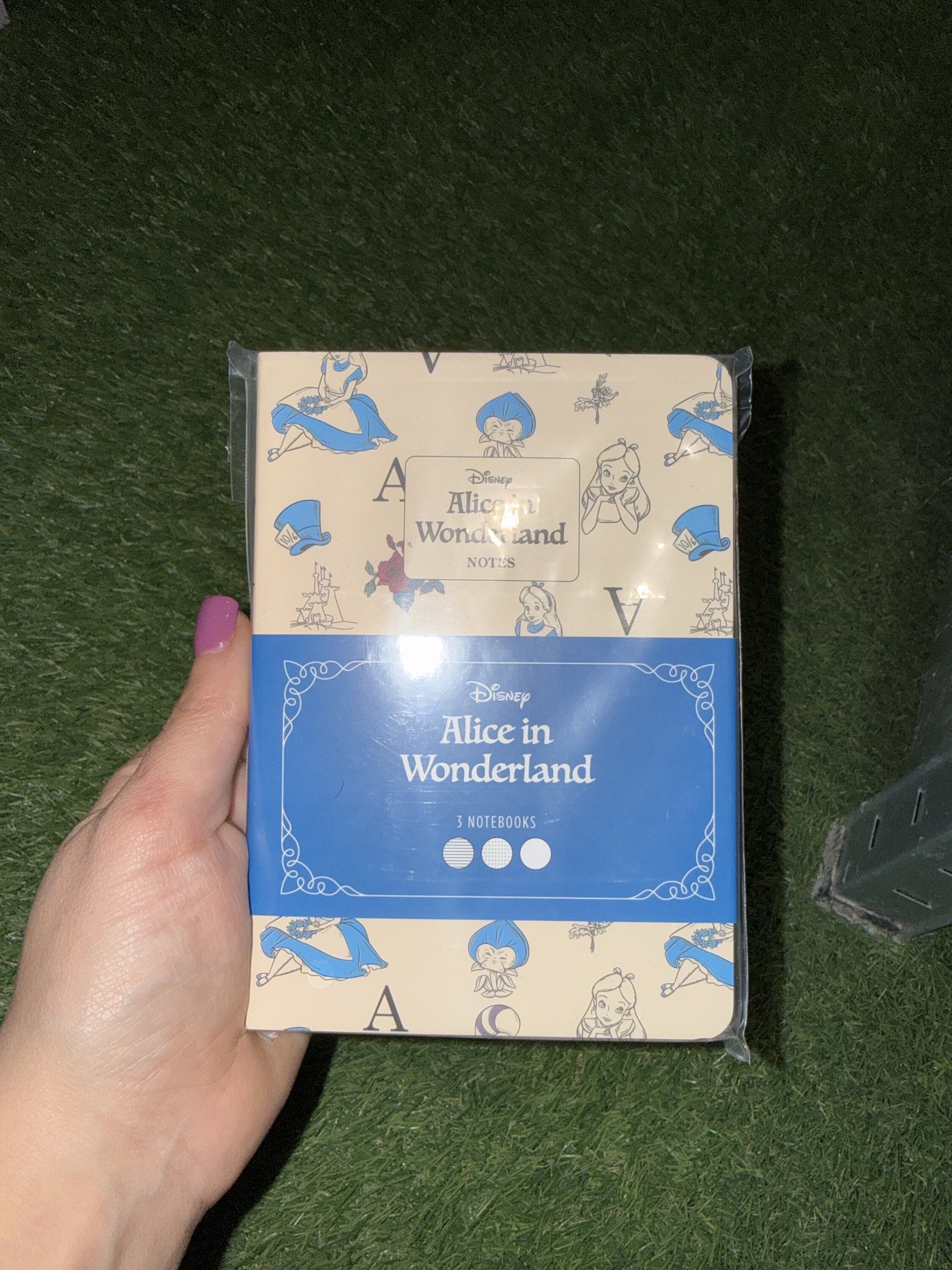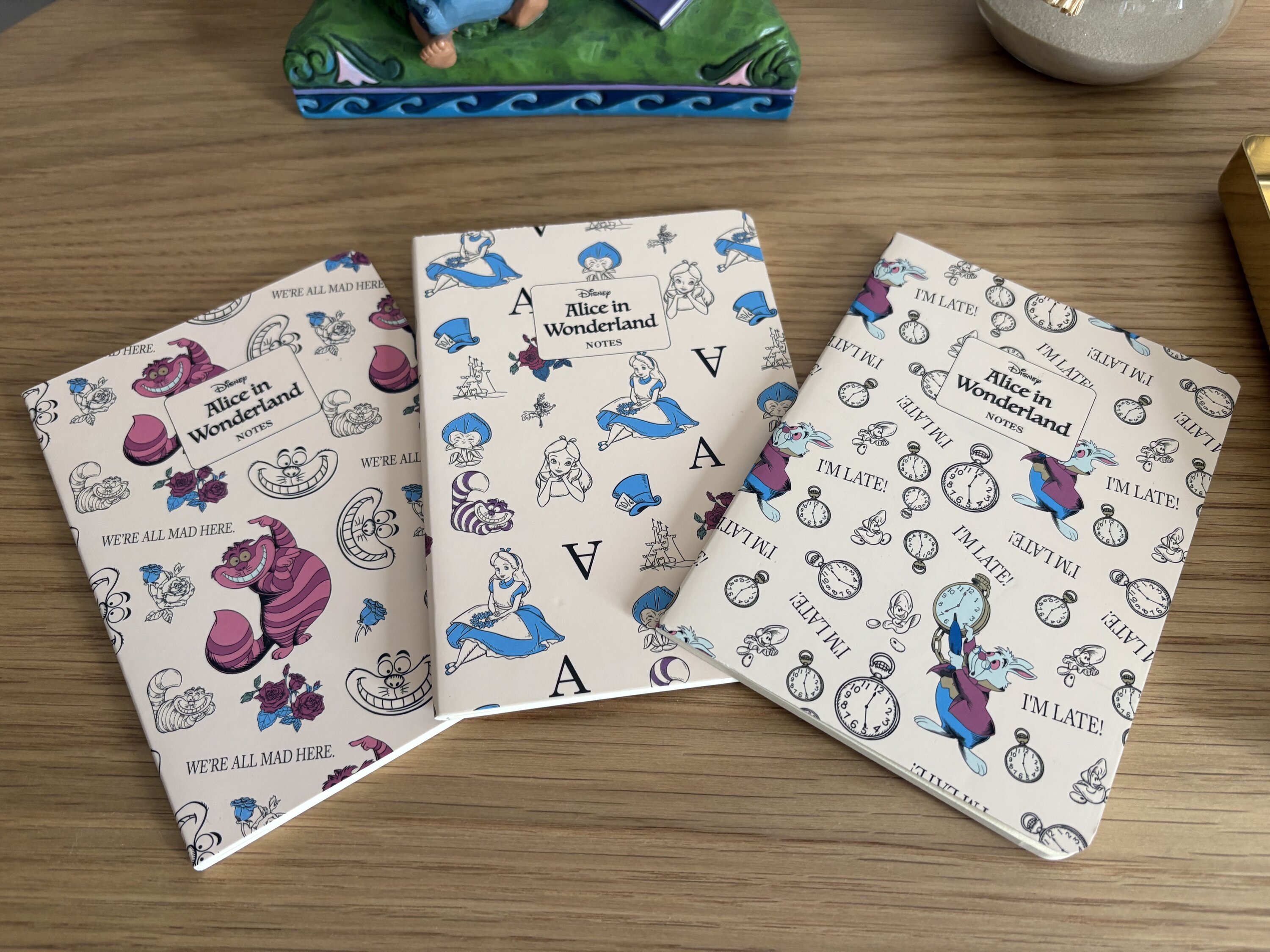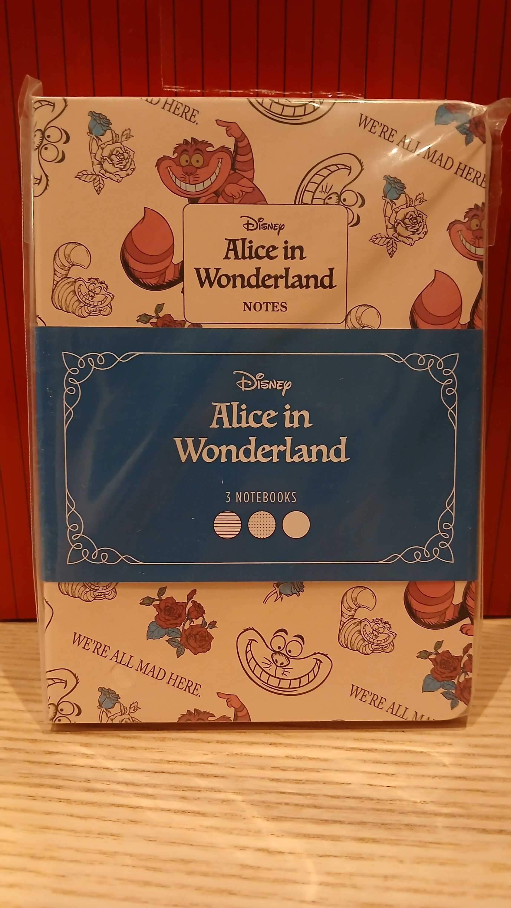 Three small notepads featuring various Alice characters on the cover. Their small size makes them easy to carry everywhere; they slip easily into even a small handbag. I recommend them.