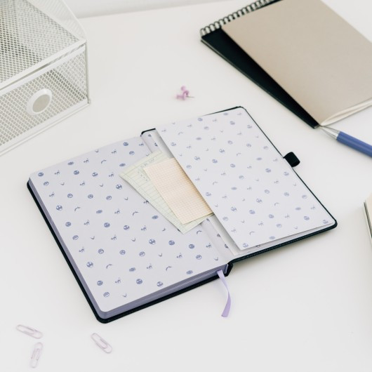 A5 hardcover notebook with a projector pen. Features an embossed PU cover, custom dotted pages, rounded corners, glue binding, ribbon bookmark and pocket. Includes 96 sheets (192 pages) of 100 g/m2. It also includes a pen that projects an image by pressing a button on the body of the pen. It is powered by 4 1.5V AG3 batteries (included).