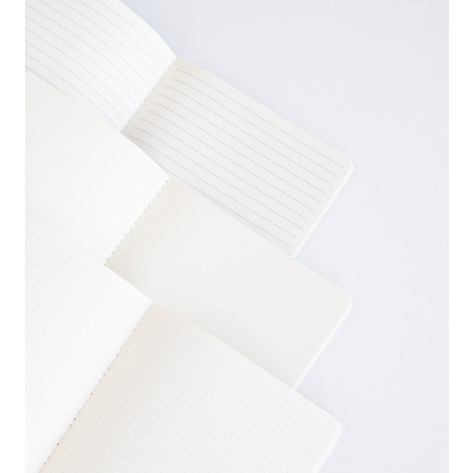 Set of 3 A5 softcover notebooks, with three different designs. Each notebook measures 14.8 x 21 cm and is made from a 300 g/m² printed paper cover. Each notebook has 32 sheets of 80 g/m² (64 pages) and contains a different type of interior: lined, dotted, white.