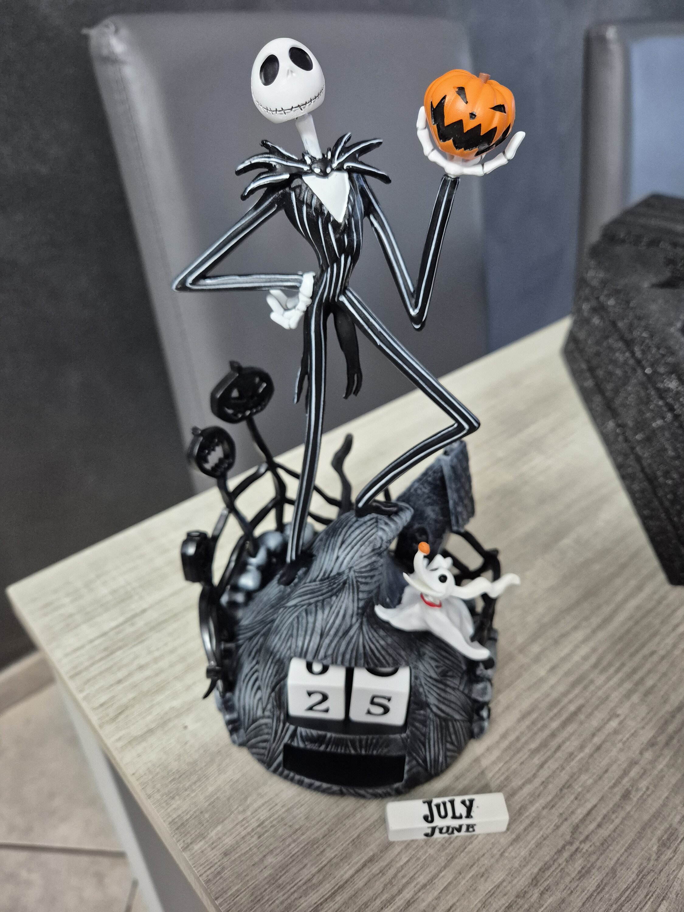 3D perpetual calendar, made of resin and hand painted. It is composed of 2 movable parts, the pumpkin and the head of Jack Skellington, these two parts being replaceable with each other to be able to personalize the figurine. It includes 5 blocks with days and months which can be exchanged and combined to obtain all the possible dates.