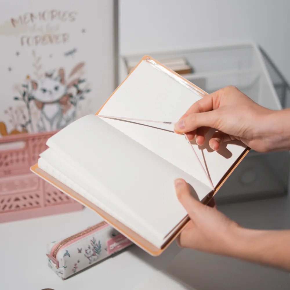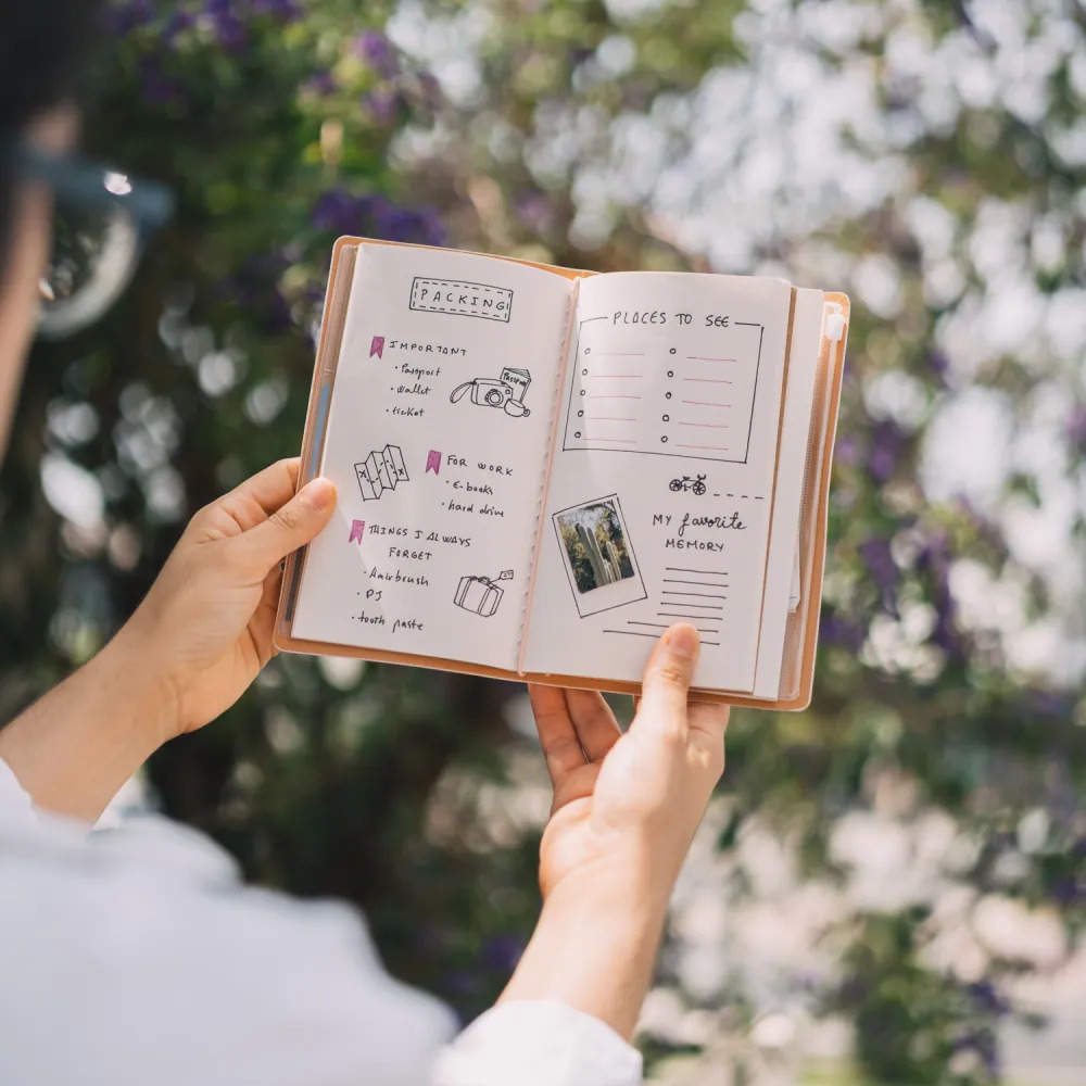 Travel journal with a soft polyurethane cover. Includes a map compartment, two 80-sheet (160-page) notebooks with two different paper types (bullet and lined), and an inside back pocket. Features an elastic closure and a polyurethane snap fastener.
