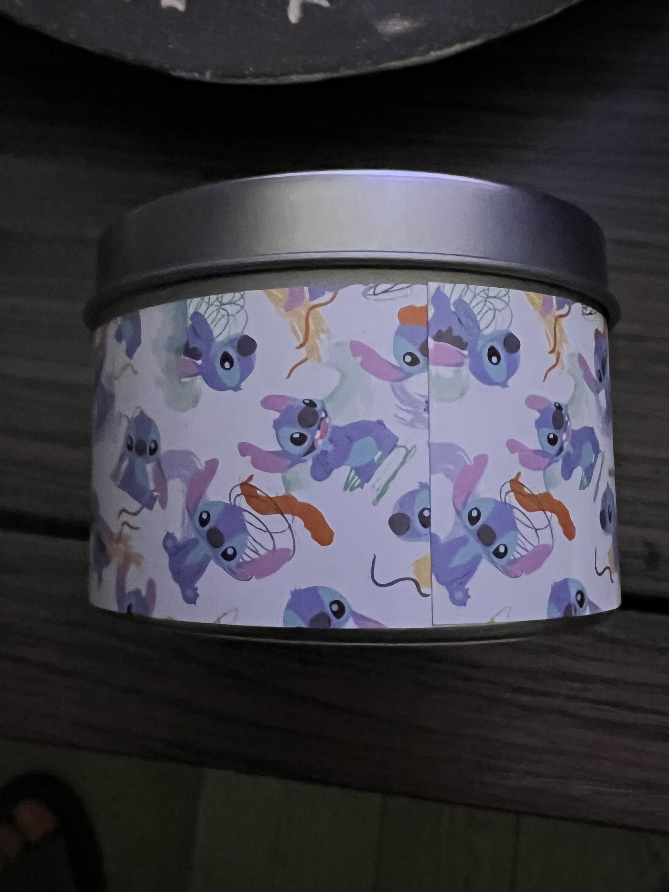 Presented in a beautifully decorated metal tin with white and turquoise Lilo & Stitch motifs and an illustrated lid featuring the characters, this candle adds a decorative Disney touch to any room. Once the candle is finished, the tin can be reused for storage or as a collectible.