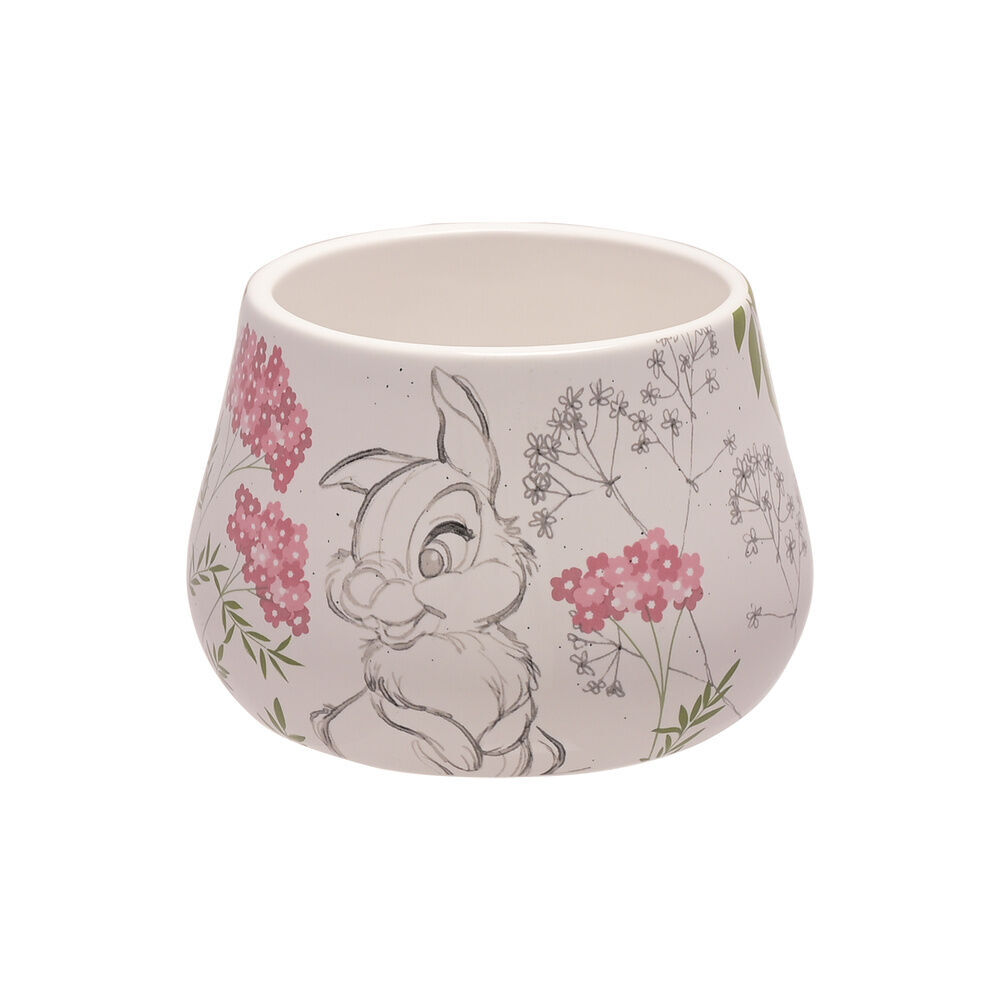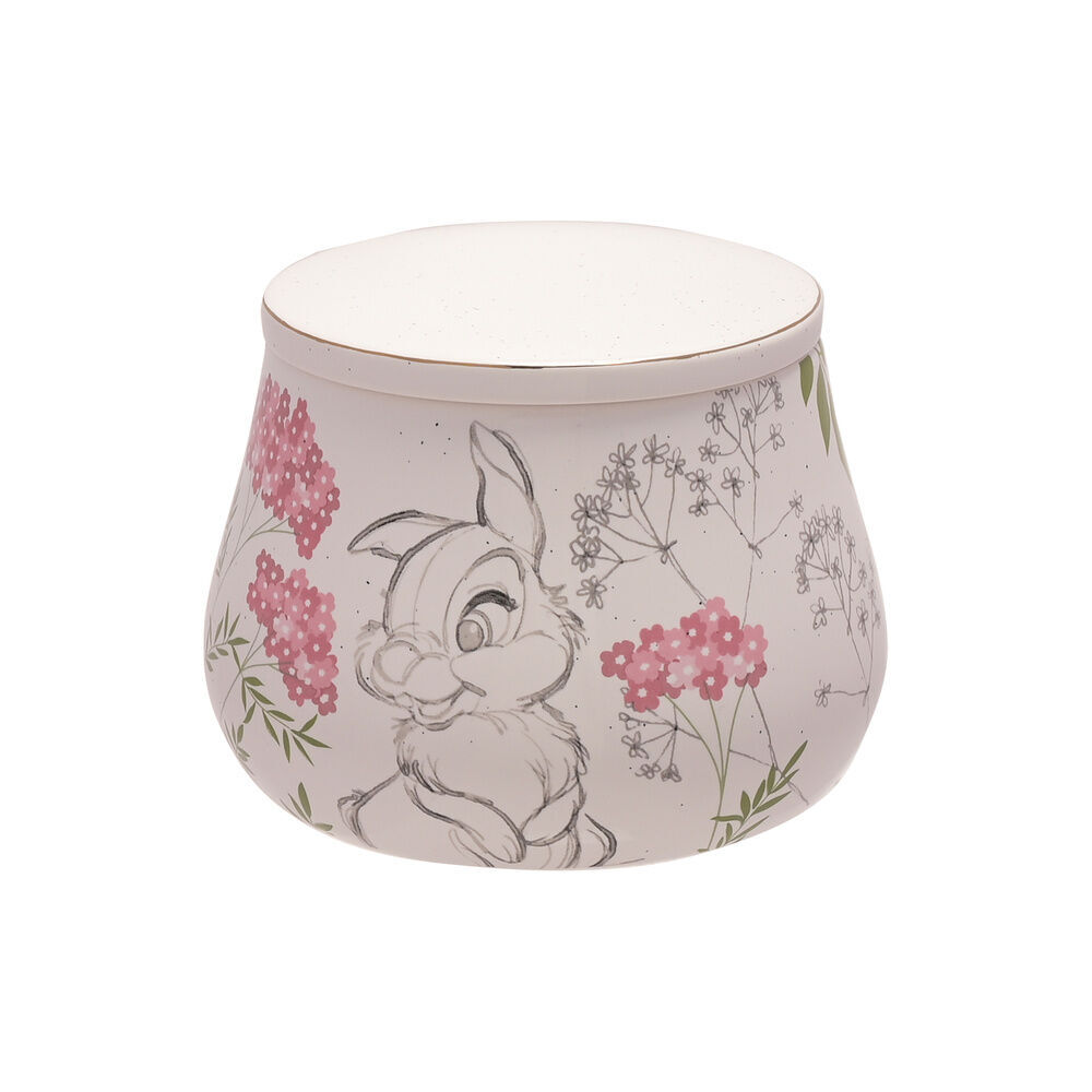 The ceramic trinket box showcases a white gloss finish, complete with colourful printed flowers and pencil sketch style Thumper illustration. The box is completed by a matching fitted lid with silver edge detailing.