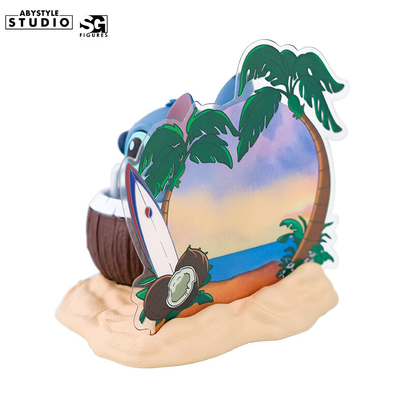 This adorable figurine depicts Stitch comfortably nestled in half a coconut, as if sipping a tropical cocktail. With his playful expression, large perked ears, and relaxed pose, he embodies all the joy and humor of the Disney universe. The meticulous details of the shell, the sand, and the vibrant colors evoke an irresistible vacation scene. It's a piece brimming with cheer, perfect for brightening up a shelf or desk. A perfect blend of cuteness and fun, this summery version of Stitch is sure to melt hearts.