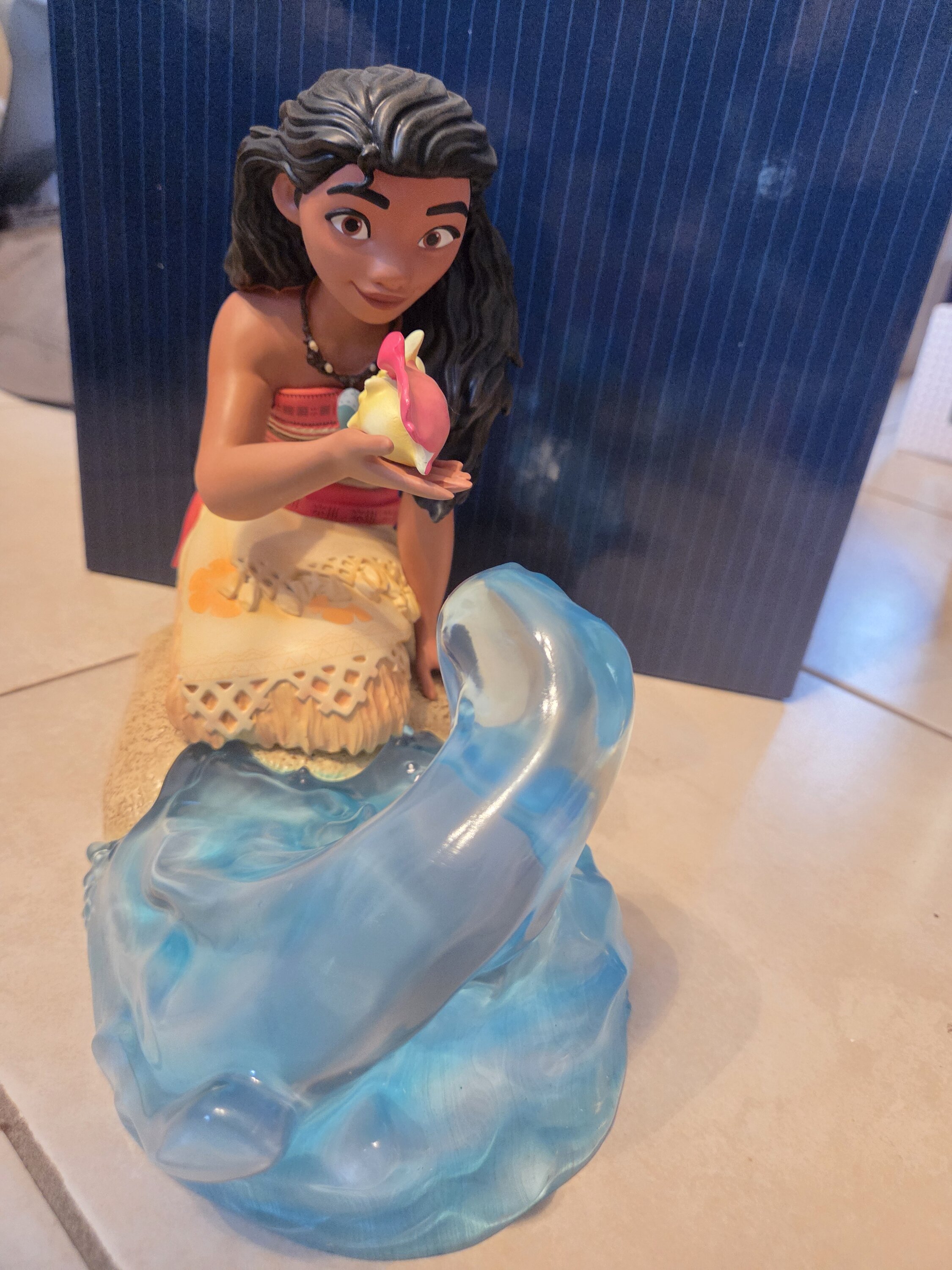Moana holds a gift from the Polynesian waters in her hand while sitting on a sandy Motunui beach surrounded by clear resin sea waves.