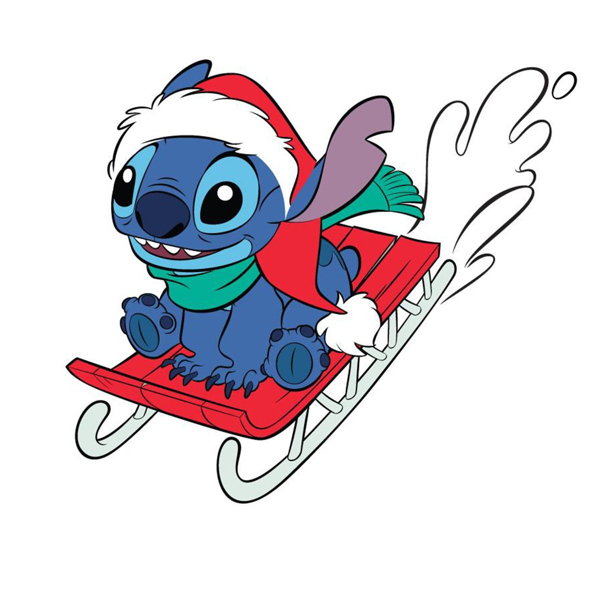 Celebrate the holidays with Stitch. Stitch dawns a warm scarf and Santa hat to celebrate the most festive of holidays on a red sled crashing through the snow.