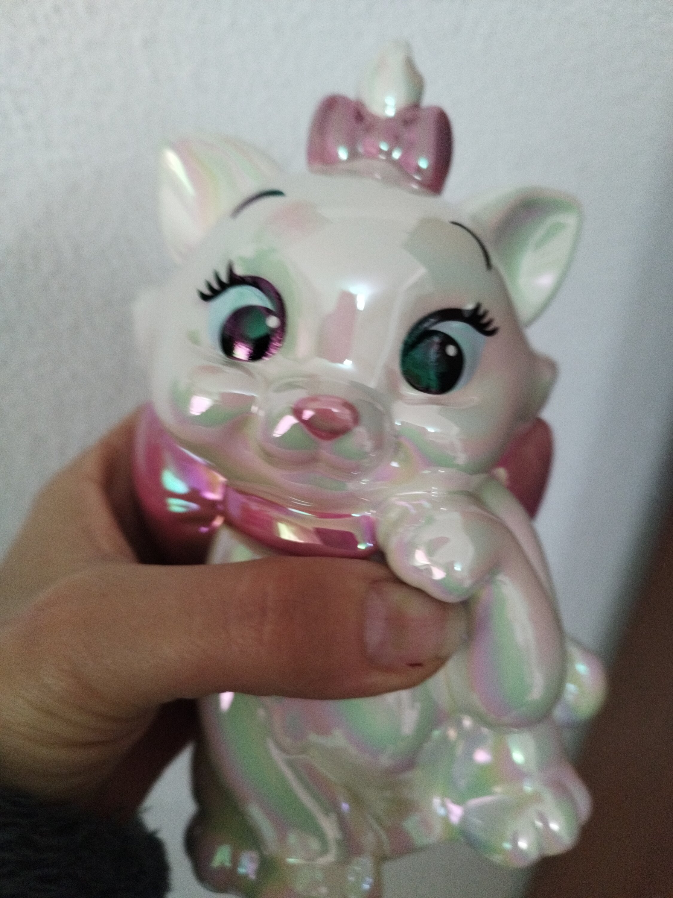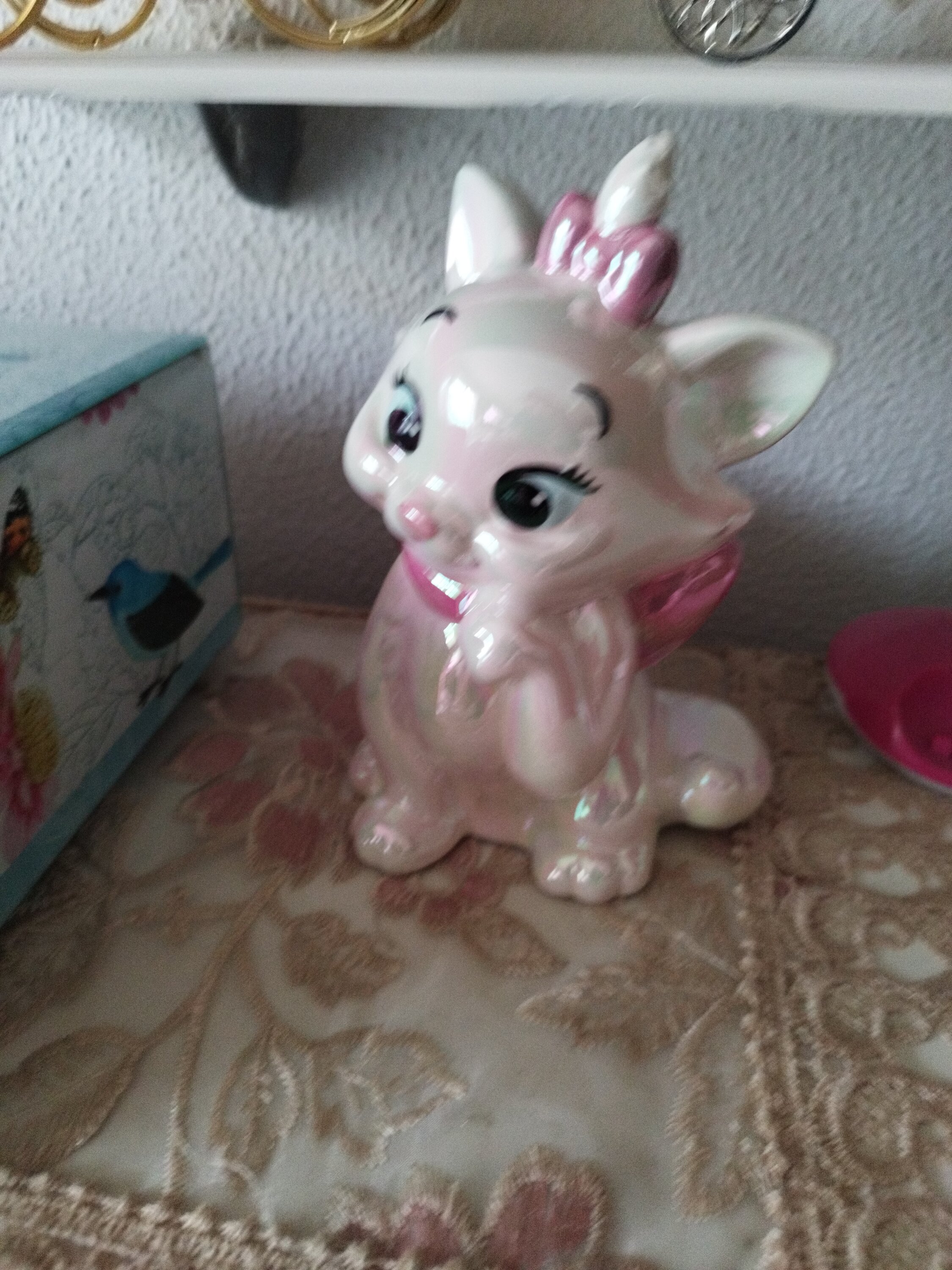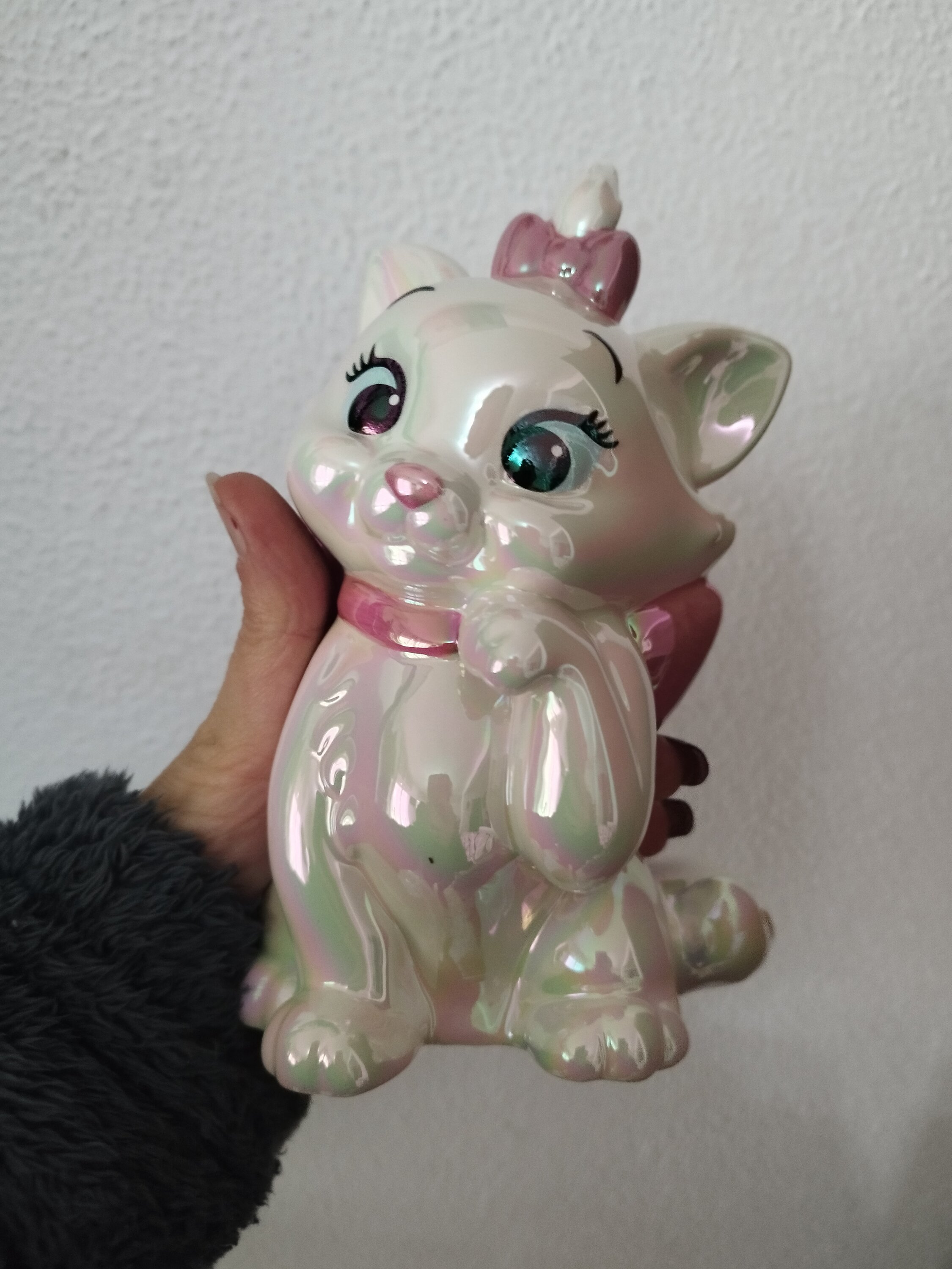 Marie, the adorable kitty from Disney's animated classic The Aristocats is featured in this molded and hand painted ceramic money bank. A special electroplating process gives Marie a unique and very appealing iridescent shine.