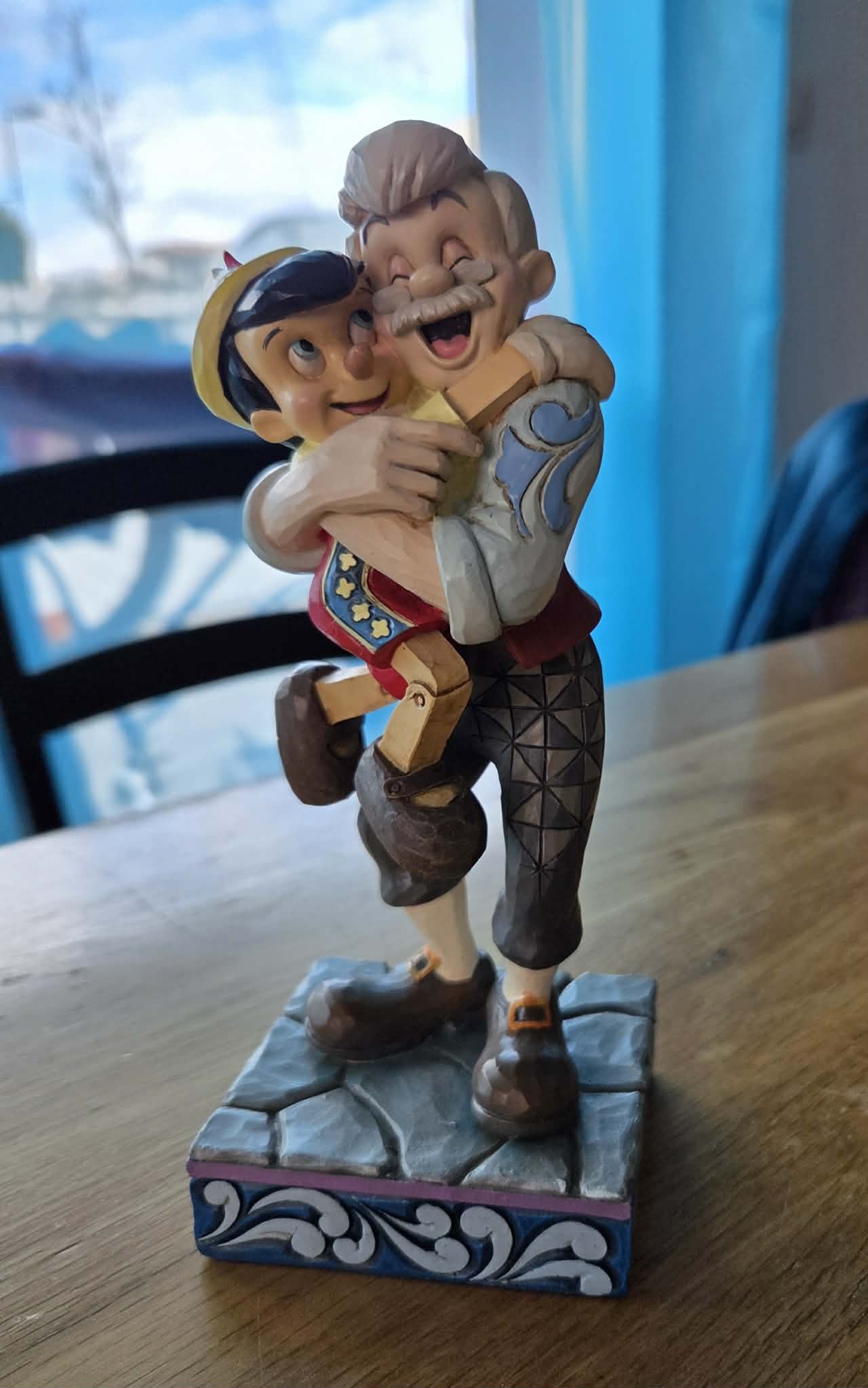 in questa statuina Jim Shore è riuscito a cogliere in un abbraccio tutto l'affetto che un padre può provare per il proprio figlio e Pinocchio ricambia, veramente commovente e allo stesso tempo gioioso grazie Jim Shore