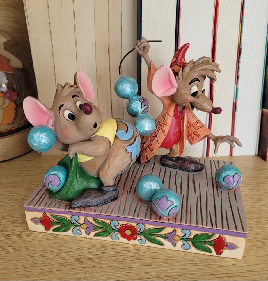 This beloved creation by Jim Shore features Cinderella's best friends, Gus and Jaq. This playful duo always find themselves in trouble but remain loyal and helpful companions. After breaking a string of rosemary pearls, Jaq retrieves them from Gus's tail!