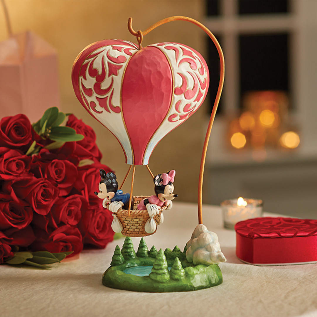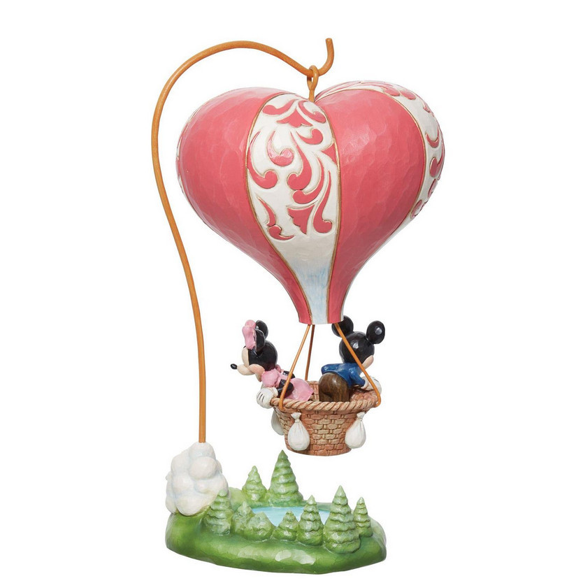 Awesome figurine of Mickey and Minnie aboard a heart-shaped hot air balloon, propelled by love, providing a stunning romantic scene.
