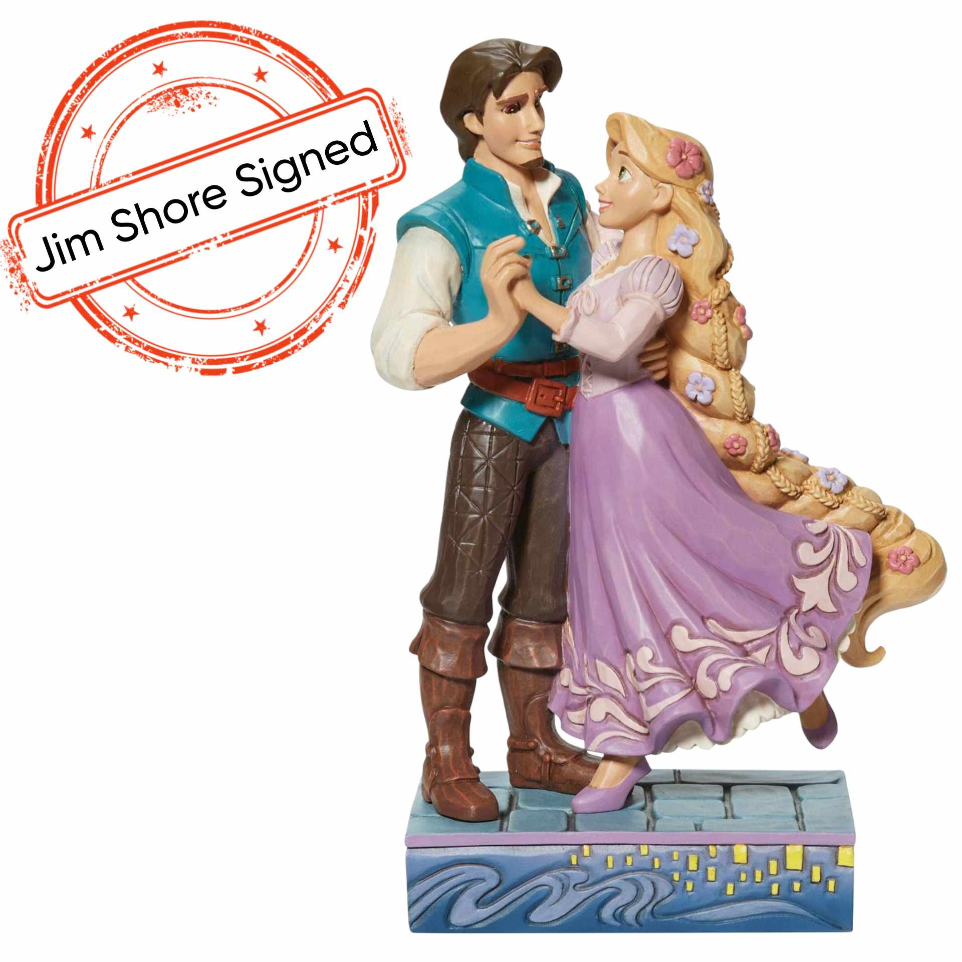 Rapunzel and Flynn figurine. Together in an embrace, There is no distance that love cannot travel. Designed by award-winning artist and sculptor Jim Shore for the Disney Traditions brand.