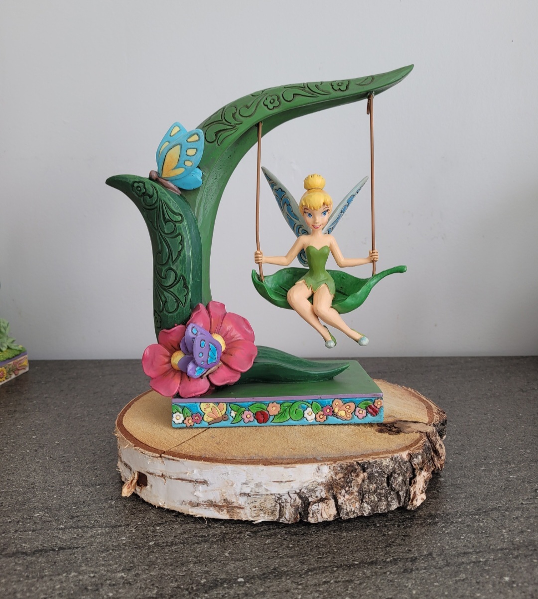 This colorful piece from beloved artist Jim Shore captures the whimsy of Disney's beloved fairy, Tinkerbell on a carefree spring day. Perched on a tree swing amidst colorful flowers, Tinkerbell smiles brightly in the beauty of nature.