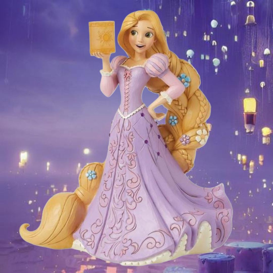 8th in the Enchanted Princess Series, this Jim Shore piece portrays Rapunzel in a moment of enchantment. Adorned in a flowing pink gown and delicate flowers, she holds a paper lantern, radiating a soft glow of hope and wonder.
