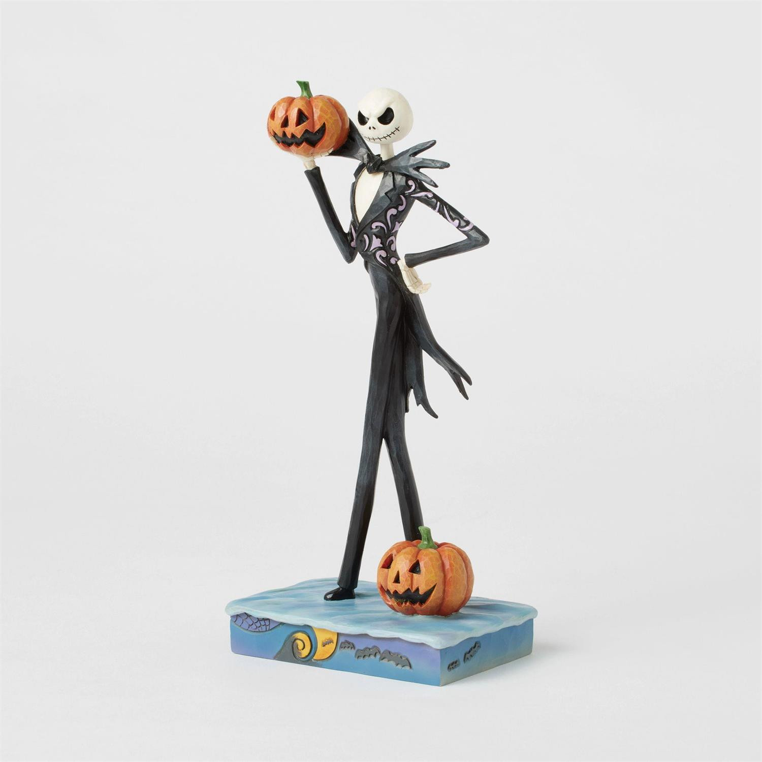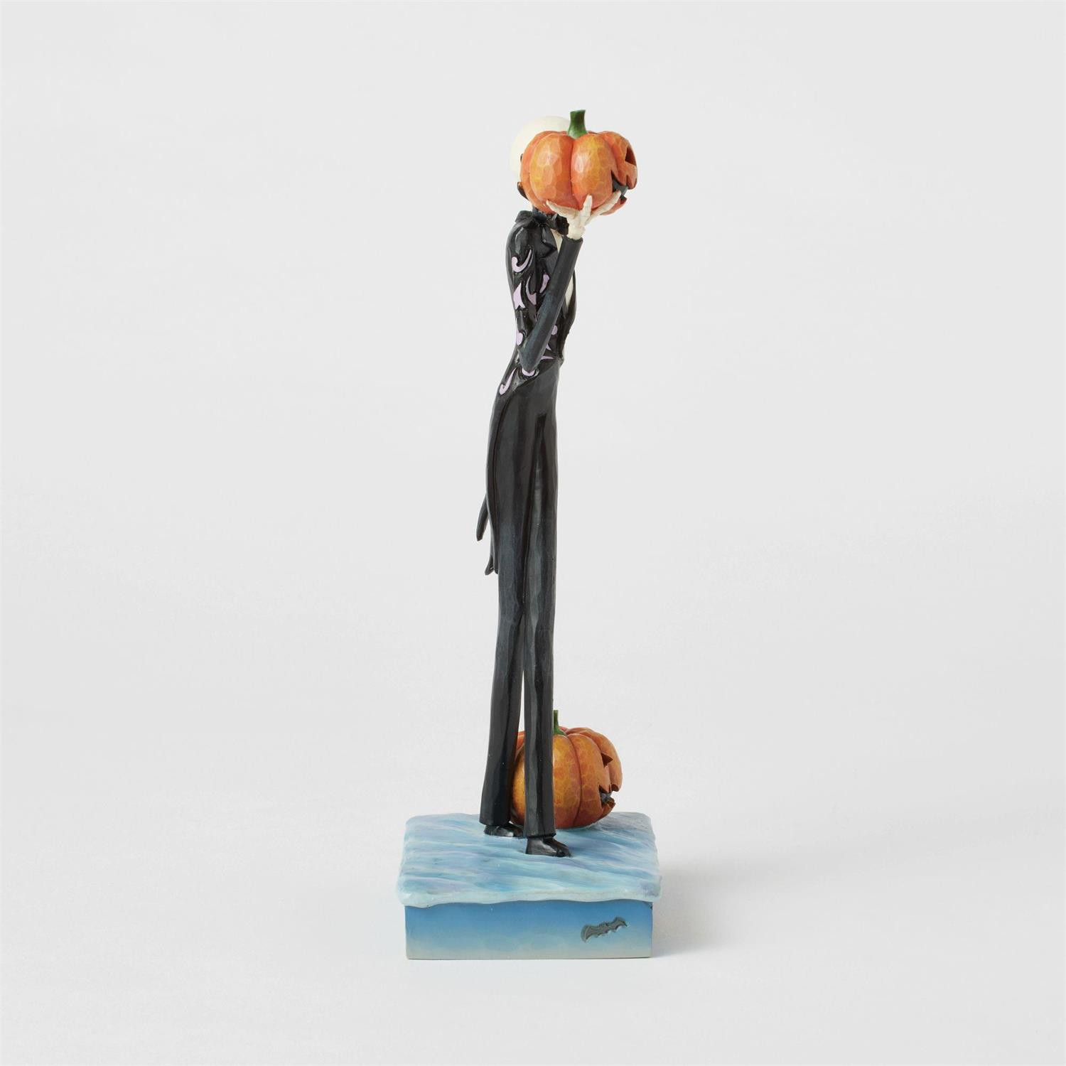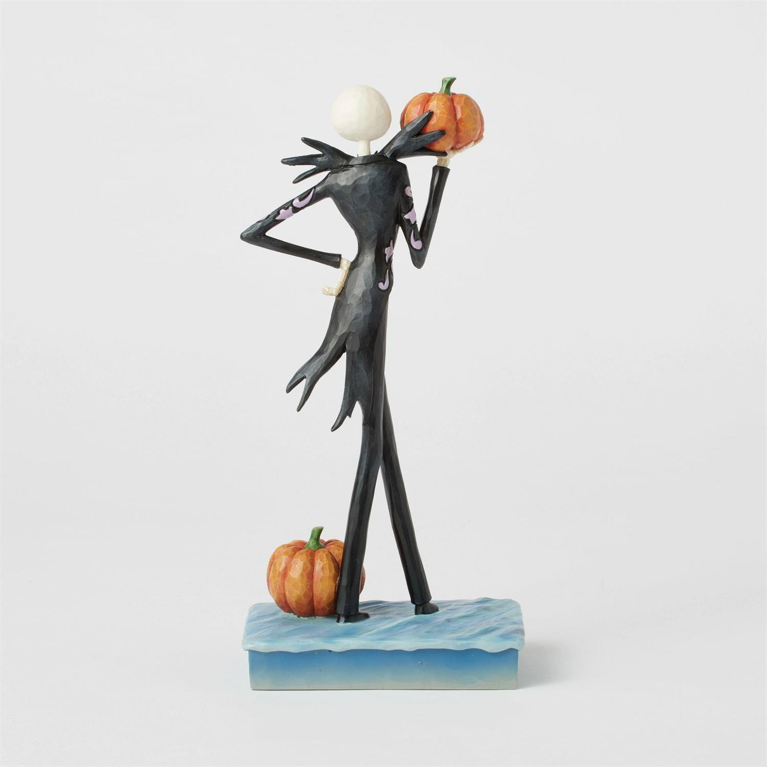 In this captivating Jim Shore figure from the Disney Traditions collection, Jack Skellington is dressed in an elegant black and white suit, and exudes all his charm with a mischievous smile while holding a jack-o'-lantern. This figurine is inspired by The Nightmare Before Christmas. These figures are not children's toys. Intended for adults only.