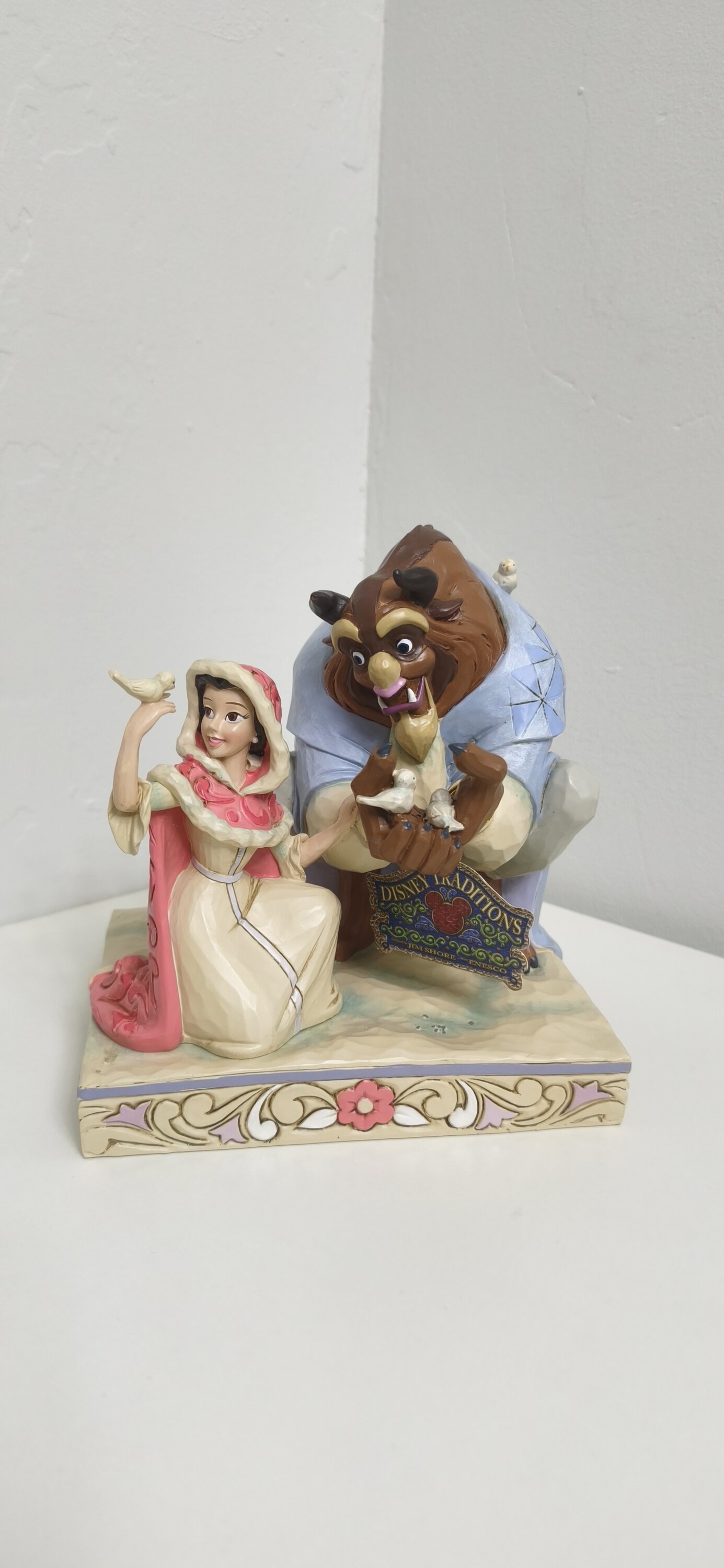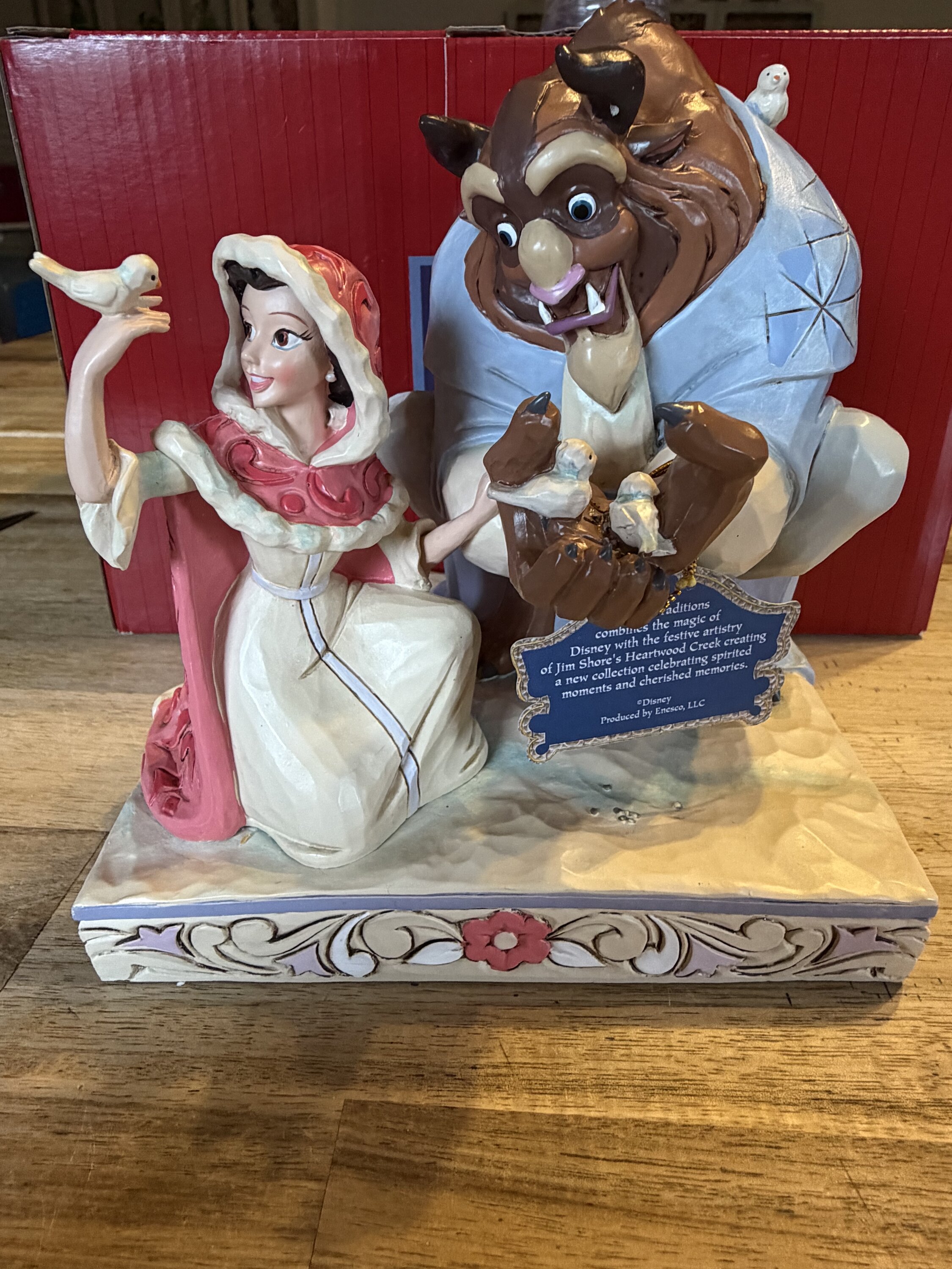 Rediscover the timeless tale of Beauty and the Beast with this enchanting figurine by Jim Shore. Dressed in her winter cloak, Belle kneels gracefully beside the Beast, who gently holds a group of birds in his hands. Their peaceful expressions capture a rare moment of serenity, where trust and tenderness begin to blossom. Set in a snowy scene inspired by the beloved Disney classic, this piece reminds us that true beauty lies within. Meticulously hand-painted, it's a touching tribute to love, transformation, and the magic of shared moments. A must-have for Disney collectors and dreamers alike.