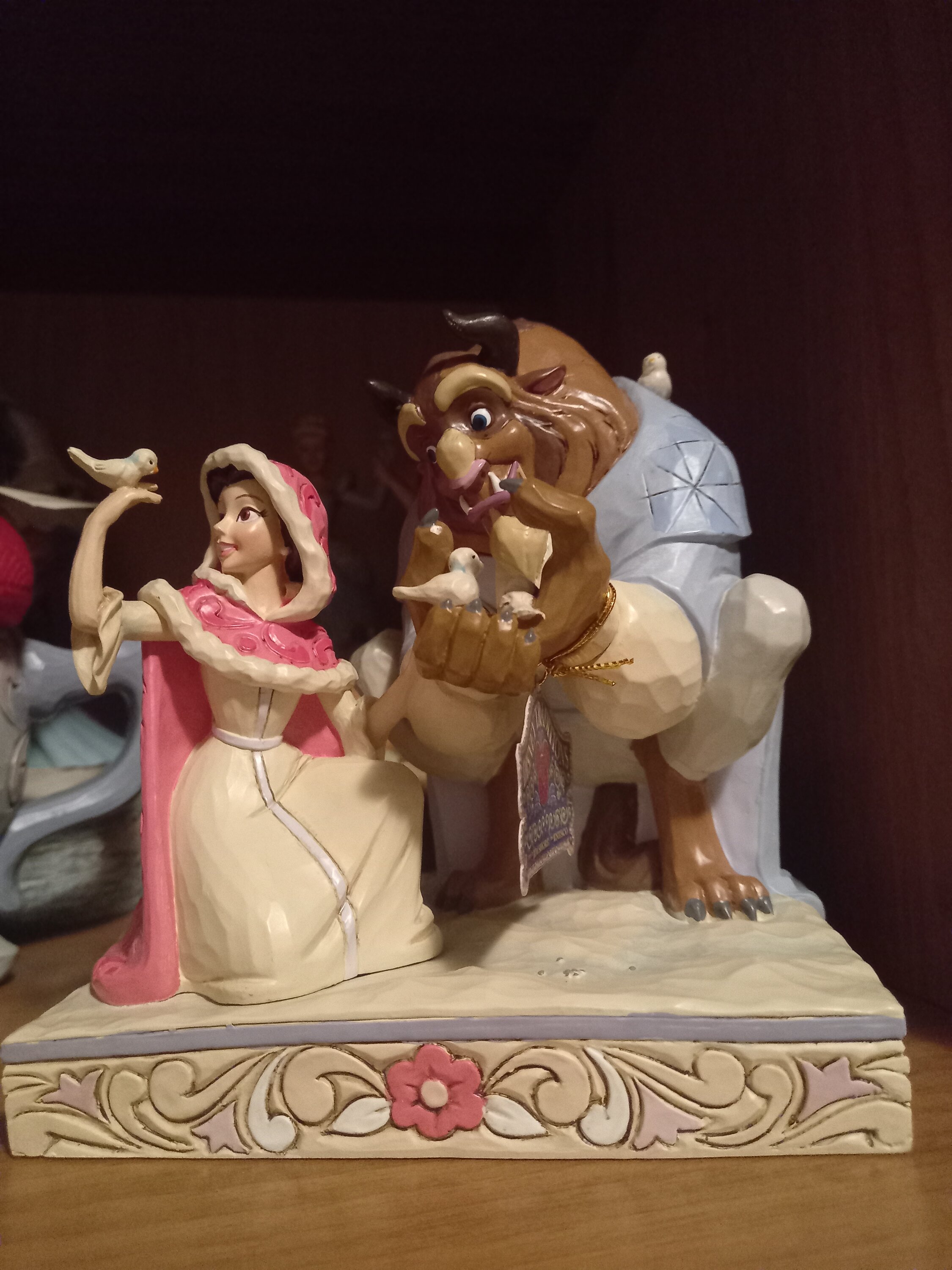 Beautiful scene of Beauty and the Beast in the snow... with the little birds... The details are very present, even the little seeds on the ground that they give to the birds...