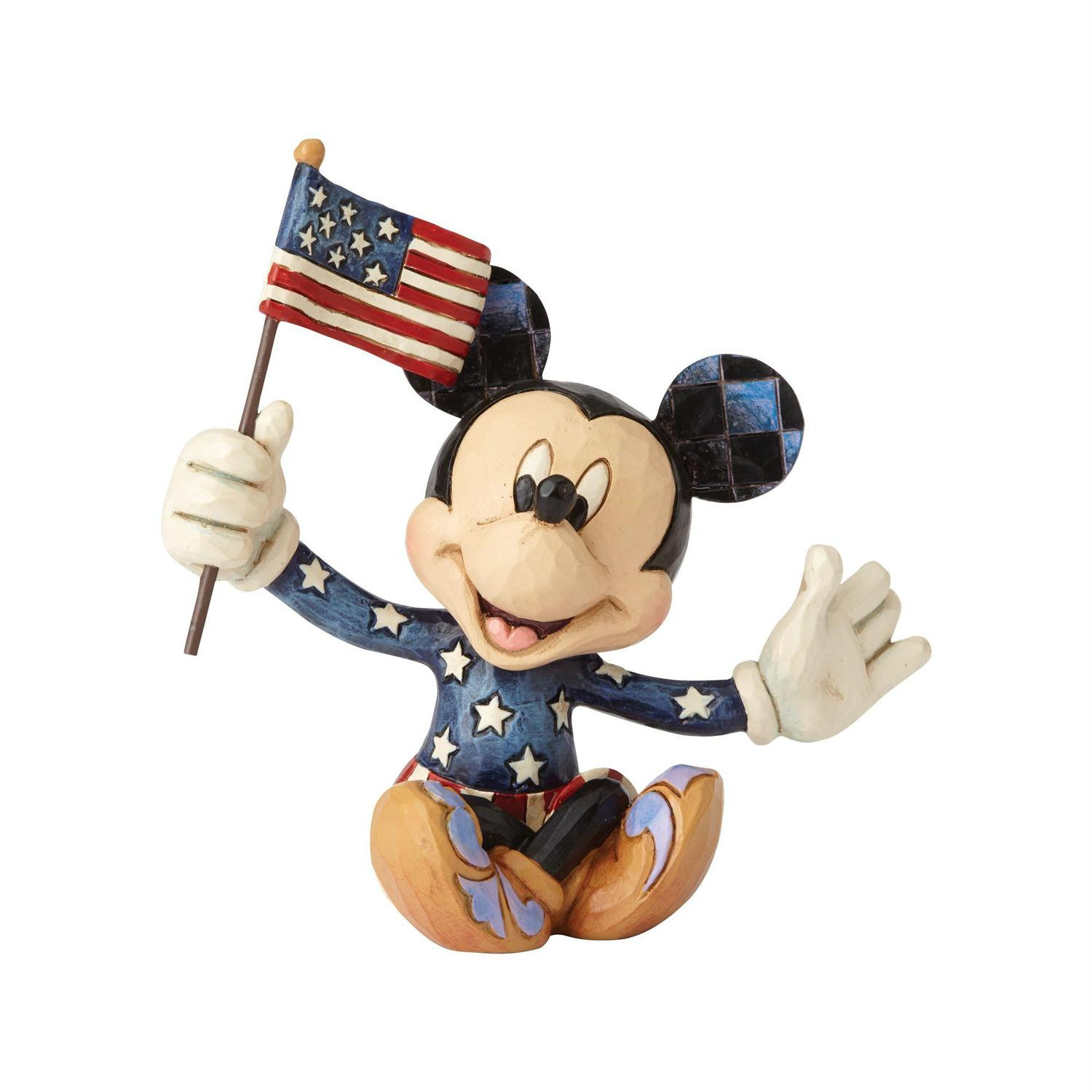 This mini Mickey is big on patriotism, sporting a full star-spangled outfit while proudly waving the red, white, and blue. Sculpted from stone resin, handcrafted design is hand-painted with classic folk art motifs for an extra dose of Americana.