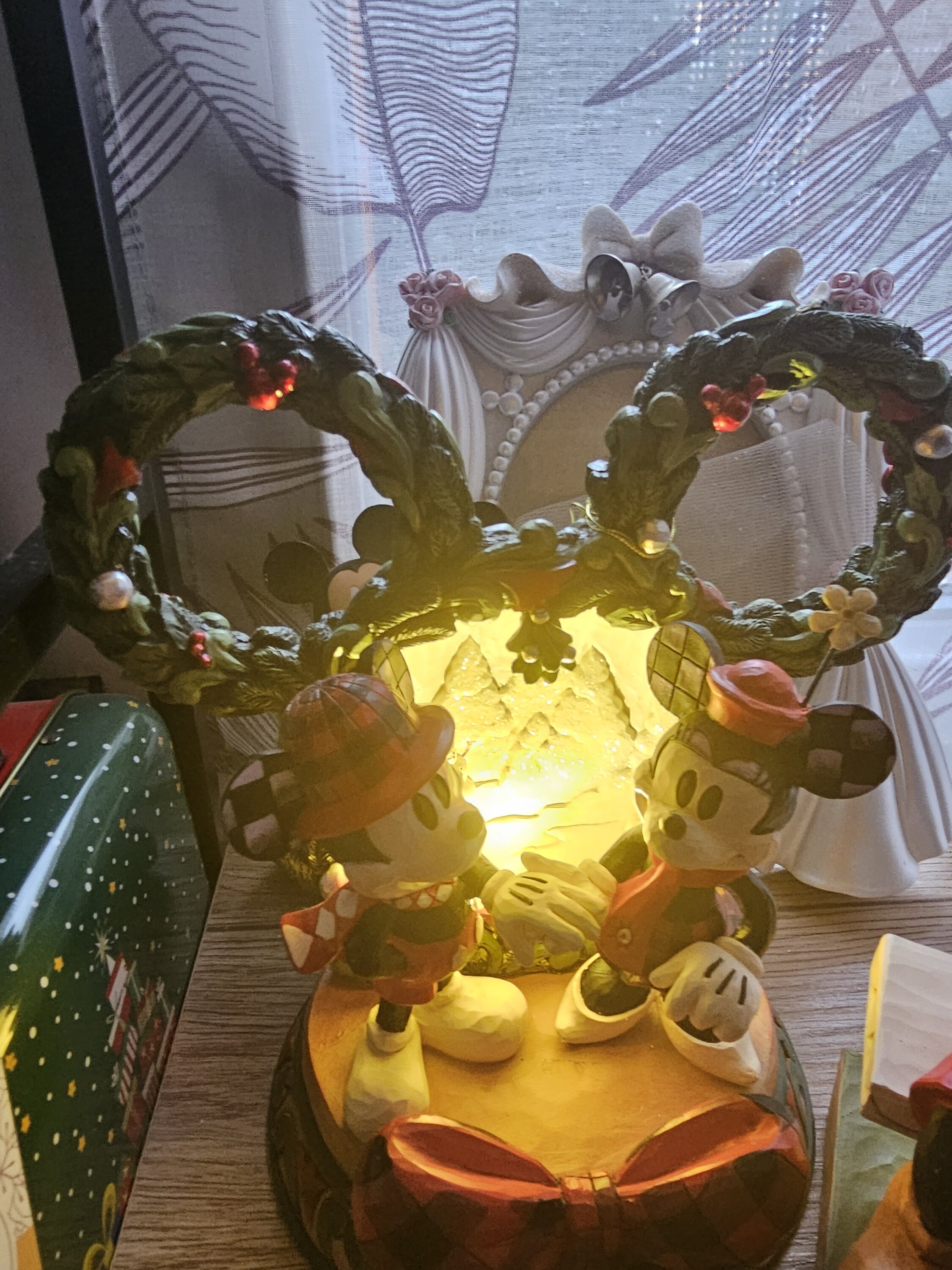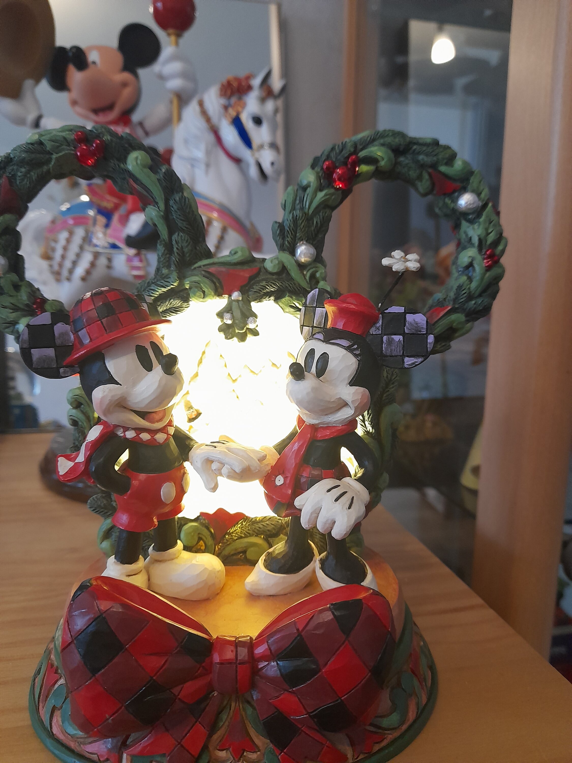 This delightful Jim Shore Christmas scene captures Mickey and Minnie holding hands beneath a glowing LED diorama, framed by a festive Mickey-shaped garland adorned with berries and pearl accents. It radiates seasonal magic with holiday charm.