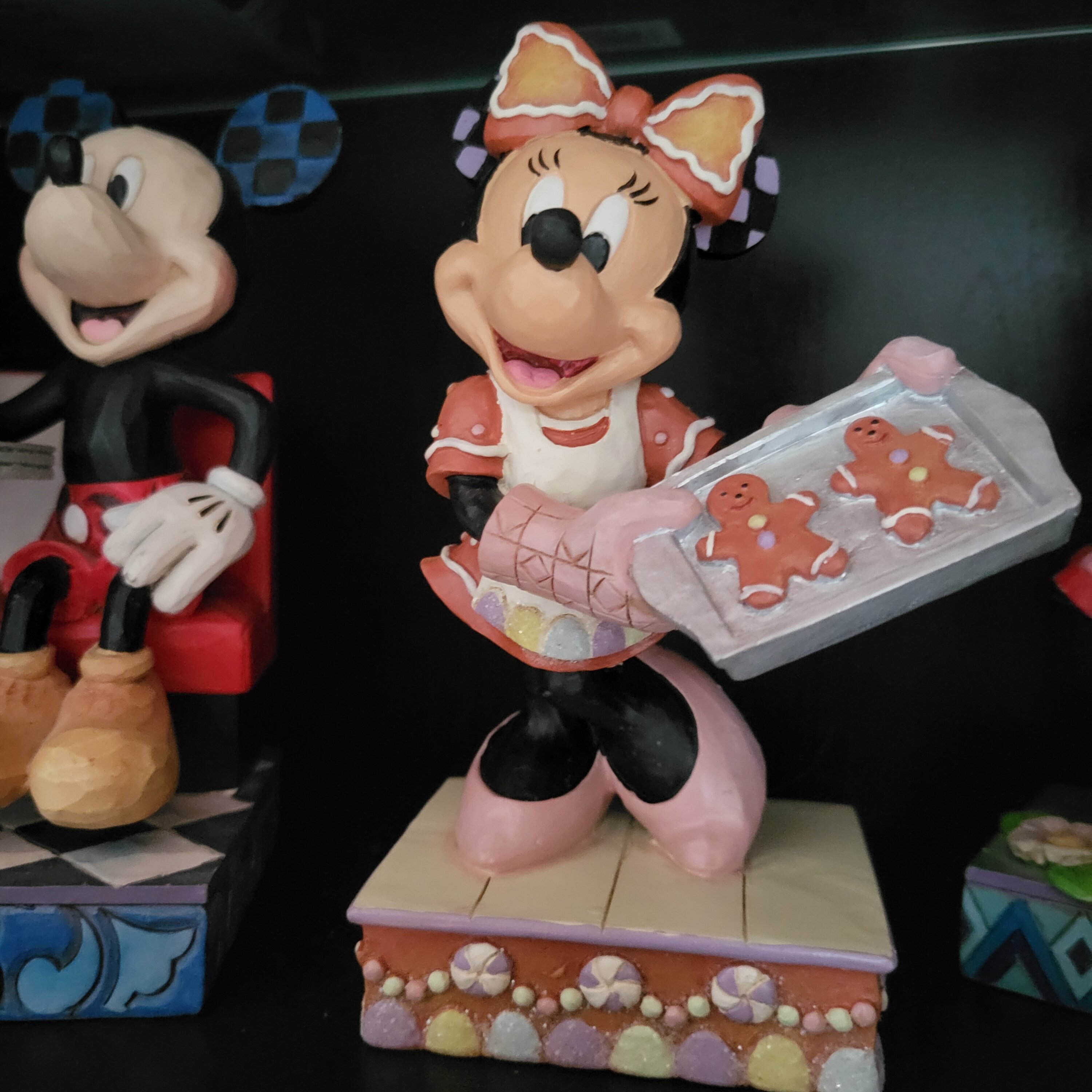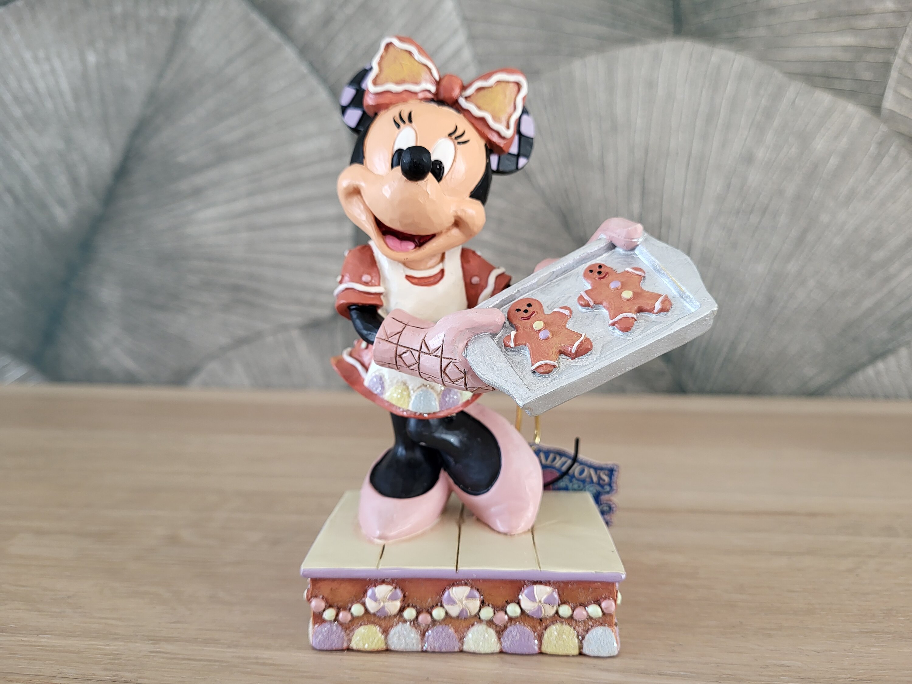 Dressed in a delightful gingerbread-inspired dress and bow, Minnie Mouse shares freshly baked cookies in this heartwarming Jim Shore scene. Standing on a stage of colorful candy, Minnie brings the warmth and sweetness of the season to life.