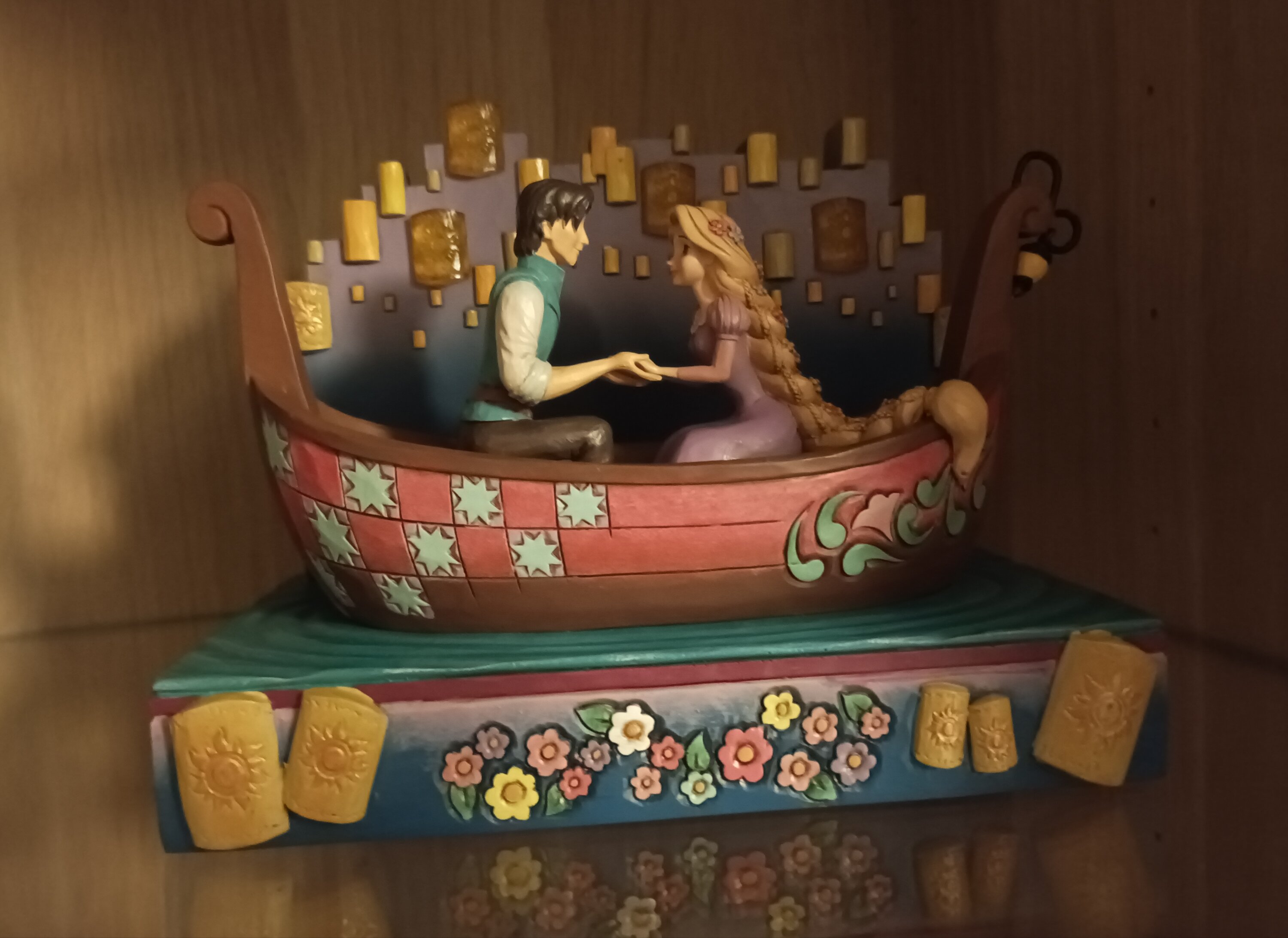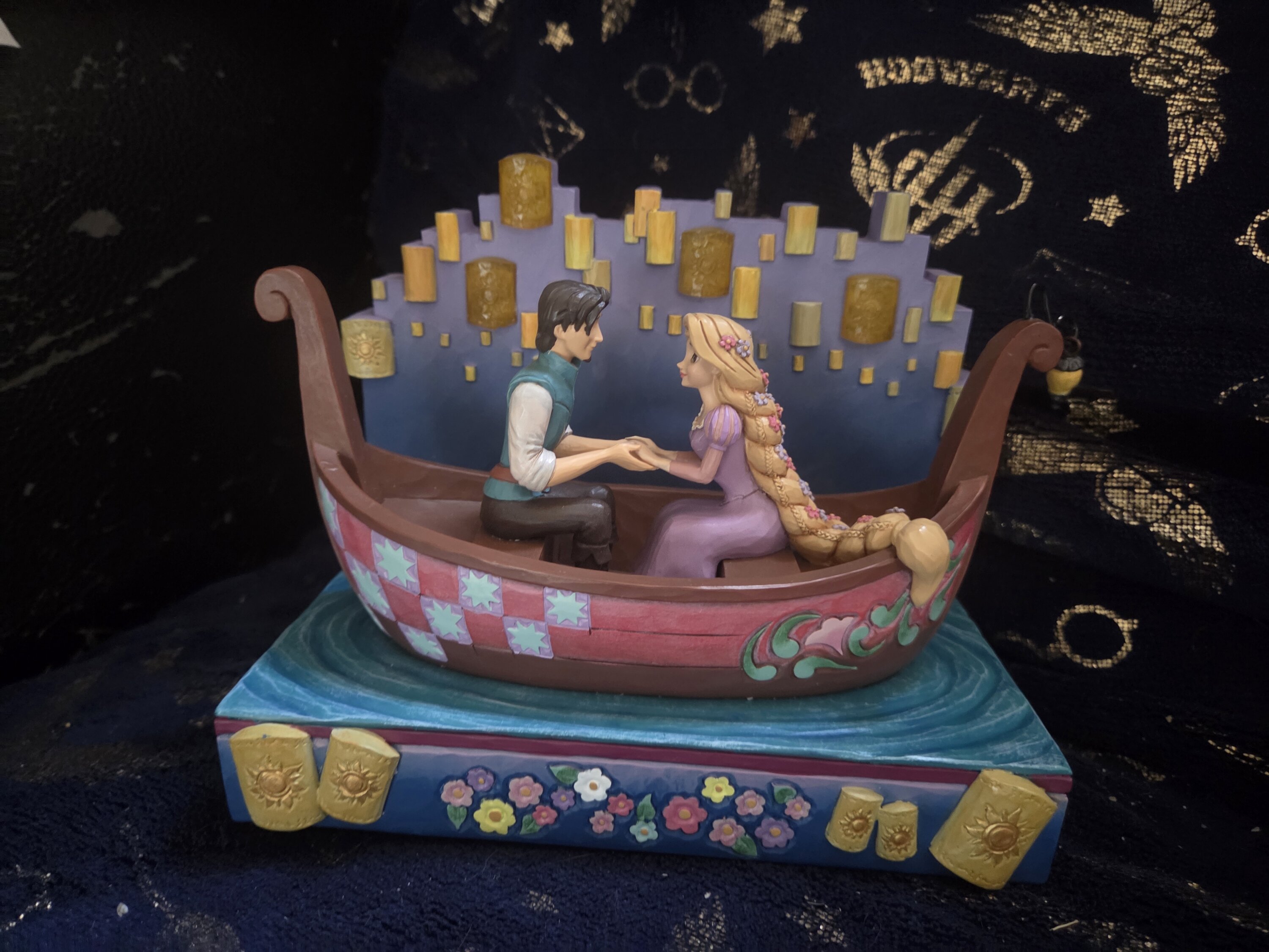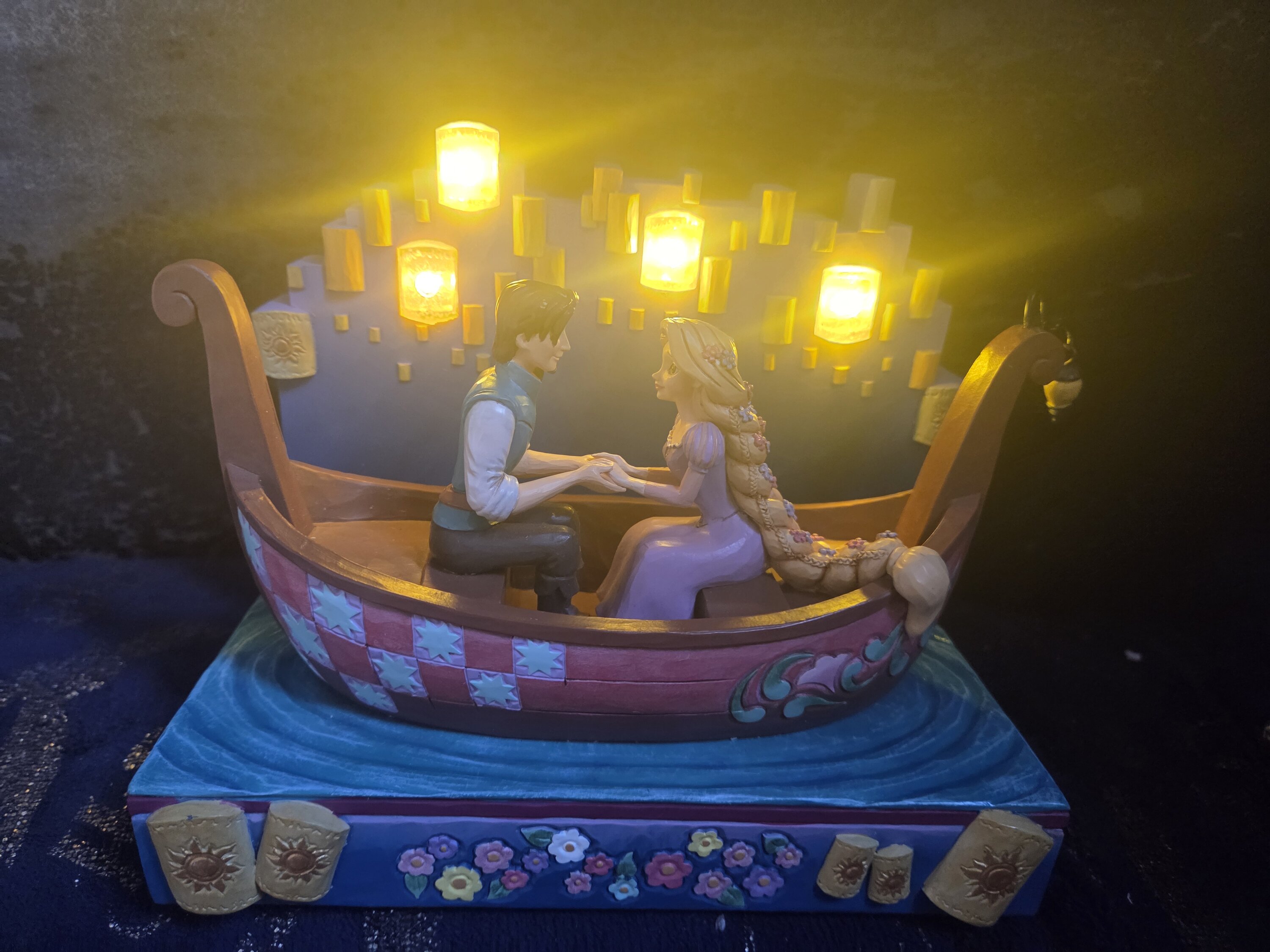 In this beautiful Jim Shore design, Rapunzel and Flynn Rider share a romantic boat ride through glowing LED floating lanterns. Capturing the enchantment, Rapunzel's charm shines with flowers in her hair. The boat features Jim Shore's iconic details.