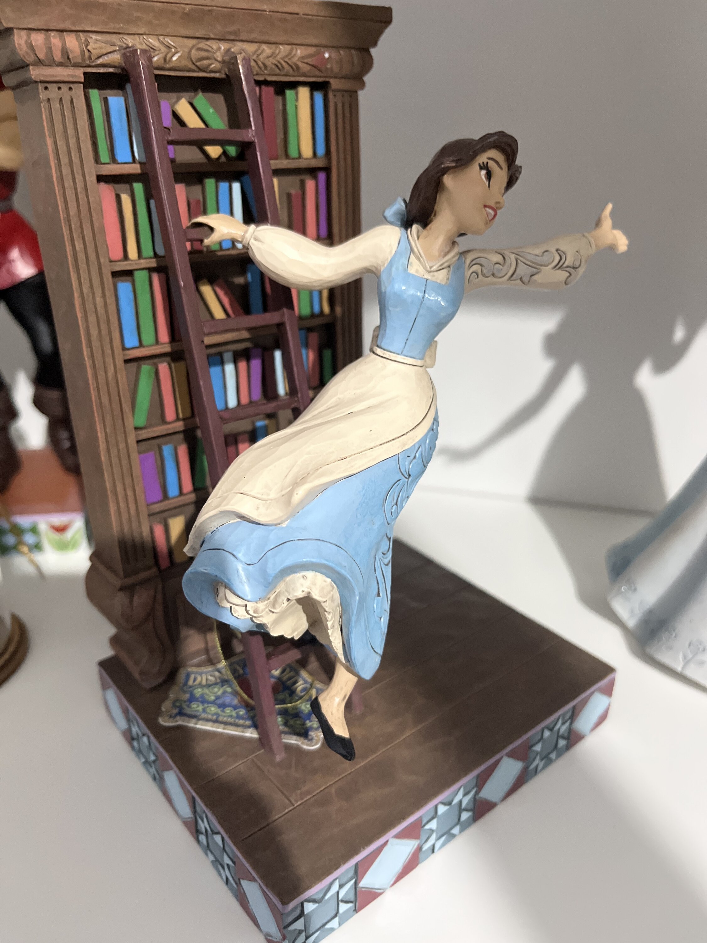 Jim Shore has outdone himself! Our beloved protagonist from the cartoon "Beauty and the Beast" struggling with the library while imagining adventures and magical stories.