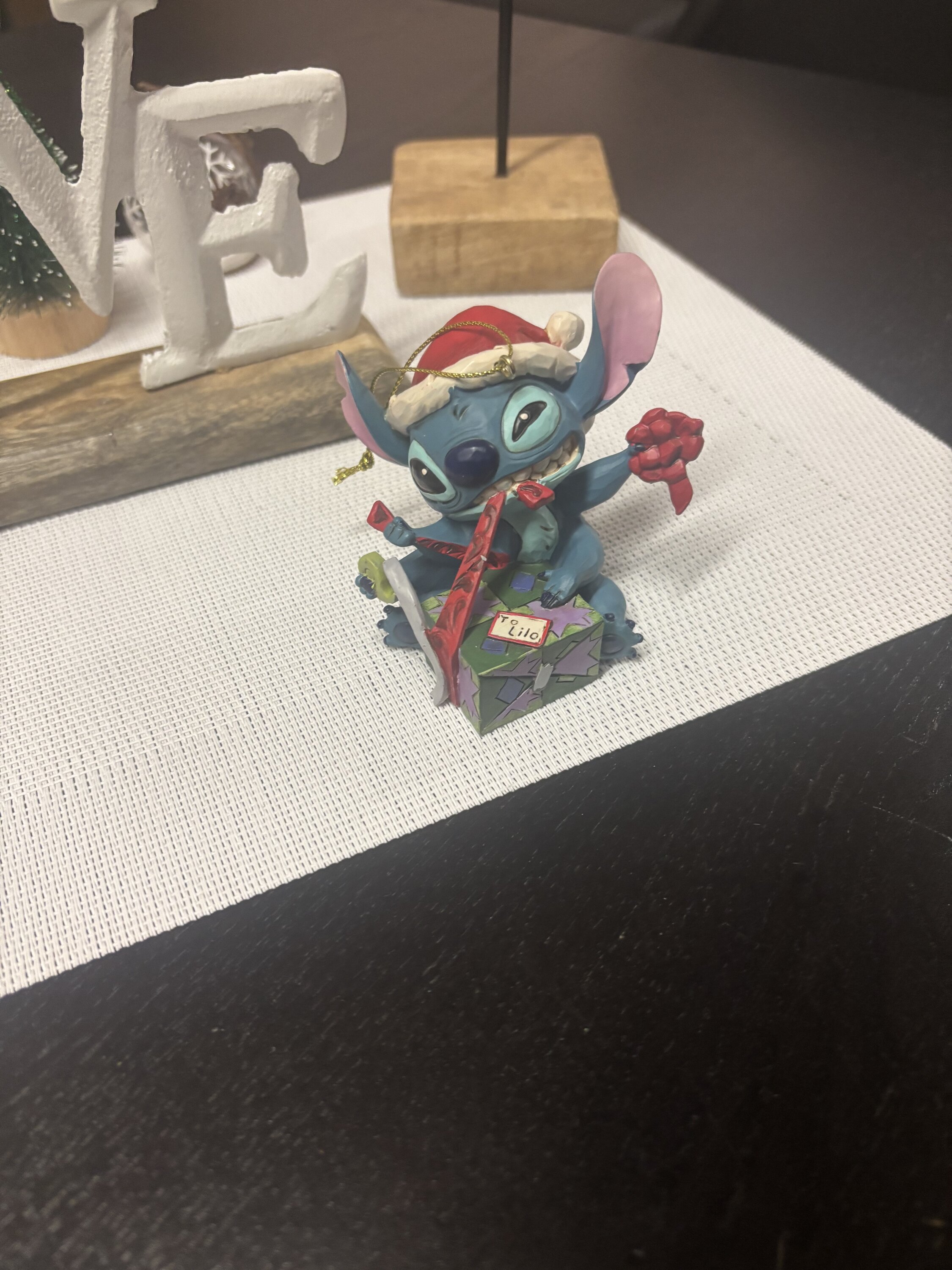 Stitch is excited to unwrap his present this Christmas morning. This adorable hanging ornament is a perfect addition to your tree and captures the excitement of discovering what Christmas has brought. These figurines are not children's toys. Intended for adults only.