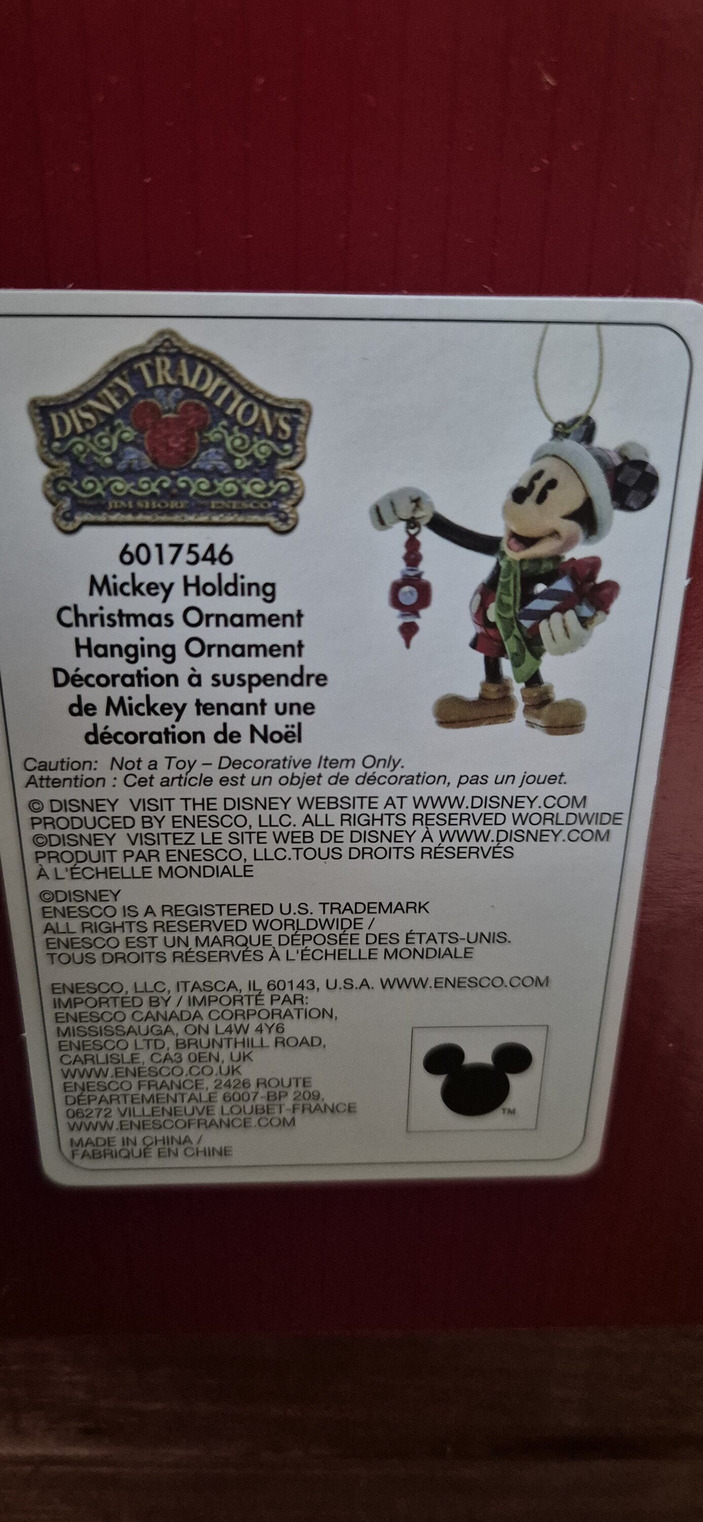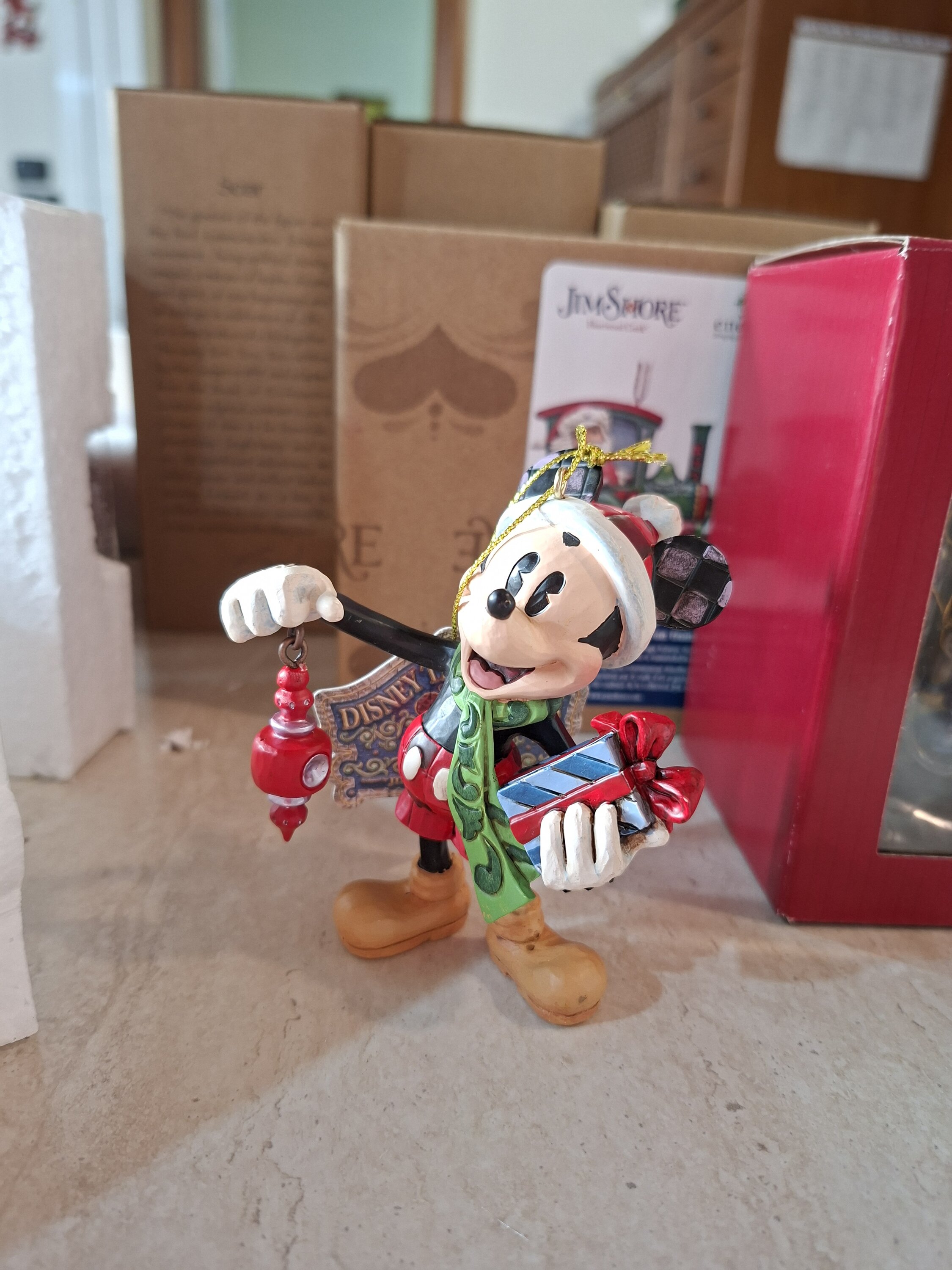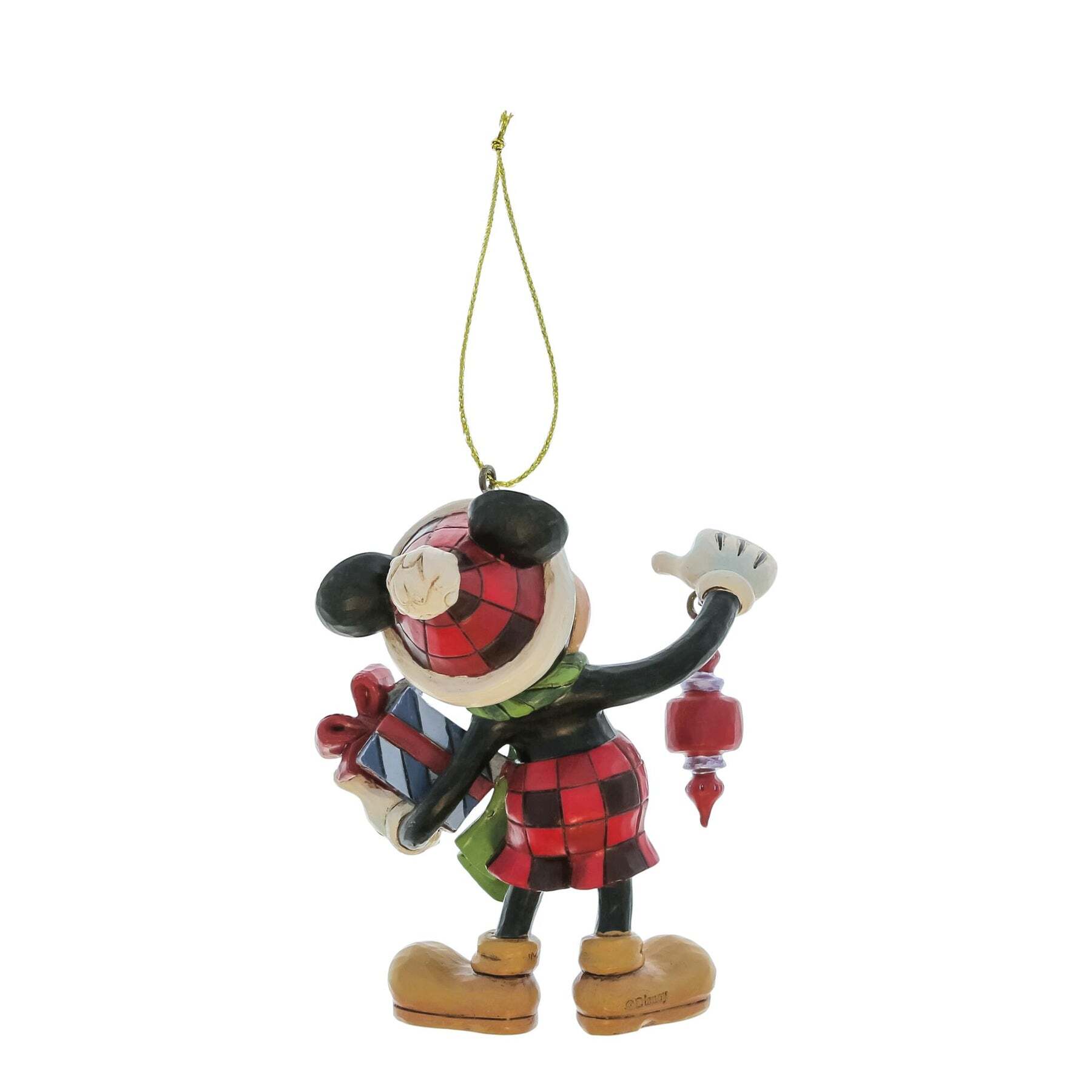 This Mickey Mouse with a Christmas present hanging ornament is part of Jim Shore 's Disney Traditions collection. Perfect for adding a magical touch to your Christmas tree. Designed by award-winning artist and sculptor Jim Shore for the Disney Traditions brand. These figurines are not children's toys. Intended for adult use only.