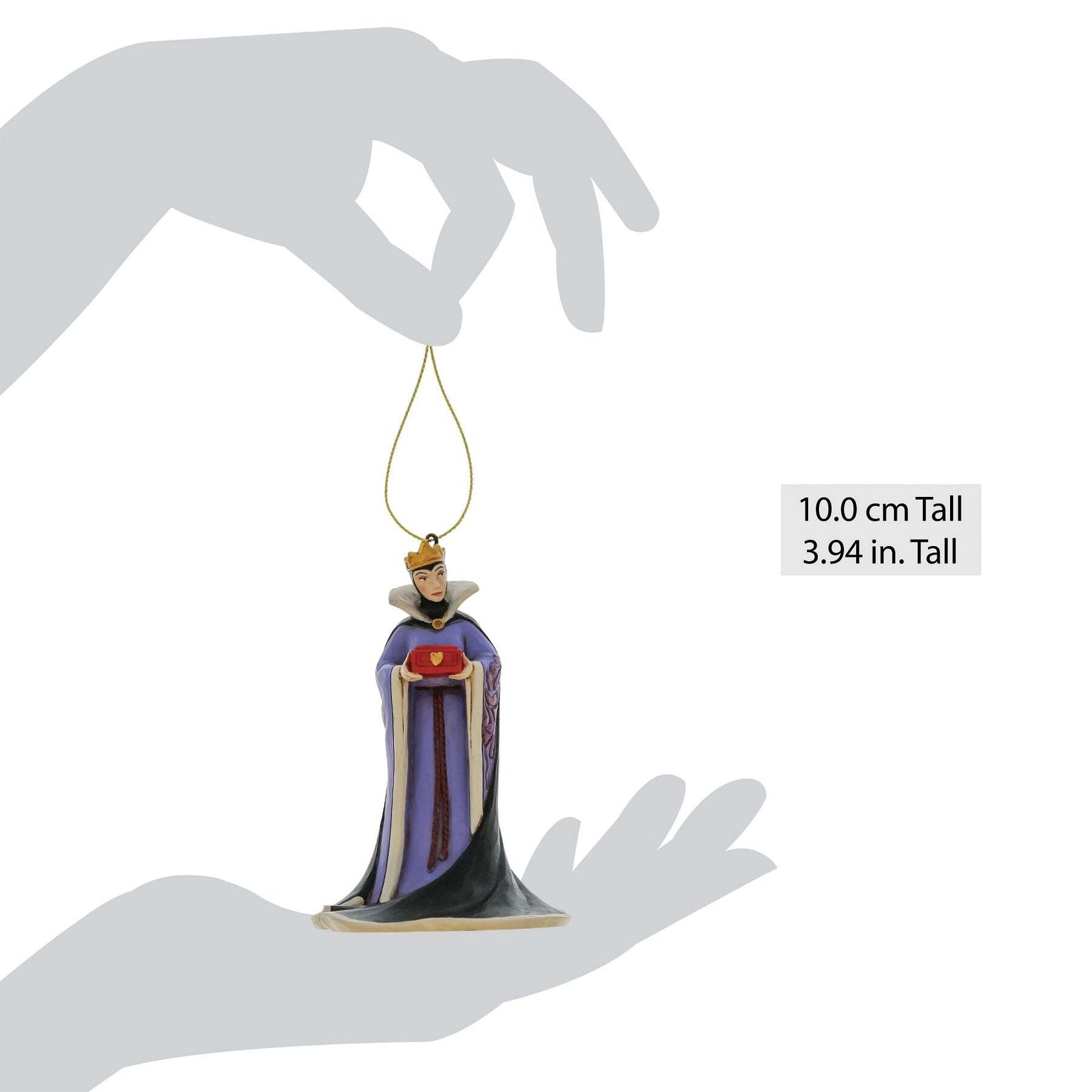 The Witch Queen from Disney's first feature film, "Snow White and the Seven Dwarfs," is hand-crafted. This hanging ornament is perfect for adding a touch of mischief to your Christmas tree. These figurines are not children's toys. For adult use only.