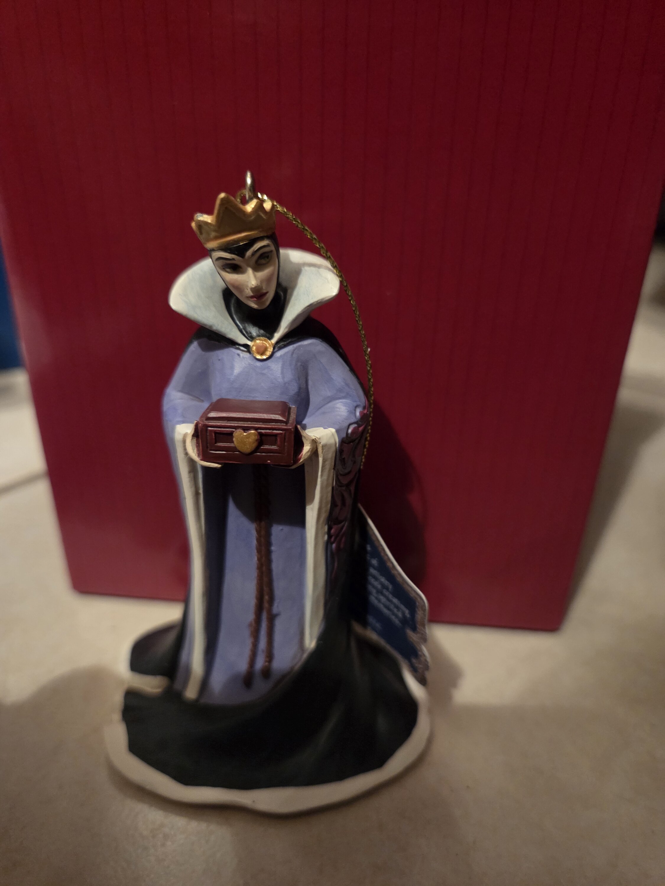 The Witch Queen from Disney's first feature film, "Snow White and the Seven Dwarfs," is hand-crafted. This hanging ornament is perfect for adding a touch of mischief to your Christmas tree. These figurines are not children's toys. For adult use only.