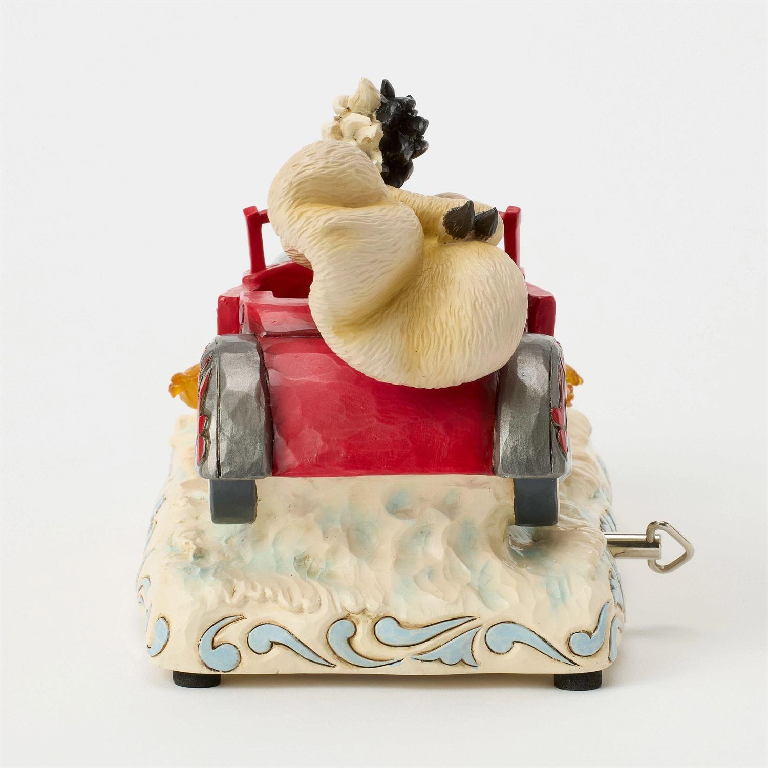 Celebrating the 65th anniversary of 101 Dalmatians, Jim Shore captures Cruella de Vil speeding in her red car adorned with rosemaling and patchwork. Flames burst from the engine as her wild hair and fur coat fly in tune to her signature melody.