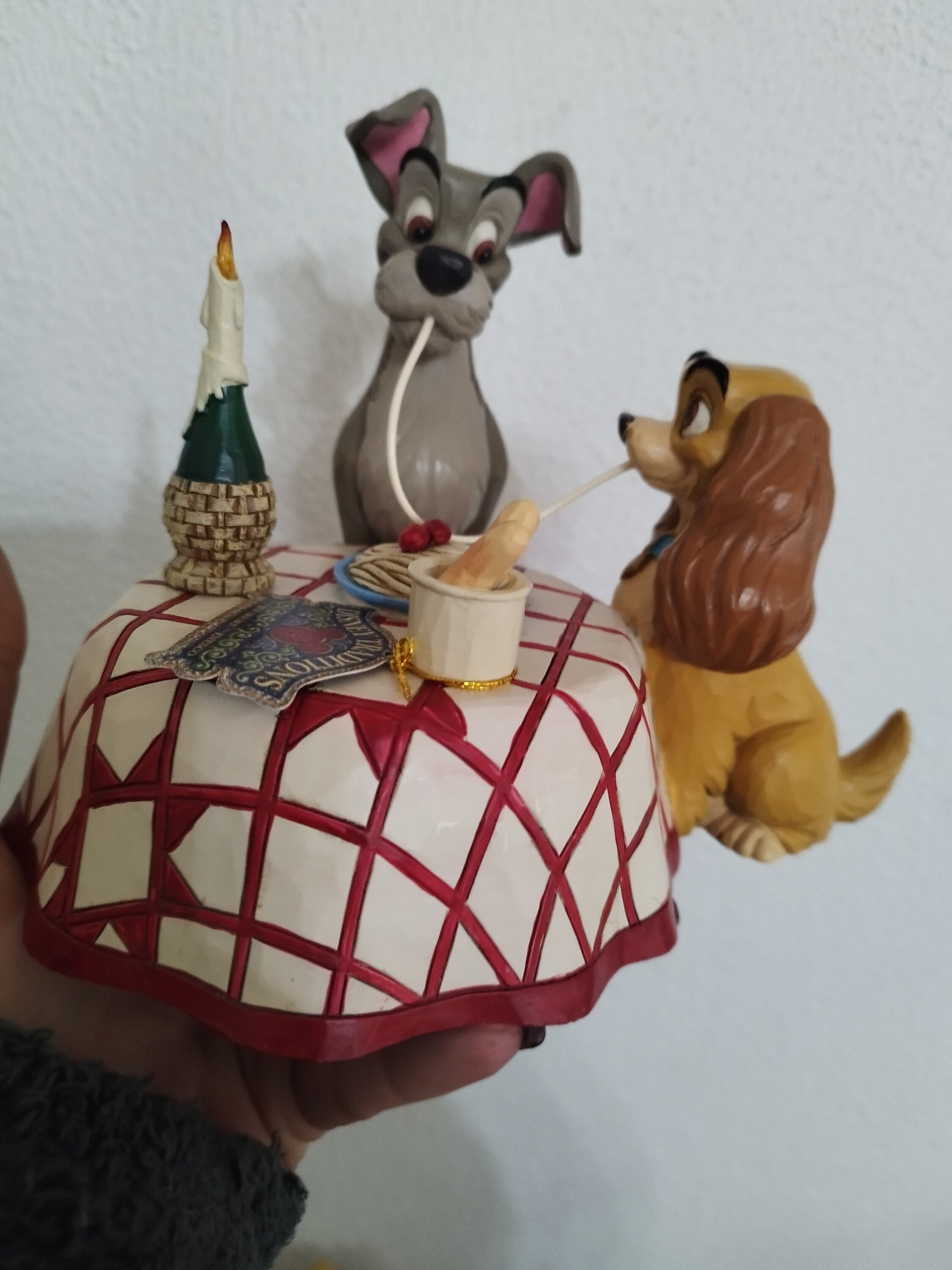 I'm a big fan of Disney movies and I collect figurines, especially those by the artist Jim Shore. This figurine depicts the most famous scene from the film, the one where Lady and the Tramp eat a plate of spaghetti, gazing shyly and tenderly at each other. What viewer doesn't hum the famous romantic song at the end of the film, sung by the Italian restaurant owner accompanied by his accordion? Not daring to look into each other's eyes, the two lovers eat the same spaghetti without realizing it, and it all ends with a kiss. A famous scene, then, that every Disney figurine collector wants in their collection. The piece is well-made, even if it lacks a little finesse for my taste. The diameter of the table is oddly a bit too wide compared to the characters. Perhaps, and it's a good idea, this is to house the battery that powers the candle flame. Overall, I'm happy with this charming figurine, which adds to my Disney collection.