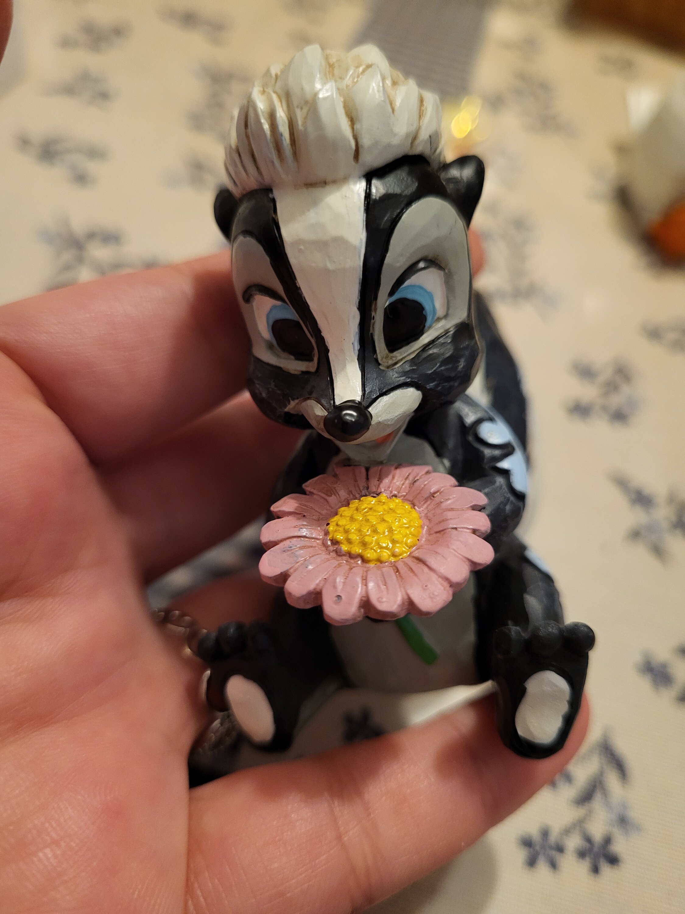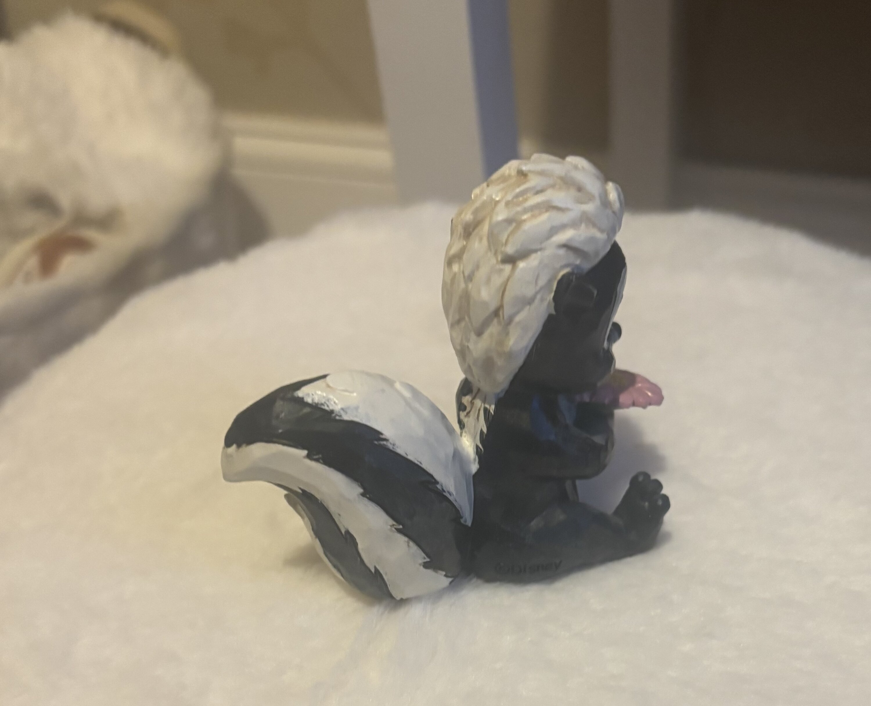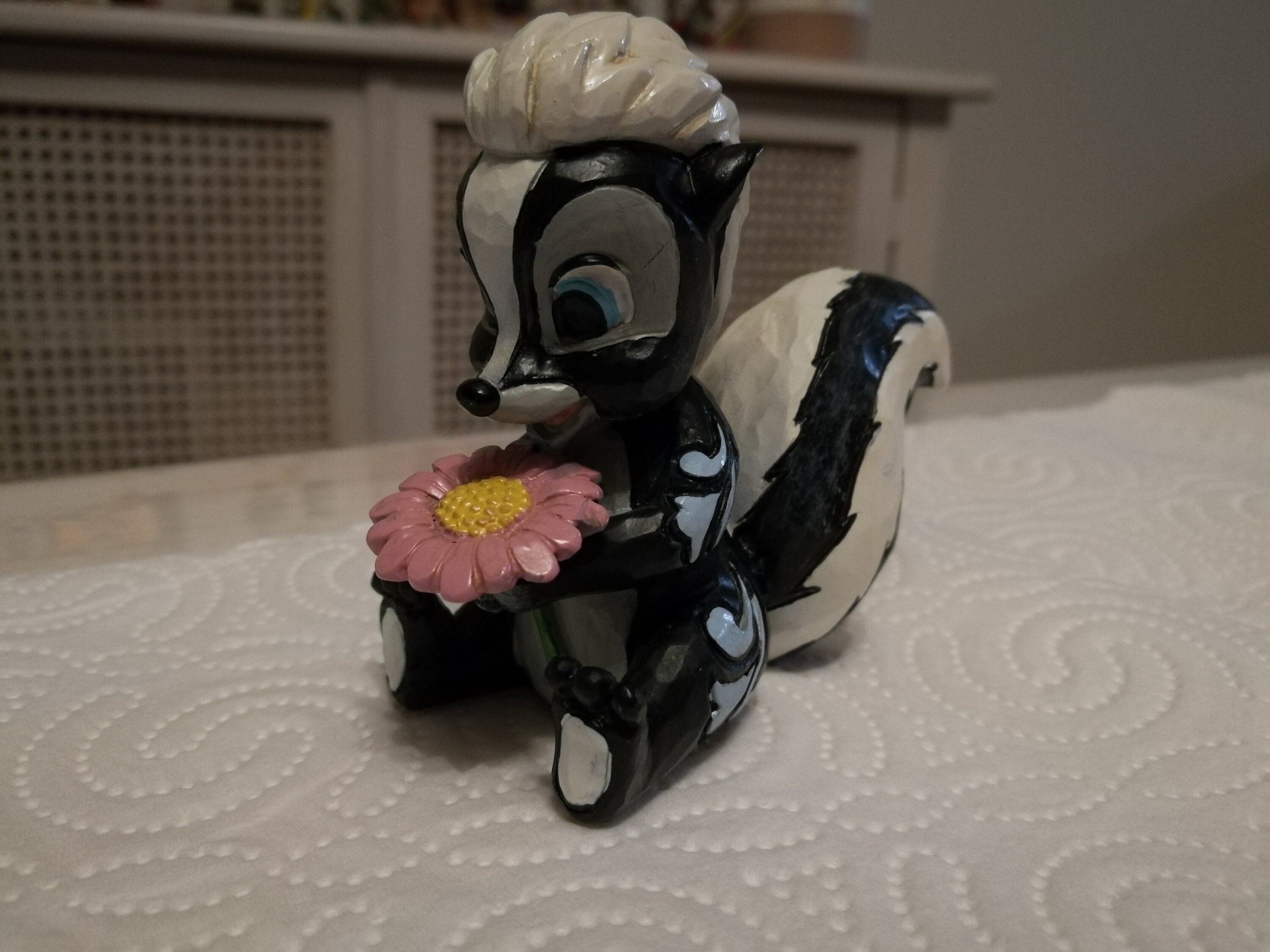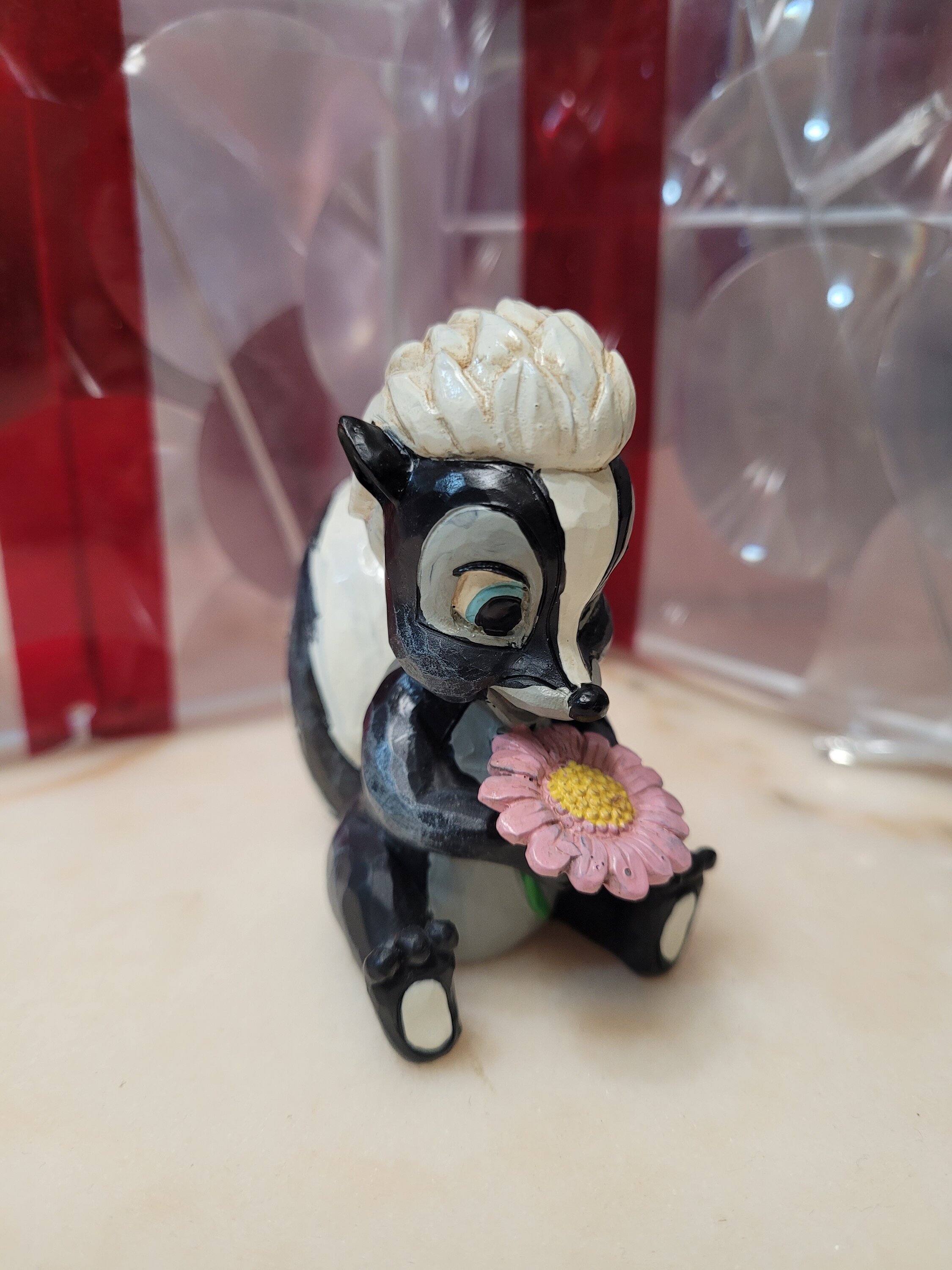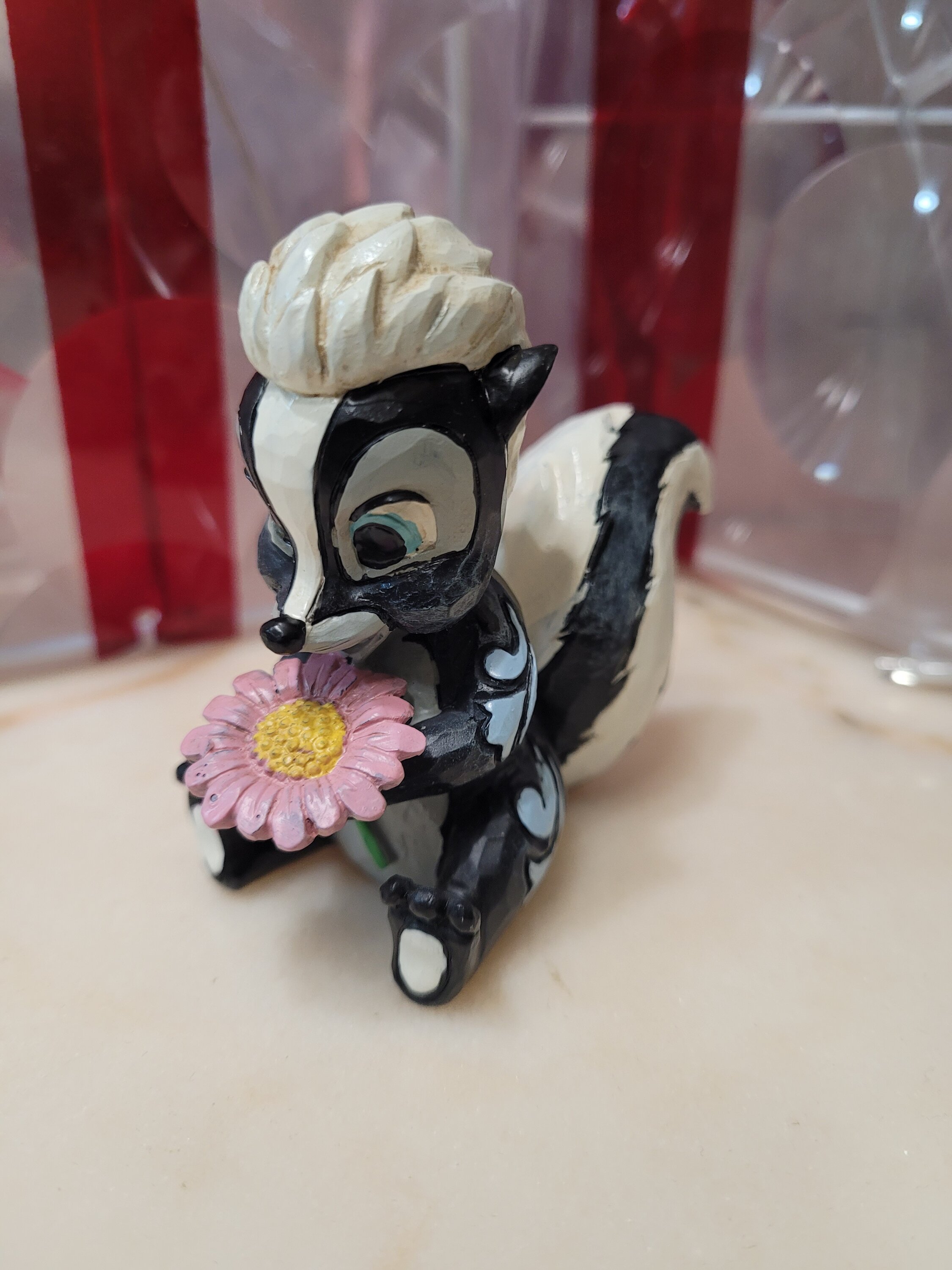This darling Jim Shore miniature features Flower, the skunk from Bambi, adorned with striking rosemaling and holding a handful of fresh flowers. With a bright smile and childlike love, she radiates sweetness and charm.