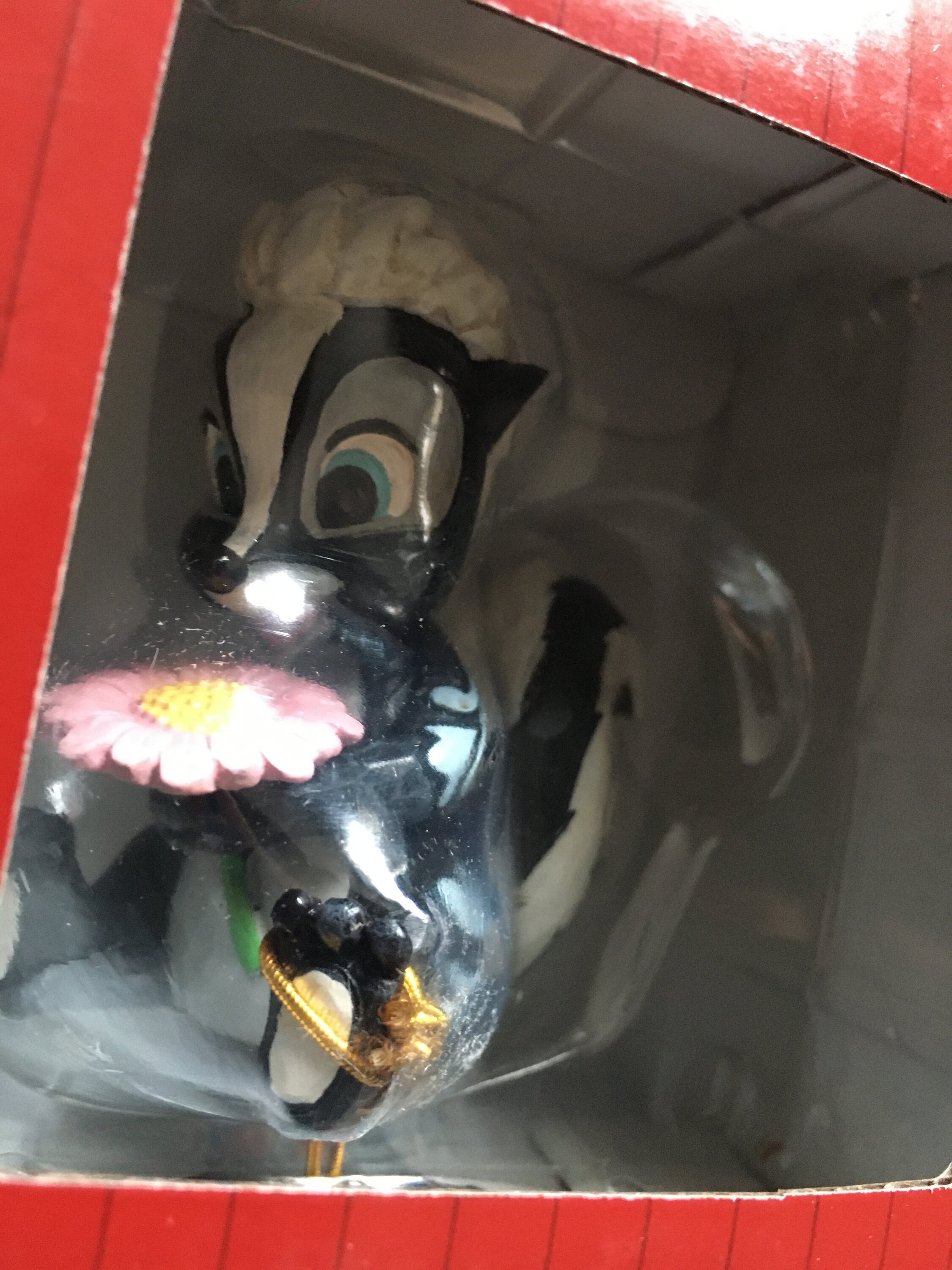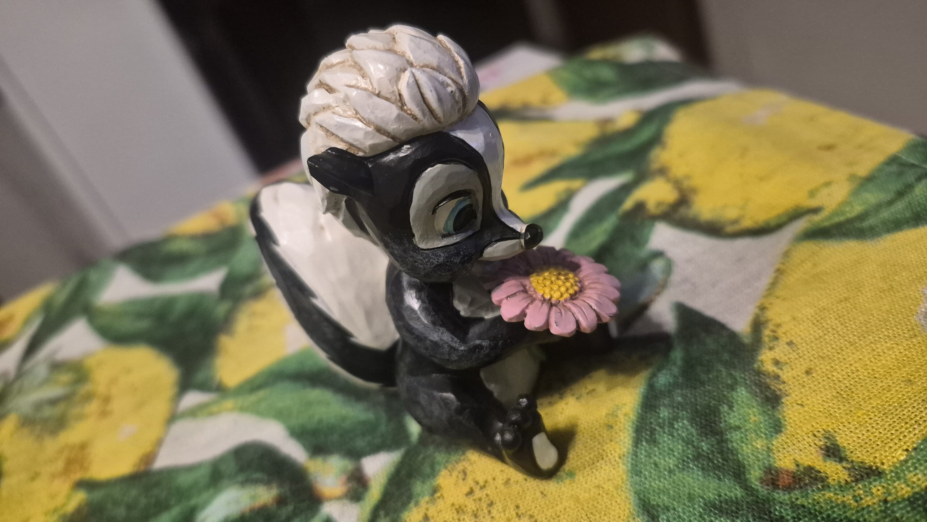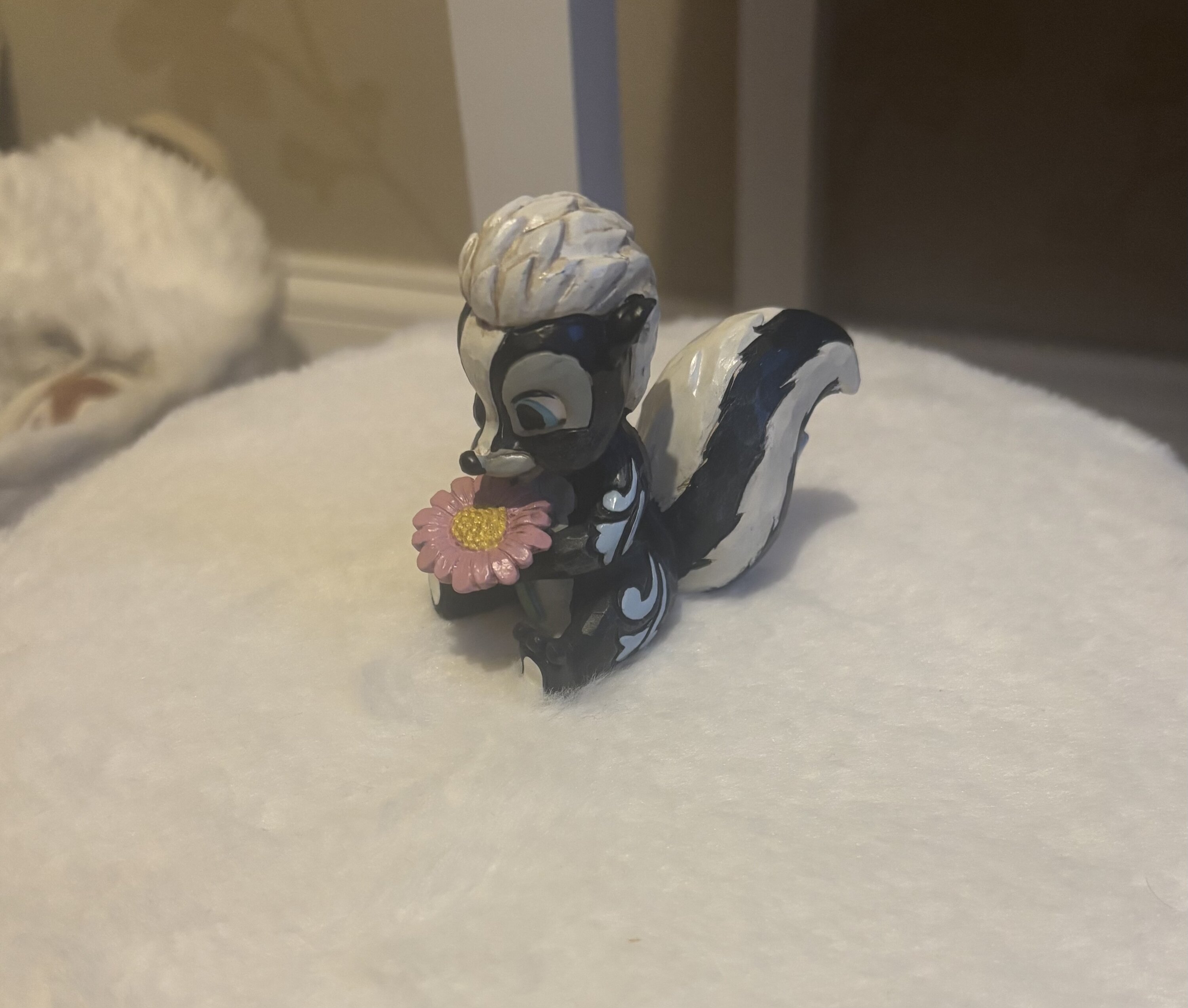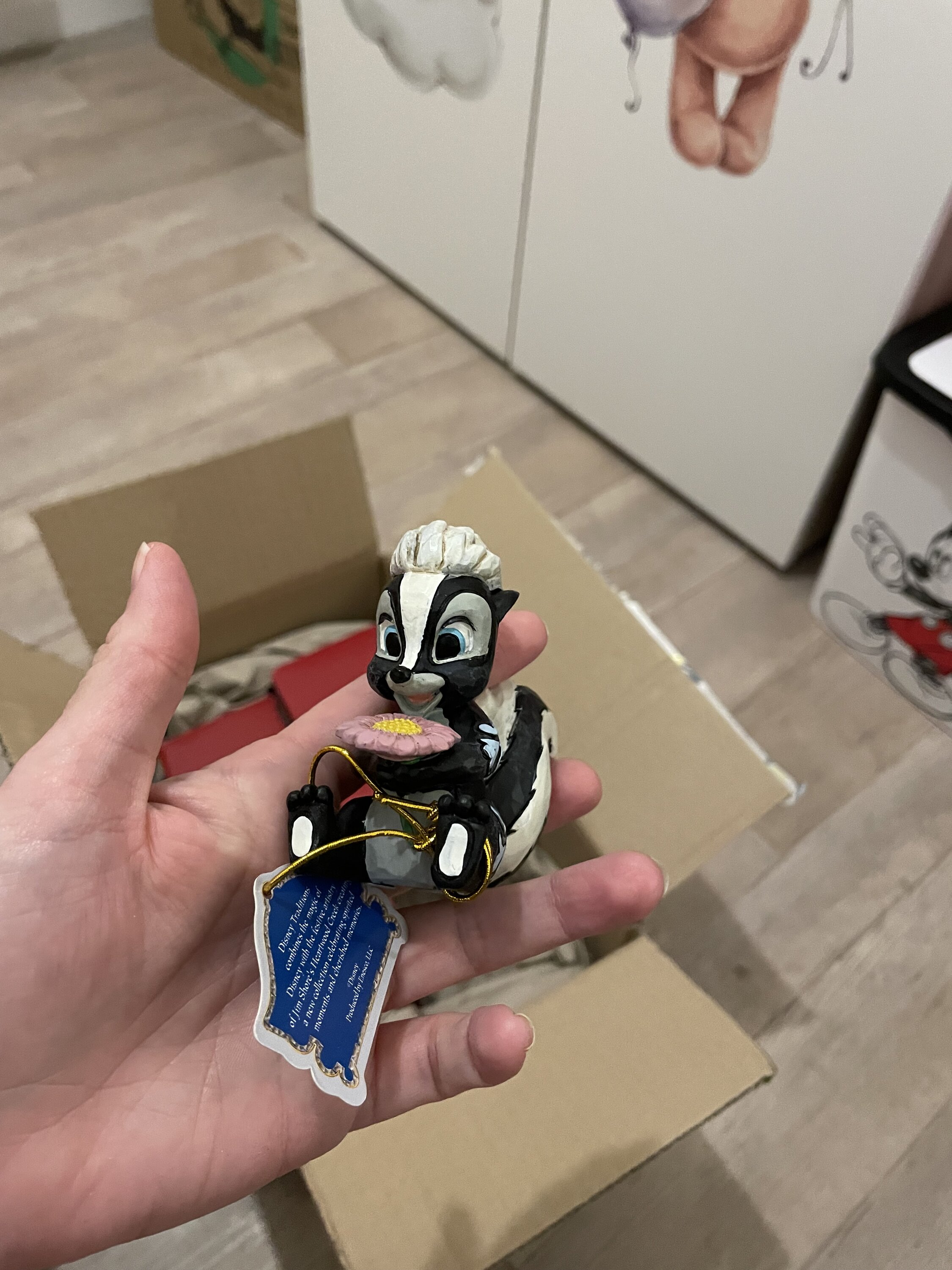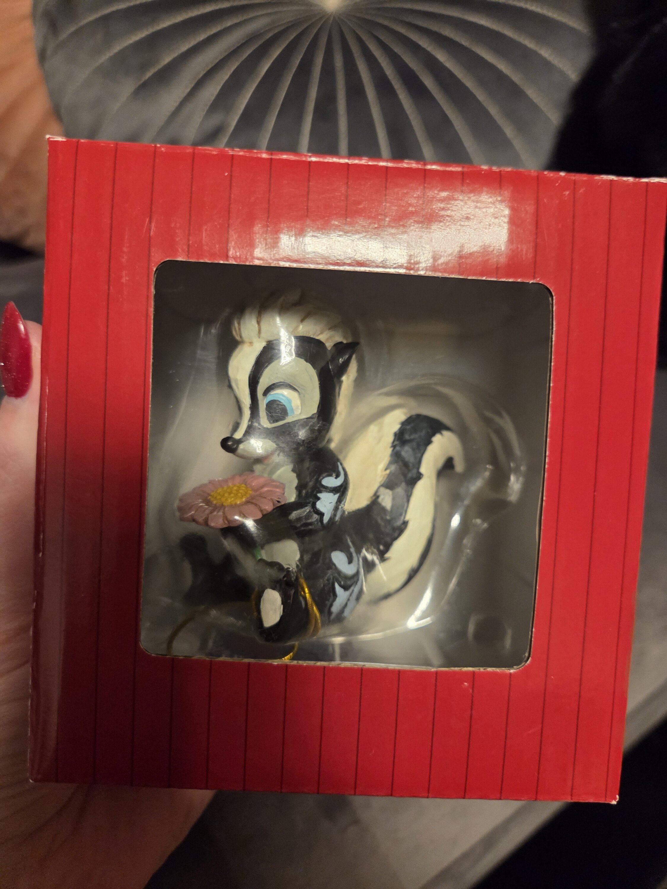 This darling Jim Shore miniature features Flower, the skunk from Bambi, adorned with striking rosemaling and holding a handful of fresh flowers. With a bright smile and childlike love, she radiates sweetness and charm.