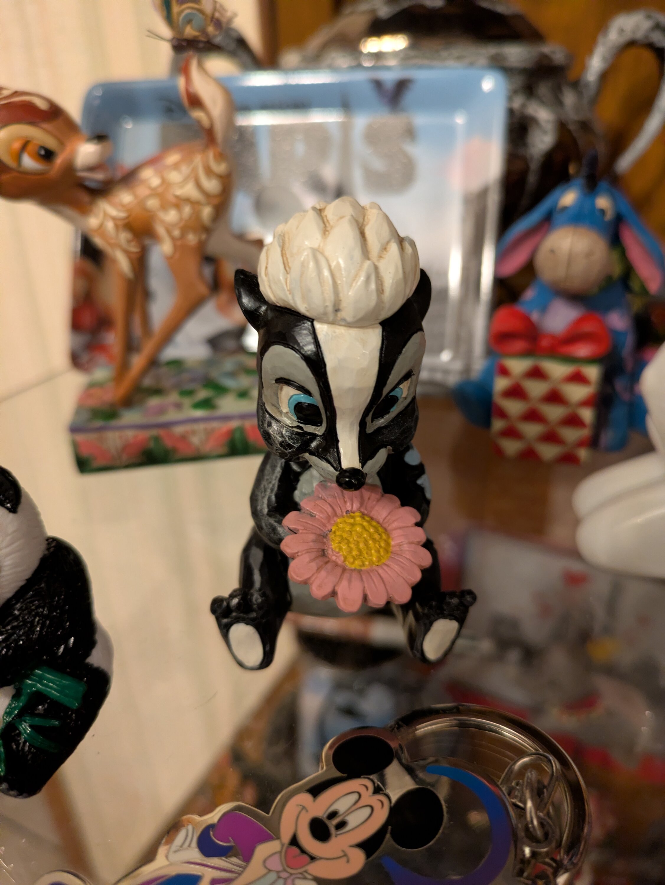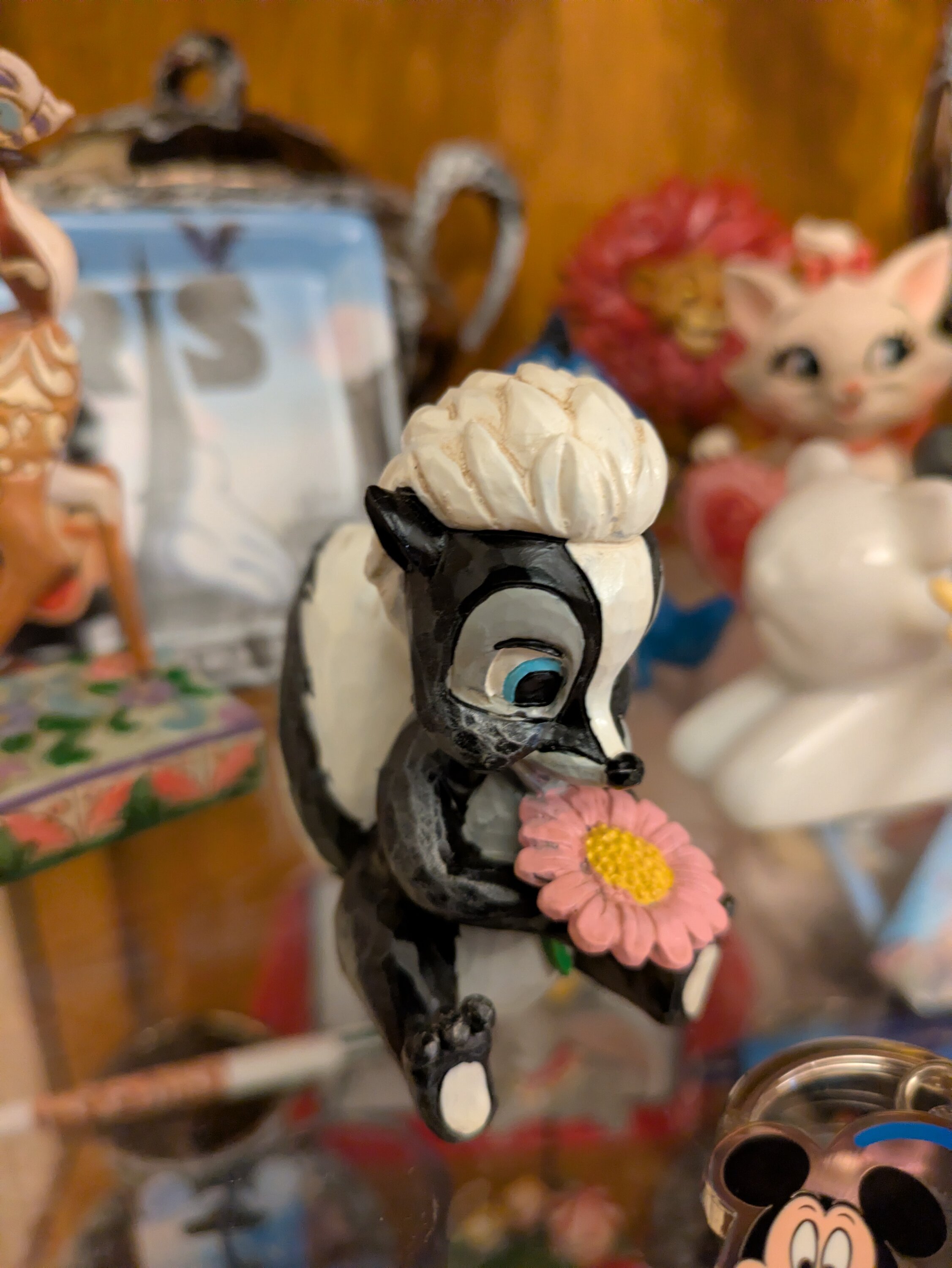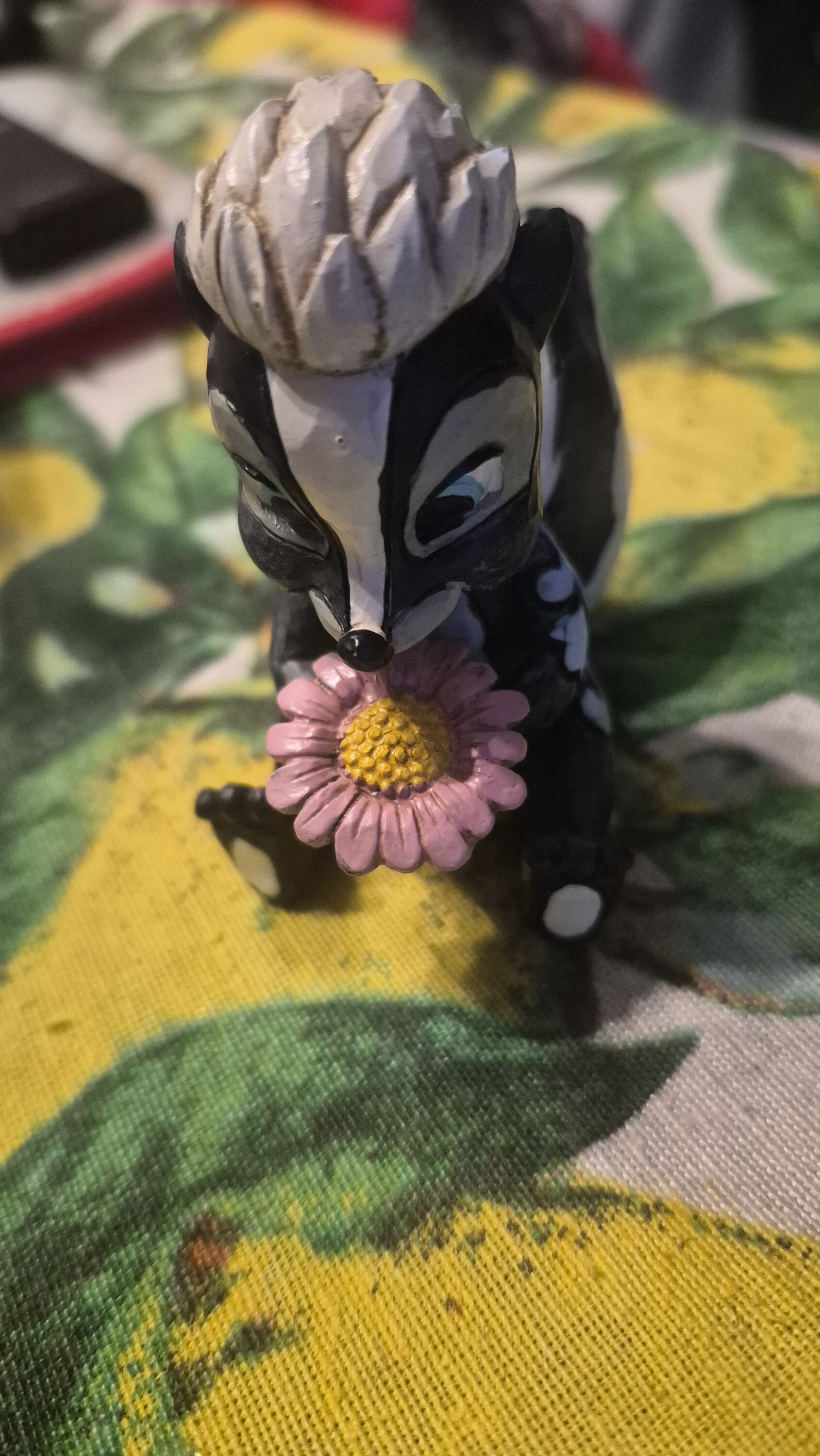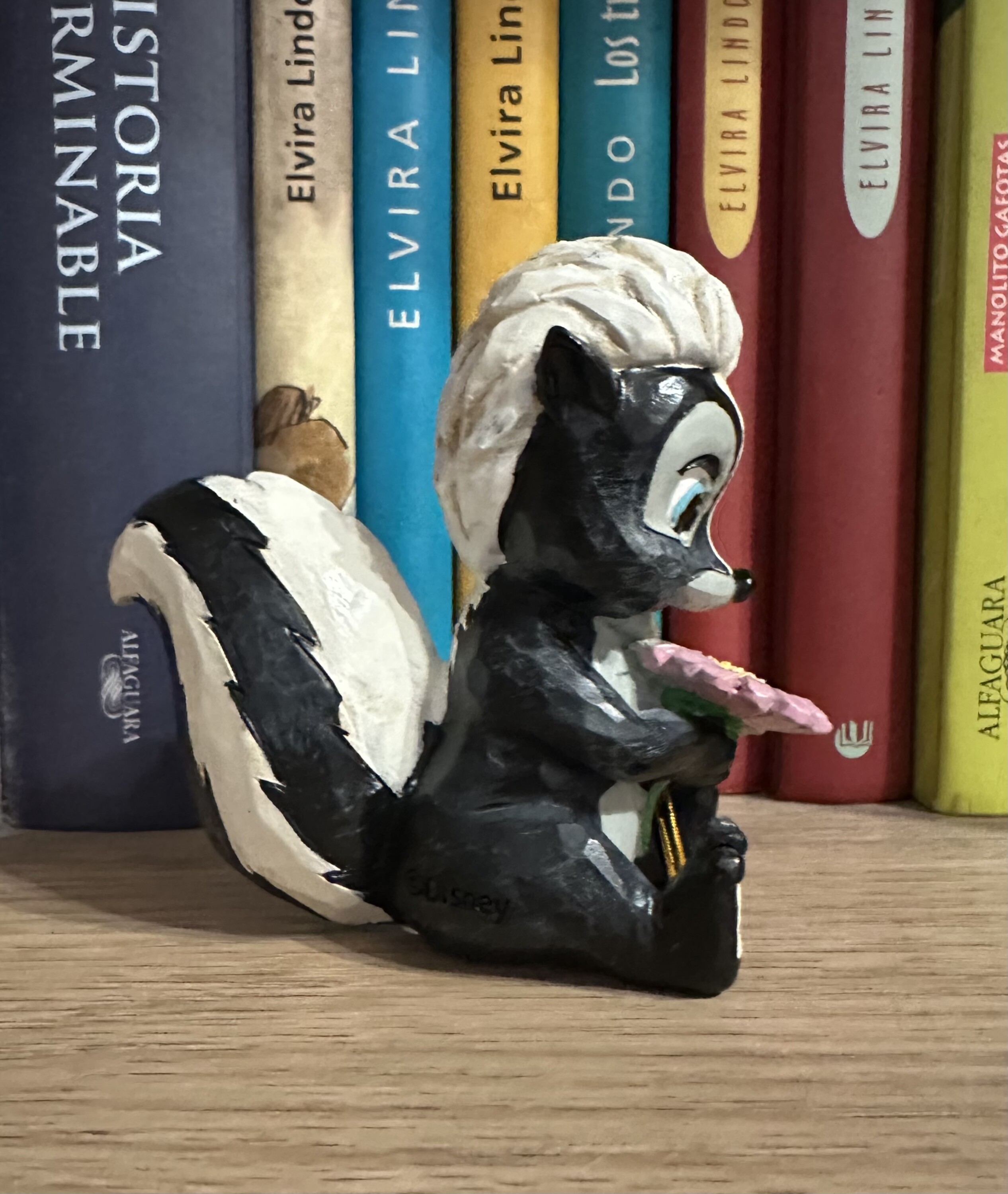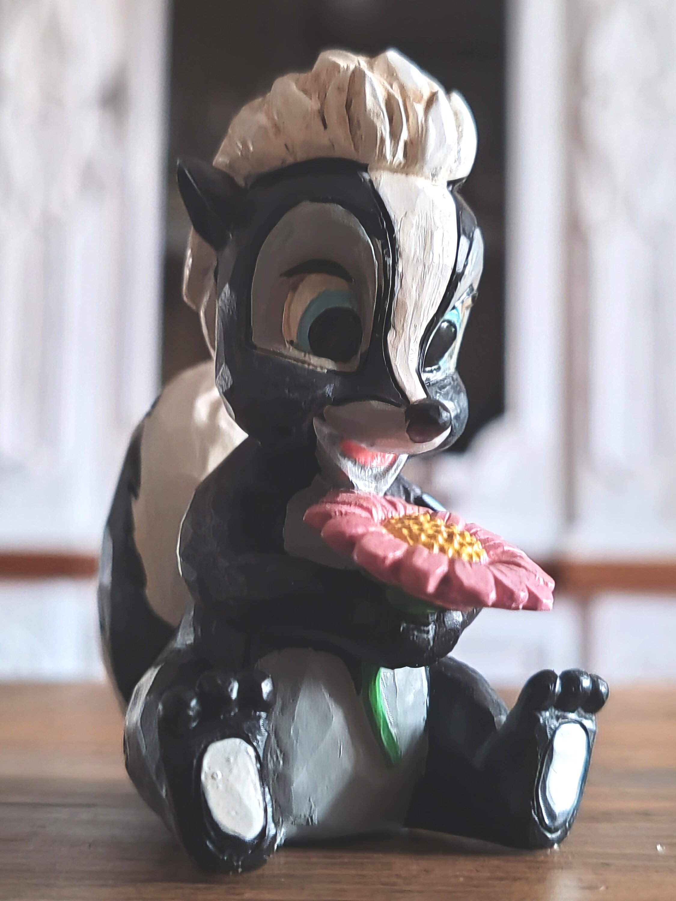 This darling Jim Shore miniature features Flower, the skunk from Bambi, adorned with striking rosemaling and holding a handful of fresh flowers. With a bright smile and childlike love, she radiates sweetness and charm.