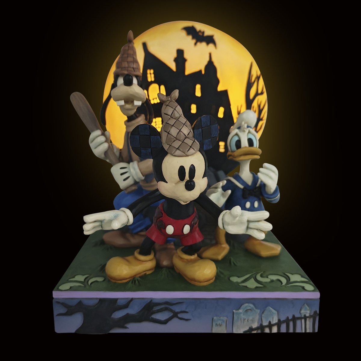 Spooky and nostalgic, Mickey Mouse teams up with Goofy and Donald in this striking Disney Traditions sculpture inspired by Lonesome Ghosts. Set against a glowing moon and a haunted house silhouette, the trio bravely faces the playful spirits of Halloween night. A beautifully detailed piece that blends classic Disney animation with Jim Shore’s signature folk-art style, perfect for Halloween displays and collectors alike.