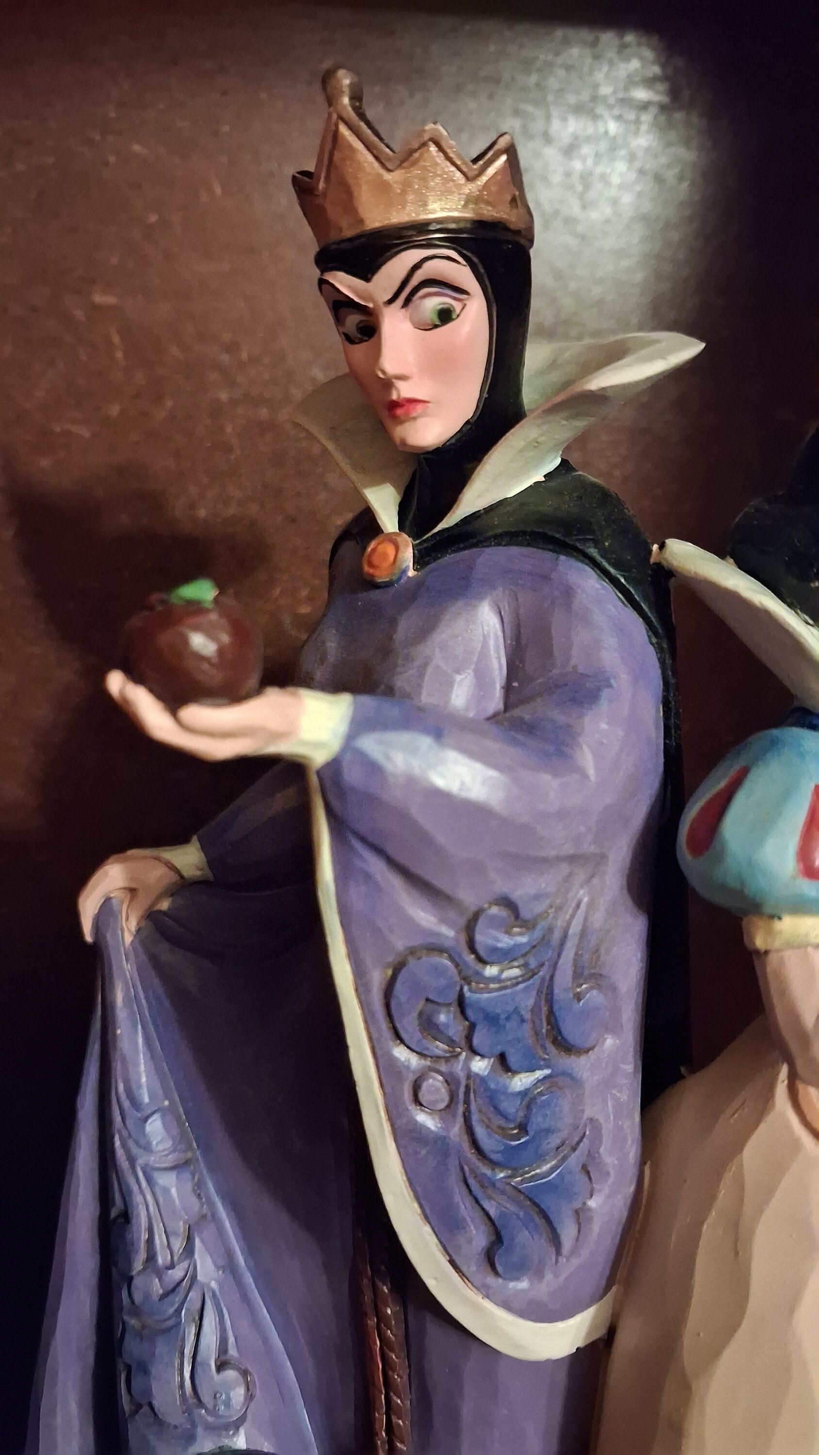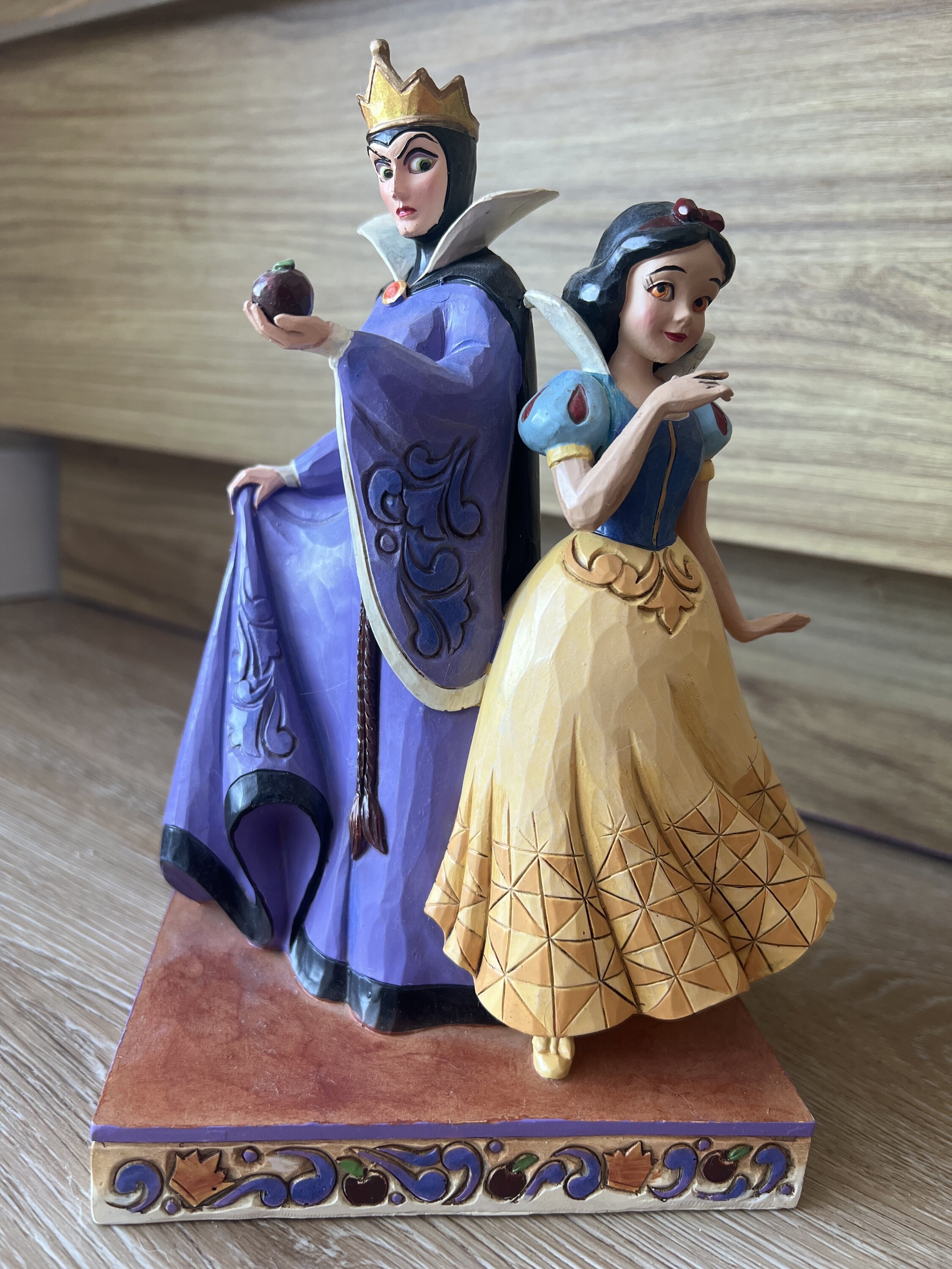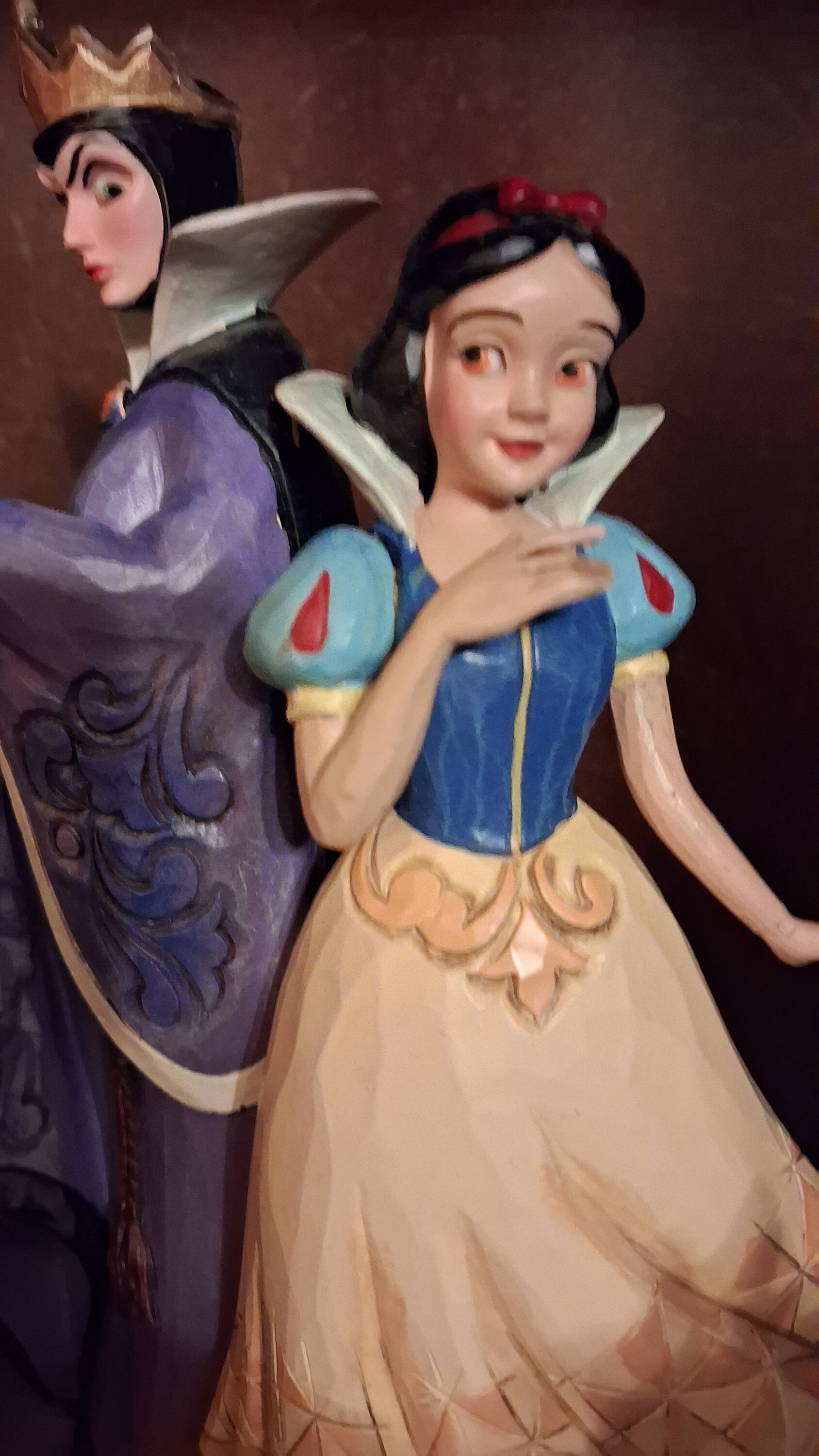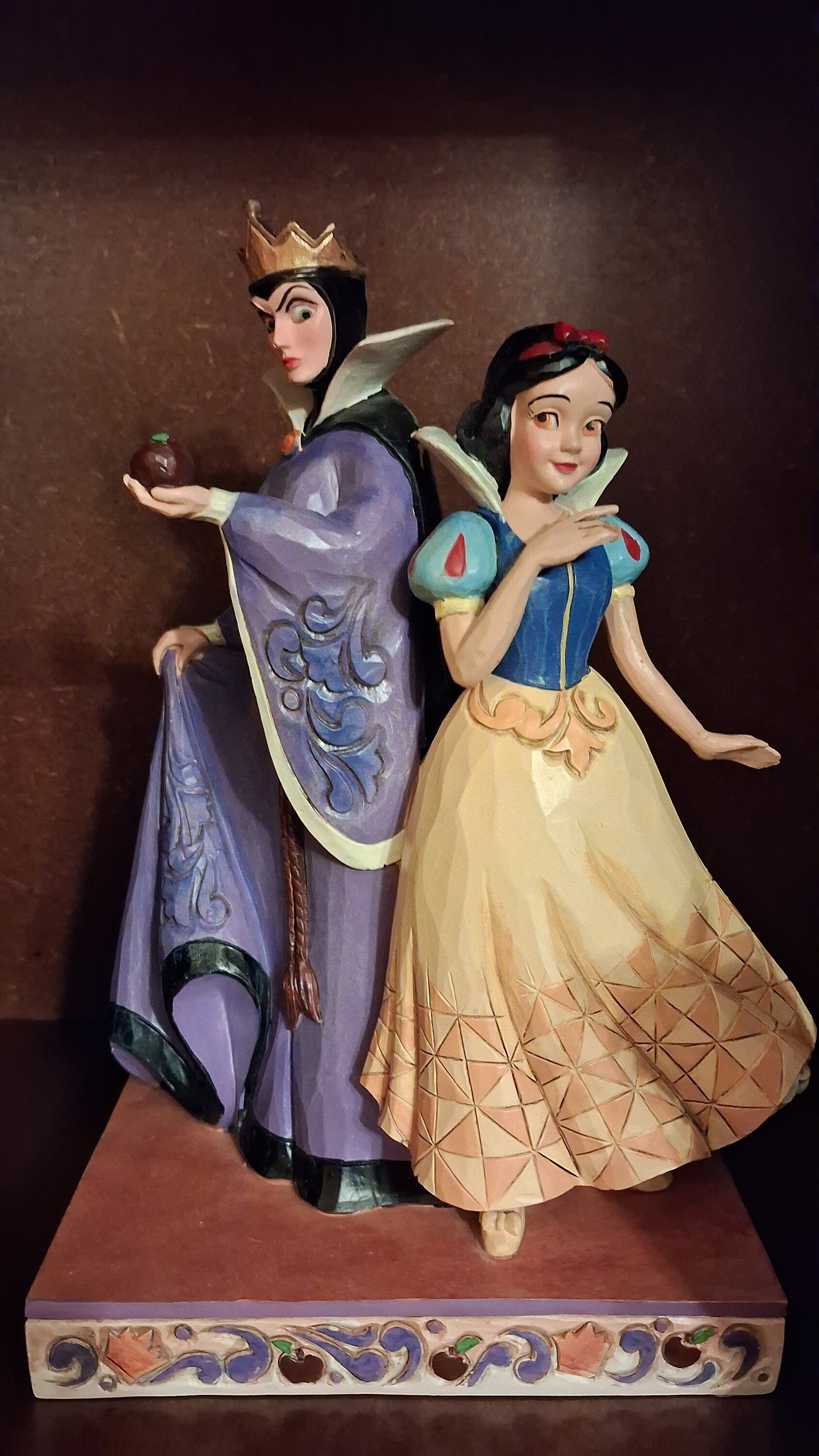 The Enesco figurine of Snow White and the Evil Queen immediately struck me with its detail and the beautiful contrast between the two characters. Snow White is delicate, while the Queen is truly intense and dramatic. The colors are exquisite, and it looks even better in person than in the photo. It's a simple yet effective piece, and I'm happy to have it in my collection.