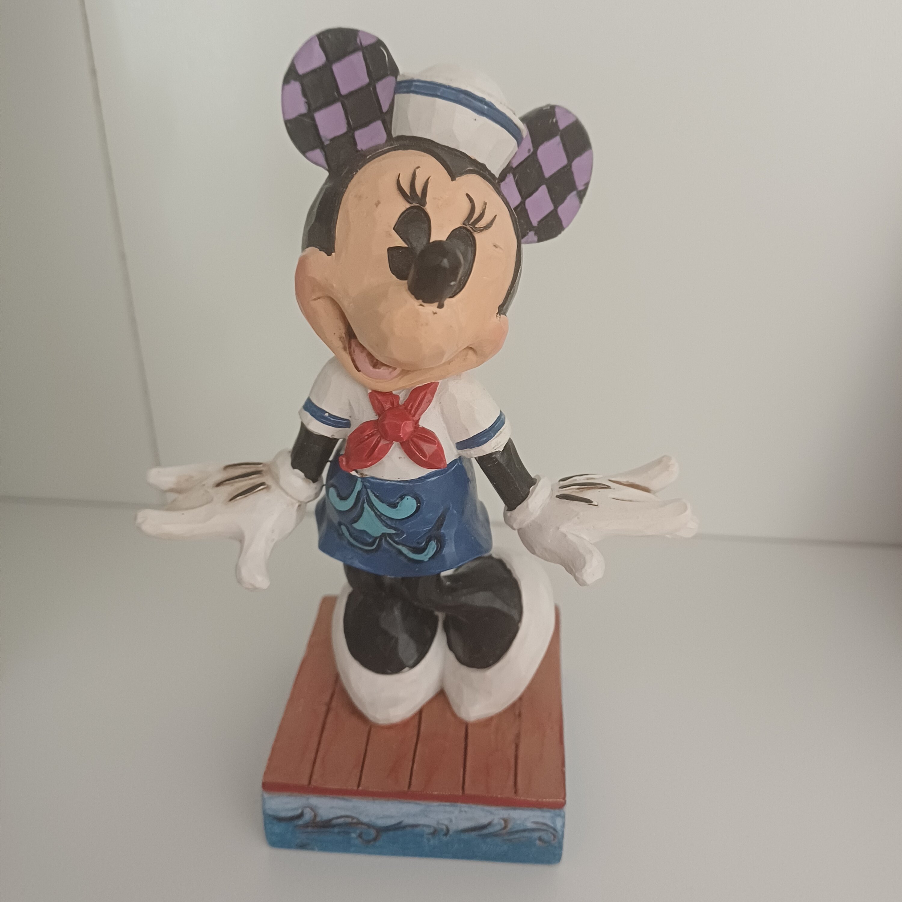 Handcrafted to the finest detail, this colorful Jim Shore Minnie will delight any Disney lover. Hand painted with folk art designs, this cute, fun mouse patiently waits for Mickey to help him board the ship.