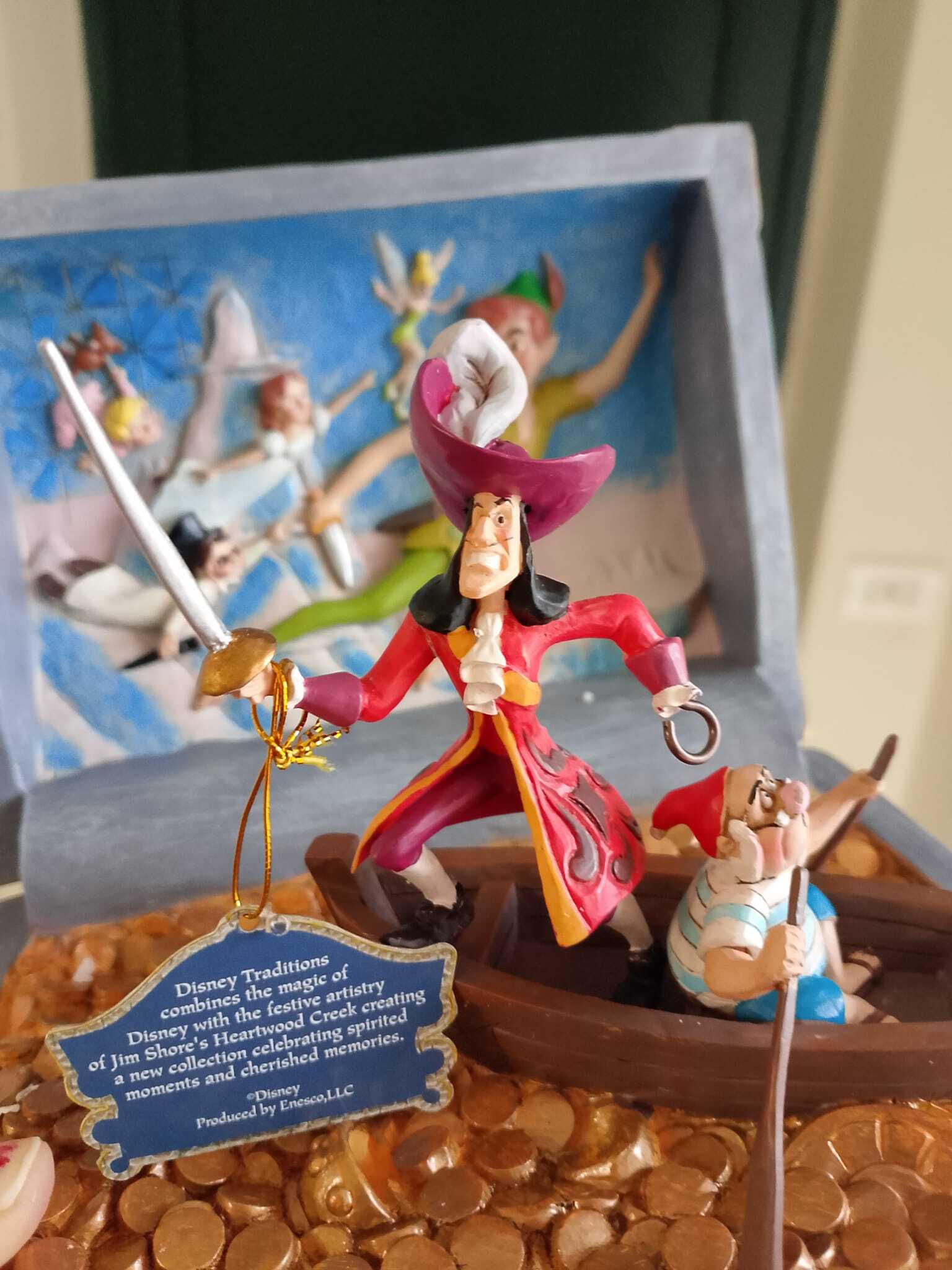 Si vous aimez les chasses aux trésors alors cette figurine est pour vous !!! On y vois le cap’tain Crochet et monsieur Mouche naviguant sur un océan de pièce d’or .. avec en fond peter pan et ses amis !! Jim Shore