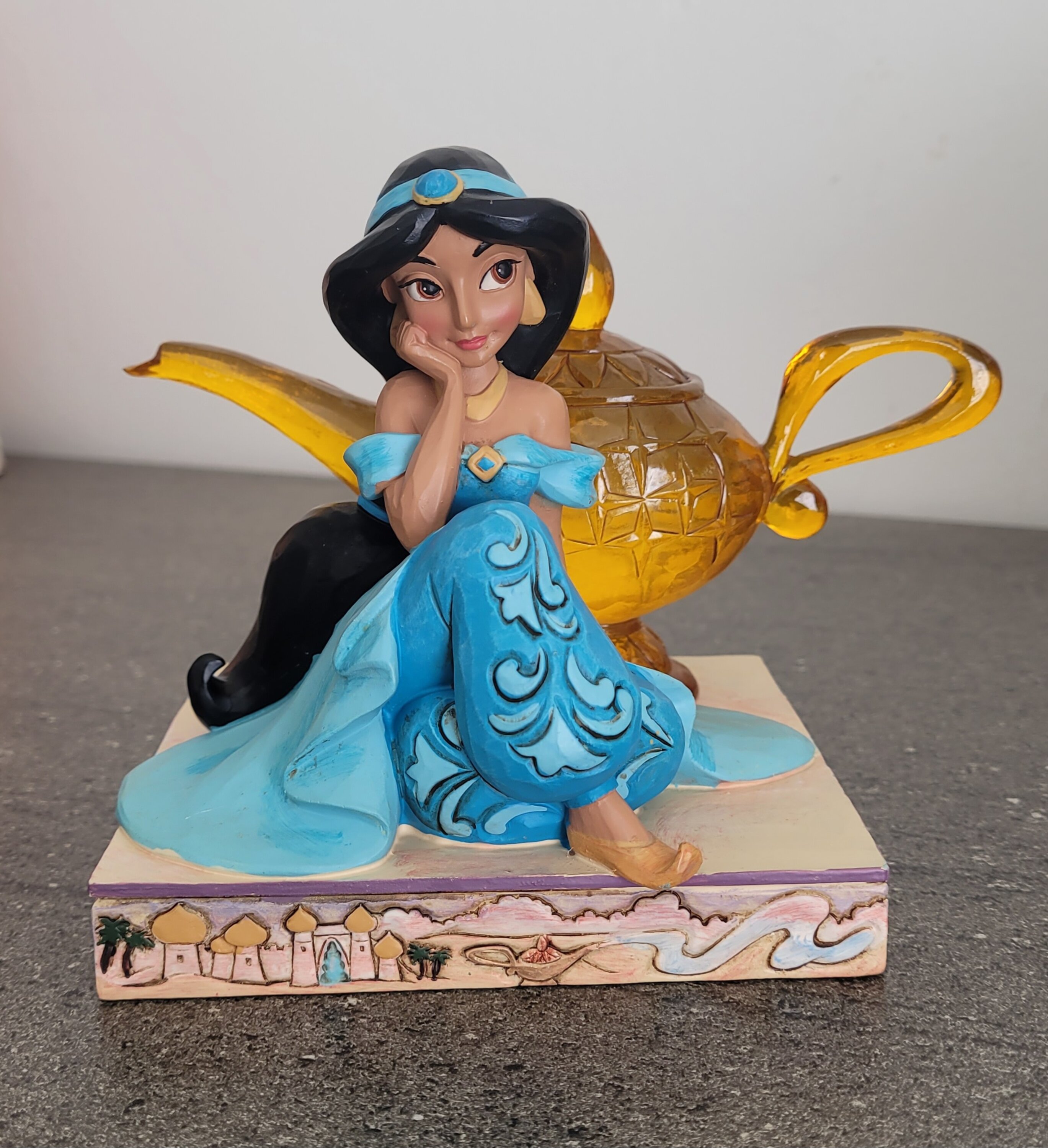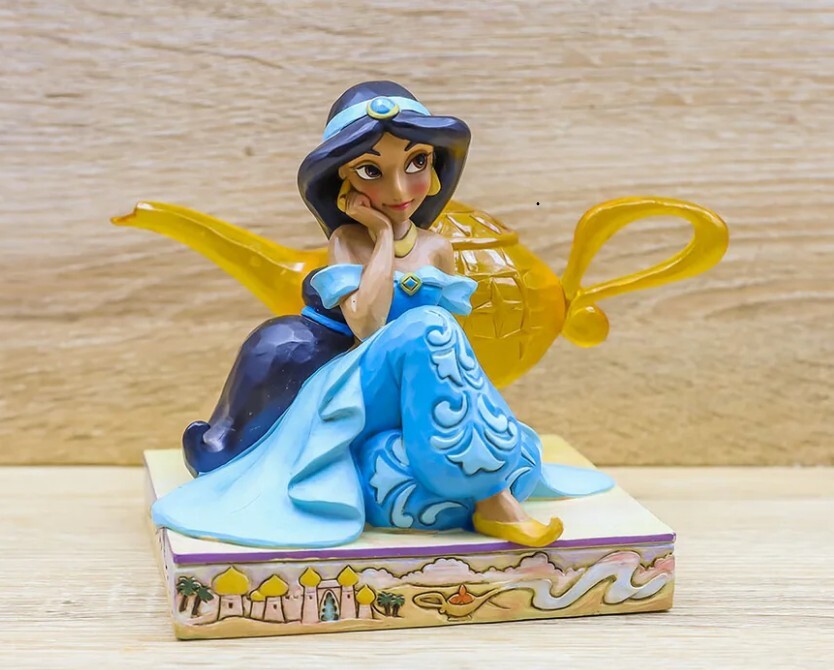 This Disney Traditions line presents the emblematic Disney princesses with their accessories highlighted in a transparent resin. This piece depicts Jasmine imagining a new life next to the Genie's lamp.
