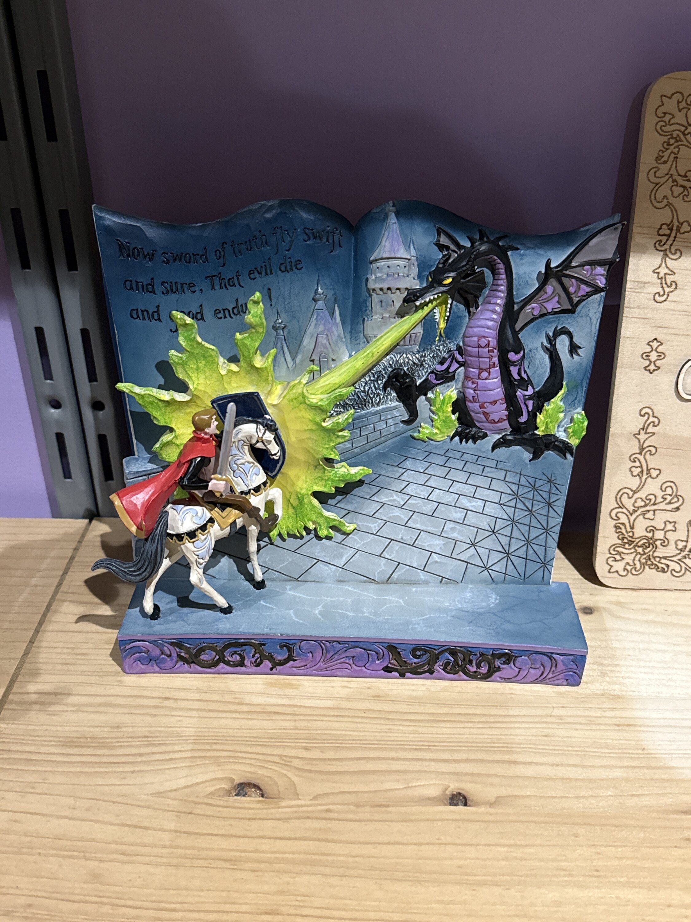 Fin da bambino (e ormai sono un vecchio) mi è sempre rimasto impresso il combattimento del principe Filippo contro Malefica, perché, ancor prima della maggior parte degli eroi e supereroi vari, già negli anni 50 e con solo spada e scudo egli si apprestava a combattere, senza alcun superpotere, contro nientepopodimeno che un drago. Sarebbero dovuti passare decenni ancora prima di rivedere uno scontro di fantasia epico di questa portata. Quindi questo soprammobile ha catturato subito la mia attenzione, quando l'ho visto. In realtà, purtroppo, il suddetto spezzone non è mai veramente stato riportato in nessuna maniera nel merchandise fino a questo momento, o almeno credo. È molto piccolo, circa 15 cm, ma non potevo non prenderlo ed è fatto piuttosto bene... non amo l'effetto legno ma in questo caso non mi dà fastidio e la scena ripropone bene l'epico scontro. Purtroppo mi è arrivato danneggiato ma non per colpa del venditore, in quanto, anche se ben imballato all'interno, è fragilissimo in alcuni punti come la spada... ma sono riuscito a ripararlo senza che si veda nulla, ma ho una certa esperienza in merito.
