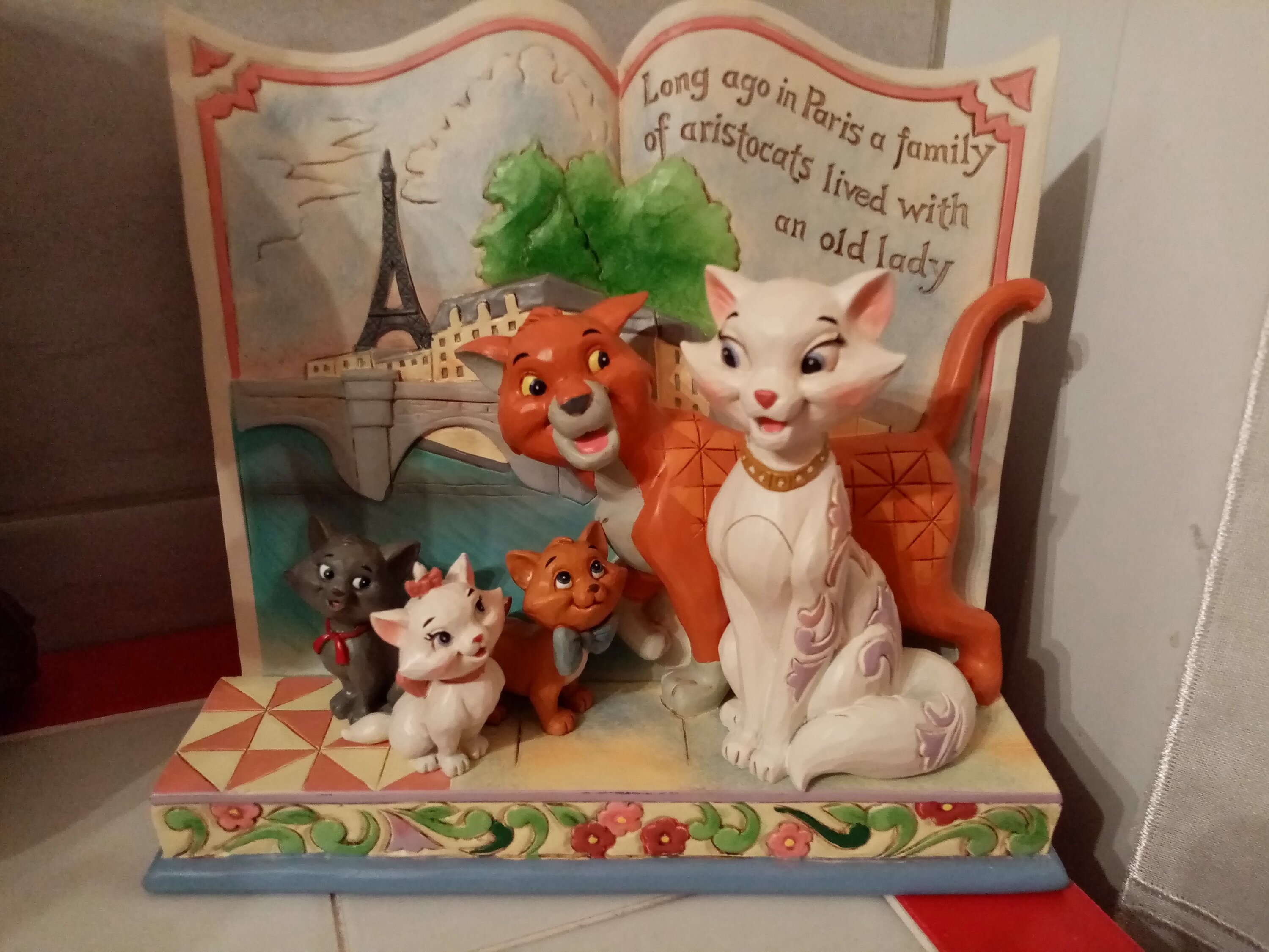 Here is a magnificent statuette with magnificent details and colors that completes my Disney Jim Shore collection. This Artist is truly excellent. The object is designed like an open book behind which is the title The Artitochats written in gold letters. The decor represents a view of Paris with the Eiffel Tower drawn as in the animated film. At the top we can read poetically "A long time ago in Paris a family of Aristocats lived with an old lady". The characters look at each other with joy and love. I am impatiently awaiting the release of Jim Shore objects for pre-order. The one with the legendary scene from Lady and the Tramp at the Italian restaurant, the two intimidated lovers eating the same spaghetti without realizing it, all ending with a dip. And the statuette of the famous poetic scene where Cinderella cleans the floor while admiring her reflection in the soap bubbles. Thanks also to Cadeaucity for sending me the packages so quickly. I am always amazed to receive them only two days after ordering.