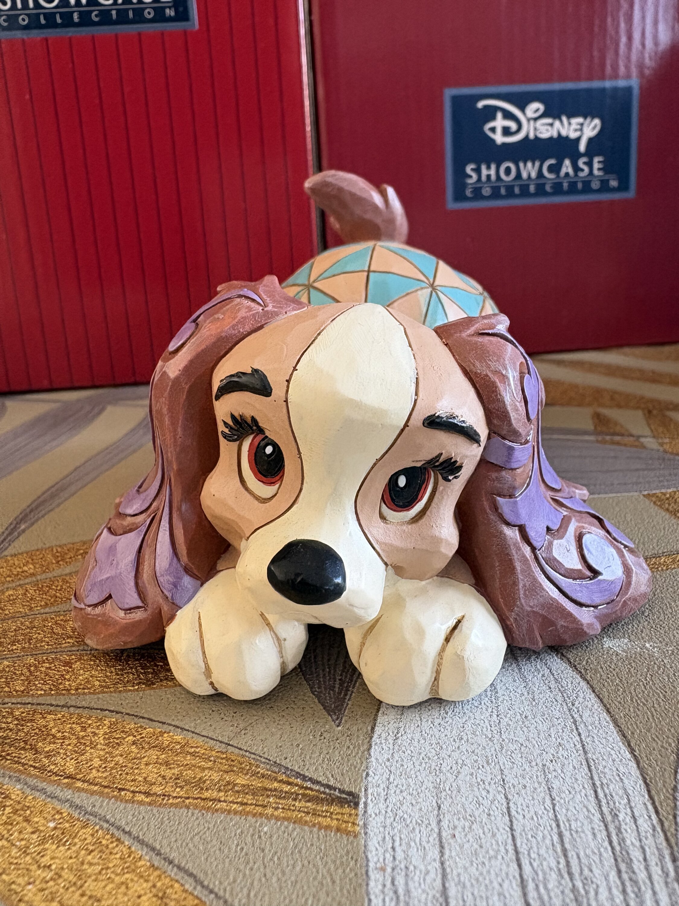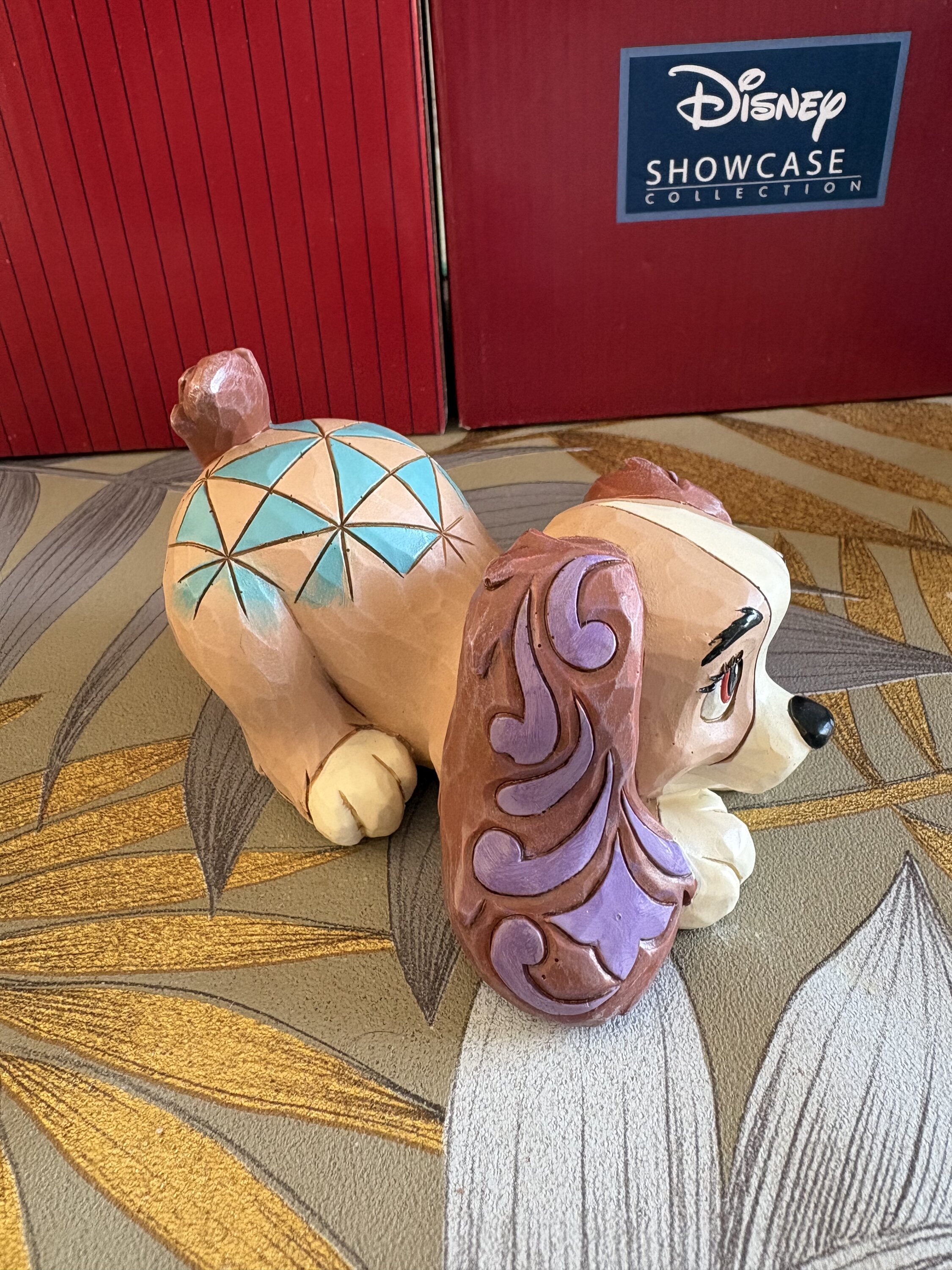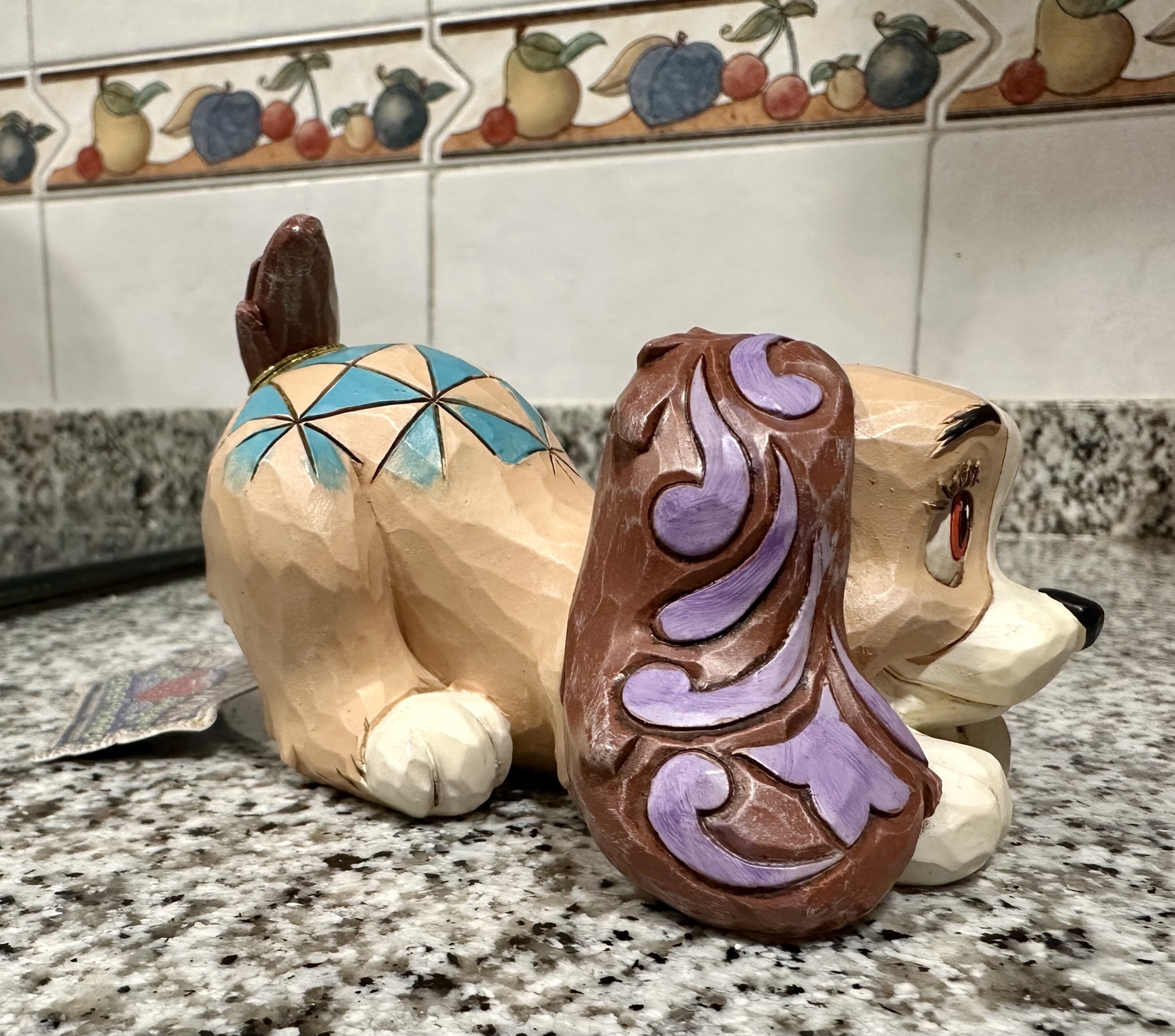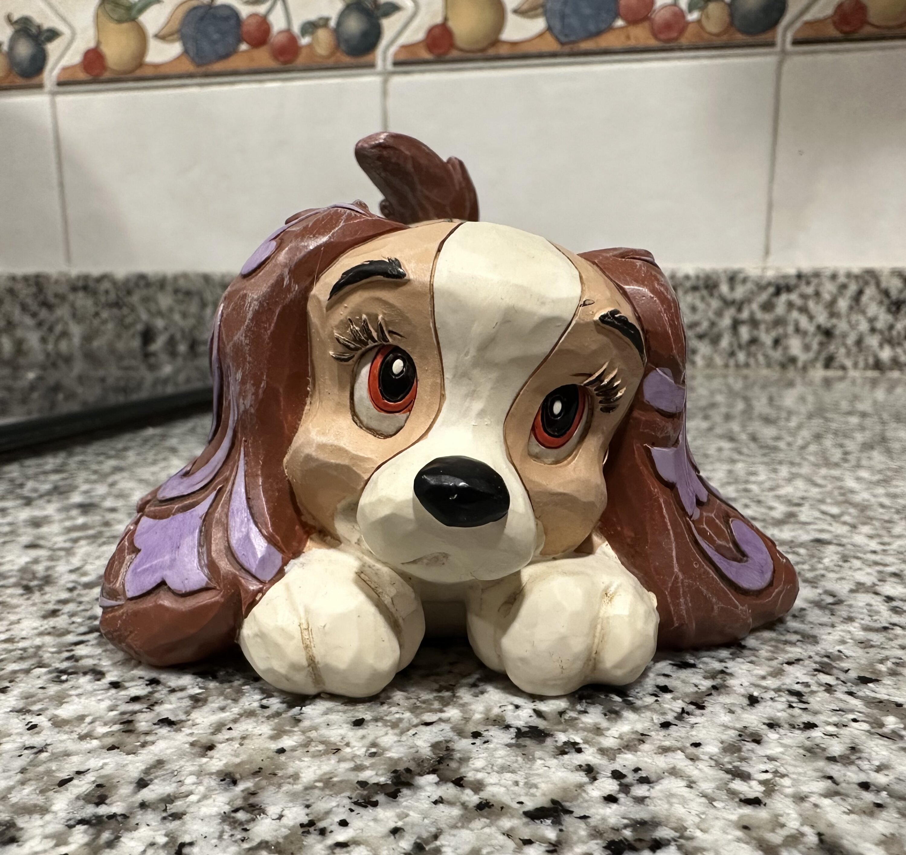 Inspired by Lady and the Tramp, this miniature creation by Jim Shore features the beloved dog, Lady, with the artist's signature rosemale and patchwork design. The colorful replica is a charming addition to any Disney lover's home decor.
