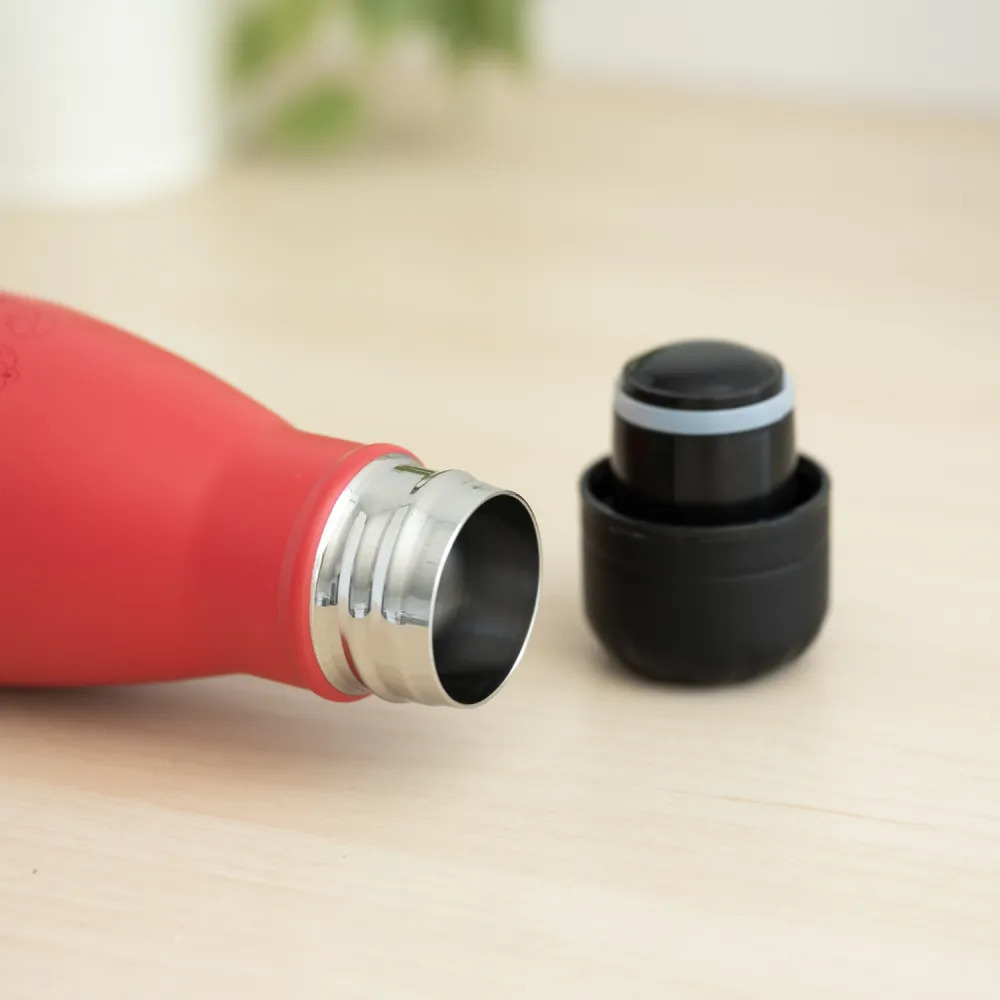 Double-walled stainless steel bottle. Keeps drinks hot for up to 12 hours and cold for up to 24 hours. Features a leak-proof cap.