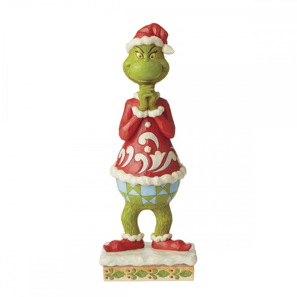 Grinch with his hands clasped below his chin thinks about his plans to steal Christmas. Jim Shore captures the colorful personality of the Grinch in this handcrafted 20" statue, while adding his own unmistakable folk-art design.