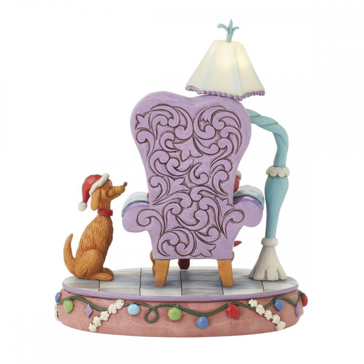 This figurine features the Grinch sitting comfortably in a blue and purple armchair. The Grinch reads his book dressed as Santa Claus. Her faithful dog, Max, sits next to her. If it's too dark, turn on his lamp so the Grinch can continue reading. From the Grinch Collection, designed by award-winning artist and sculptor Jim Shore. Each figurine is hand painted and slight color variations are expected, making each piece unique. Packaged in a gift box. These items are not children's toys. Intended for adults only.