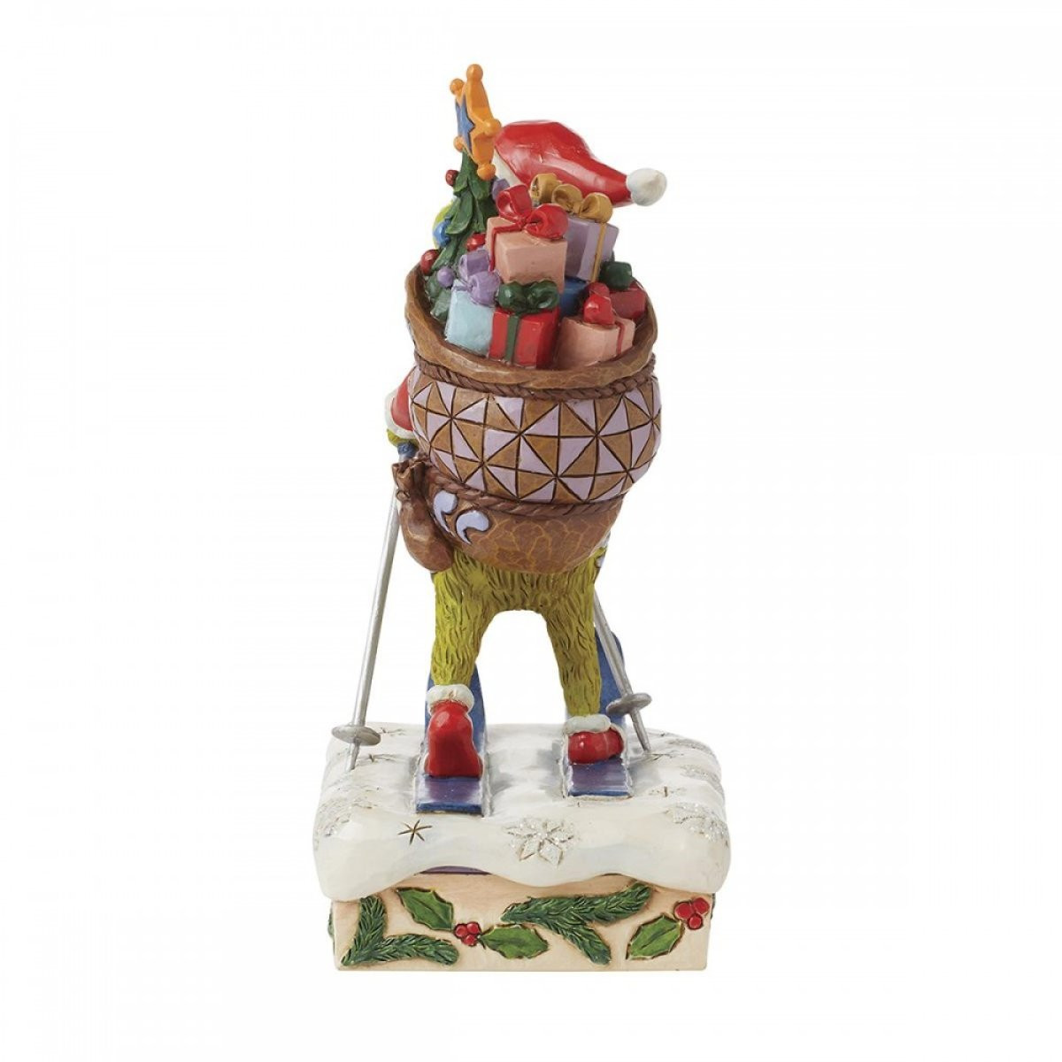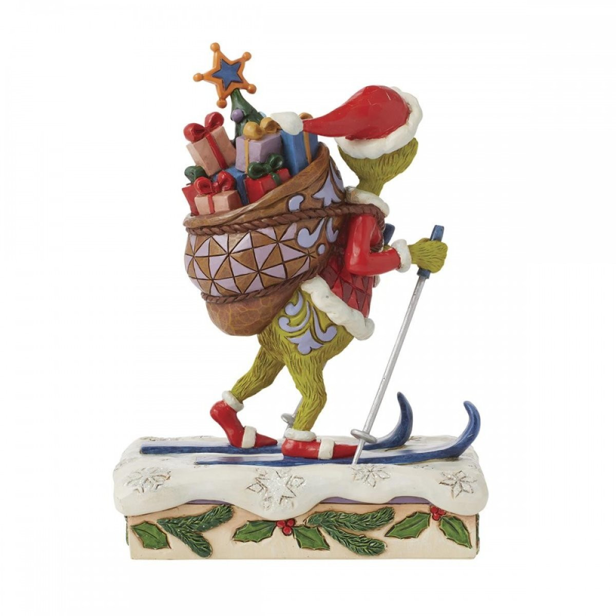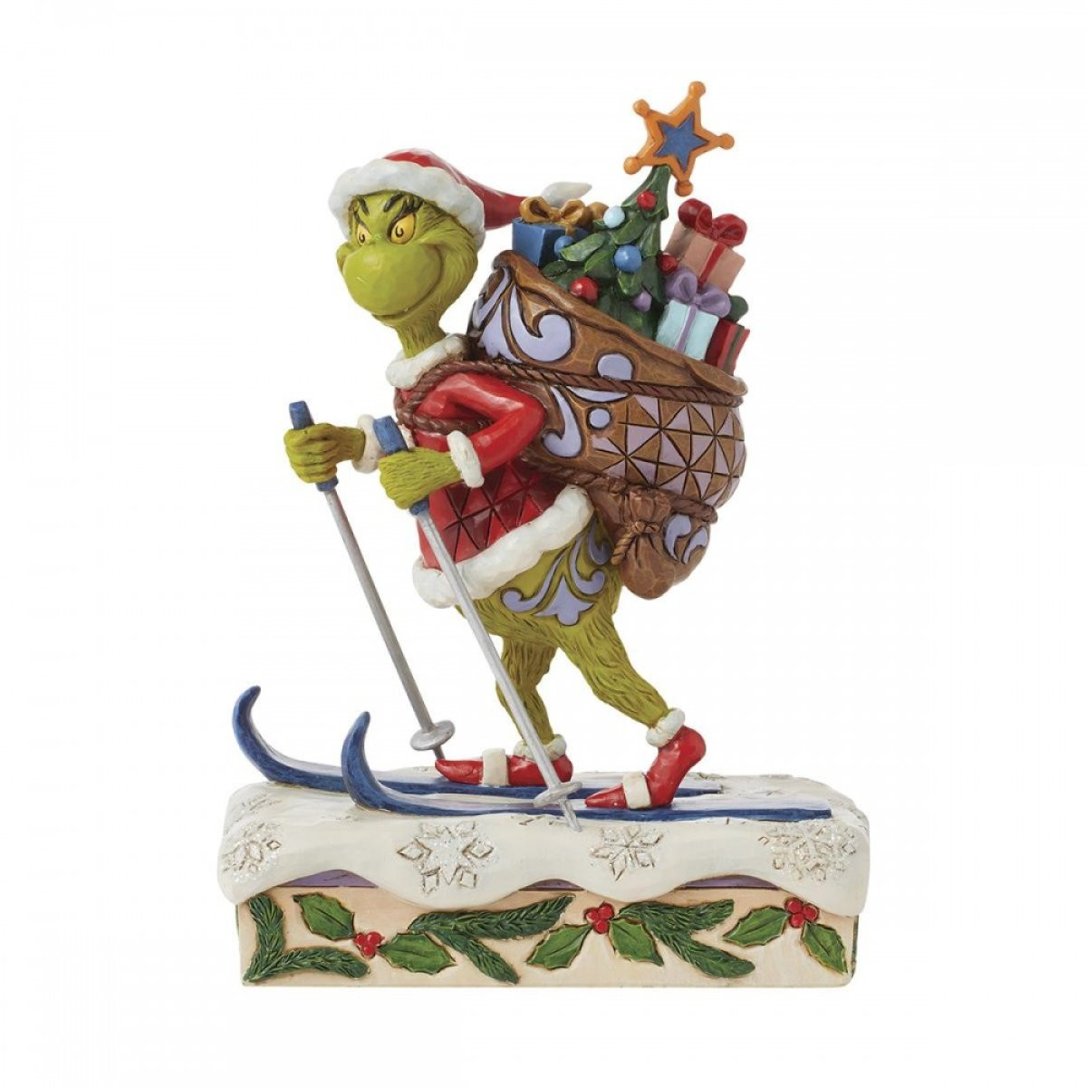 This figurine features the Grinch skiing through the snowy mountains with a heavy bag of gifts and a tree on his back. Dressed as Santa Claus, he is not going to deliver these gifts, but rather has just stolen them from the homes of every child in Chouville! From the Grinch Collection, designed by award-winning artist and sculptor Jim Shore. Each figurine is hand painted and slight color variations are expected, making each piece unique. Packaged in a gift box. These items are not children's toys. Intended for adults only.
